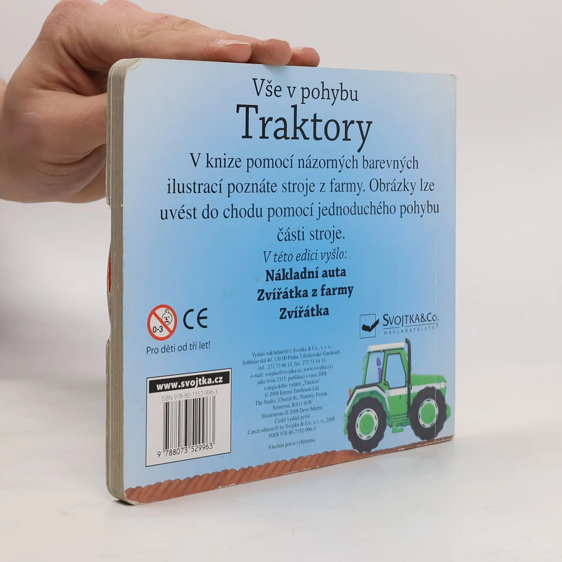 Toto leporelo je určeno pro nejmenší děti a pro jejich nenechavé prstíky. Obsahuje názorné, veselé, barevné obrázky traktorů. Některé prvky na obrázcích lze pomocí jednoduché manipulace "uvést do pohybu".