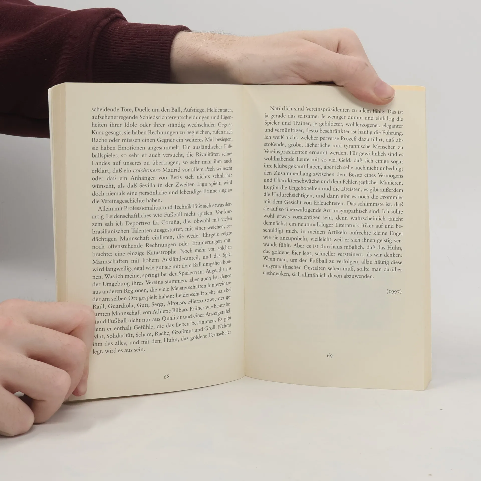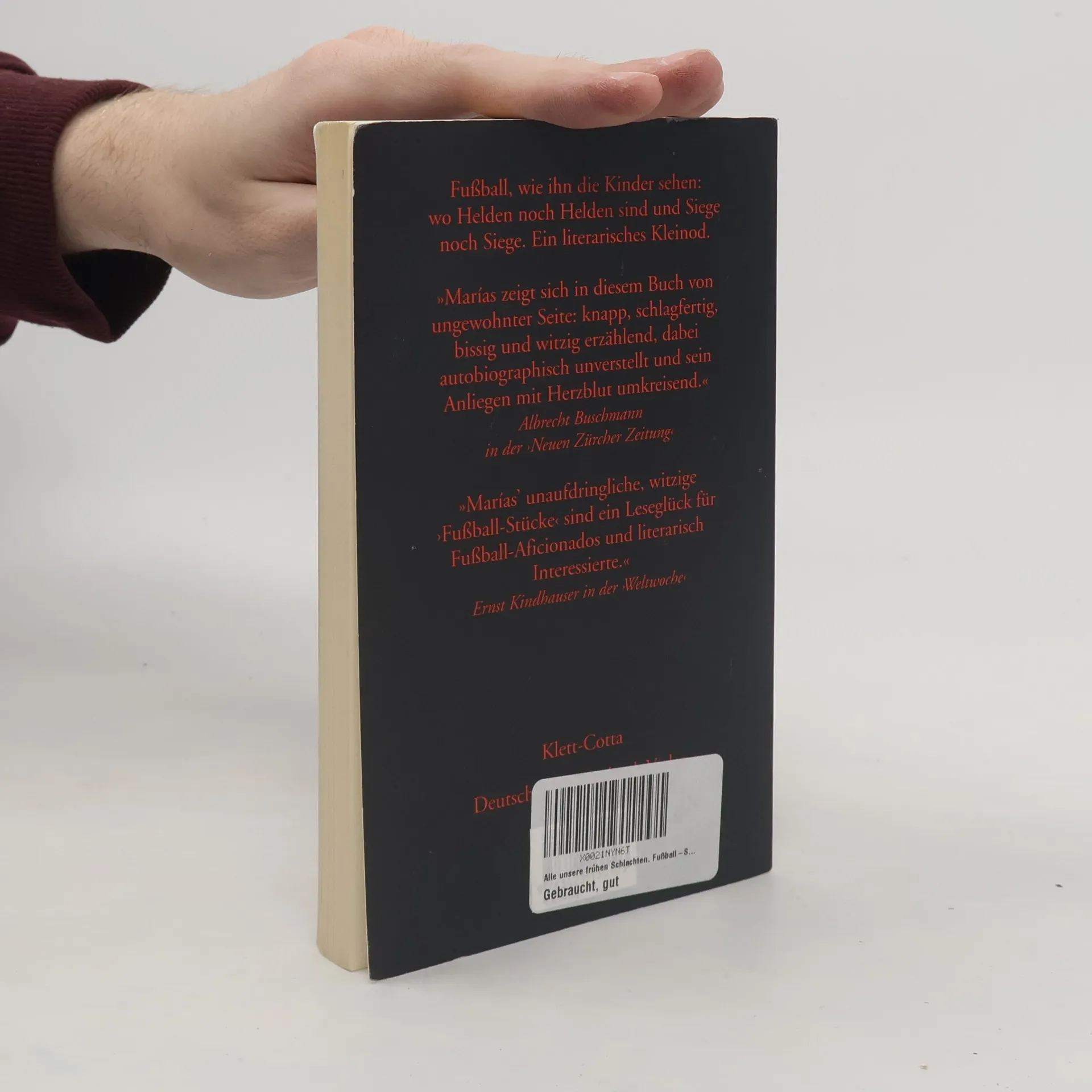 Faszinosum Fußball: Vieles, so Marías, wechselt man heutzutage, den Beruf, die Frau oder den Mann, die Automarke - aber nicht den Fußballverein. Javier Marías begeistert sich für Fußball, und Real Madrid ist sein Verein. Seit vielen Jahren schreibt der renommierte Schriftsteller für verschiedene Zeitungen Glossen und Essays zum Geschehen rund um den Ball. Nicht nur über die kickende Gesellschaft läßt er sich darin aus, vielmehr handeln sie von allem, was die menschliche Seele berührt: von Liebe und Leidenschaft, von Edelmut und Gerechtigkeit, von Neid, Mißgunst und euphorischer Siegeslaune. Der Marías-Leser erfährt hier womöglich mehr über die Leidenschaften des Autors als in jedem seiner Romane. 'Selbst wenn man kein tieferes Interesse für Fußball hegt, hat dieses Buch schon fast Offenbarungscharakter. Auch Nichtfußballfreunde verstehen plötzlich, warum das Geschehen auf dem Spielfeld und davor und danach und drum herum solche Gefühle freisetzt.' (Katharina Döbler in der ›Zeit‹) Für die erweiterte Taschenbuchausgabe wurden vier der Texte erstmals ins Deut-sche übersetzt, einer davon erscheint damit überhaupt zum ersten Mal in Buch-form. Illustriert ist der Band mit Fußballsammelbildchen aus dem Privatbesitz des Autors.