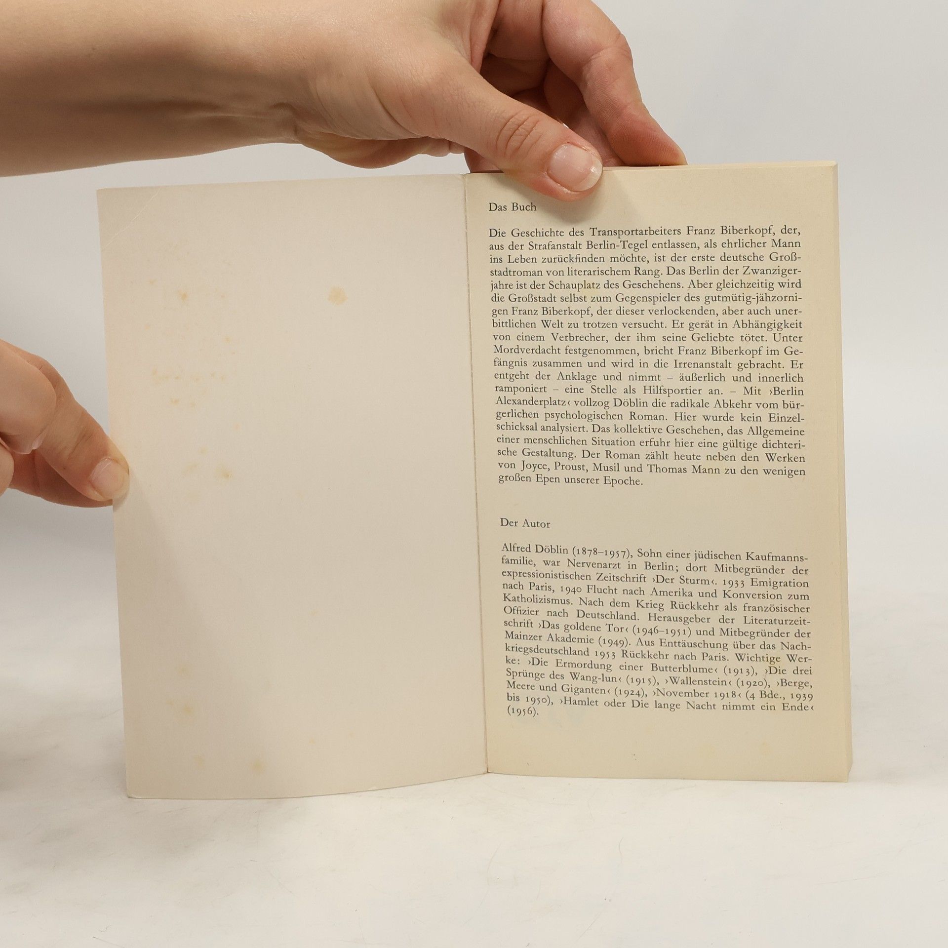 Biberkopf hat geschworen, er will anständig sein, und ihr habt gesehen, wie er wochenlang anständig ist, aber das war gewissermaßen nur eine Gnadenfrist. Das Leben findet das auf die Dauer zu fein und stellt ihm hinterlistig ein Bein. Die Geschichte des Transportarbeiters Franz Biberkopf, der, aus der Strafanstalt Berlin-Tegel entlassen, als ehrlicher Mann ins Leben zurückfinden möchte, ist der erste deutsche Großstadtroman von literarischem Rang. Das Berlin der Zwanziger Jahre ist der Schauplatz des Geschehens. Dabei wird die Großstadt selbst zum Gegenspieler des gutmütig-jähzornigen Franz Biberkopf, der dieser verlockenden, aber auch unerbittlichen Welt zu trotzen versucht. Mit Berlin Alexanderplatz vollzog Döblin die radikale Abkehr vom bürgerlich psychologischen Roman. Hier wurde kein Einzelschicksal analysiert. Das kollektive Geschehen, das Allgemeine einer menschlichen Situation erfuhr hier eine gültige dichterische Gestaltung. Der Roman zählt zu den großen Epen unserer Zeit.