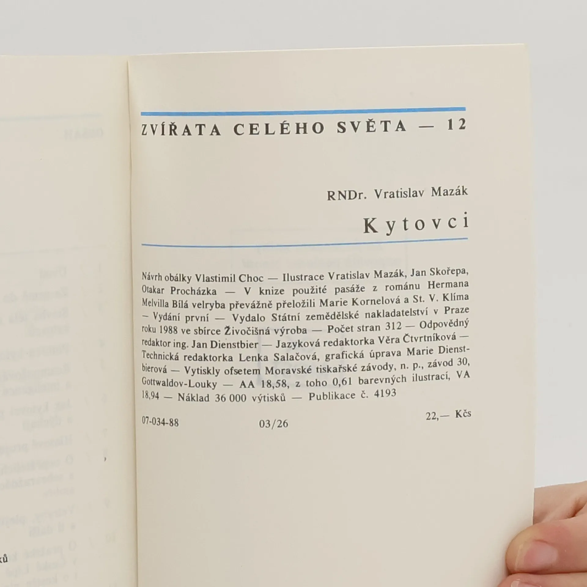 Základní informace o životě kytovců a výčet všech dnes žijících druhů včetně jejich vyobrazení. Obsahuje rovněž informace o velrybářství, skutečném Moby Dickovi, a kostech kytovců v československých muzejních sbírkách. Nejrozsáhlejší svazek edice, jak textově, tak obrazově, aby českému čtenáři poskytl poněkud hlubší pohled na tvory, které nemá možnost běžně vídat. Ilustrace autor, množství fotografií a archivních obrázků. 07-034-88