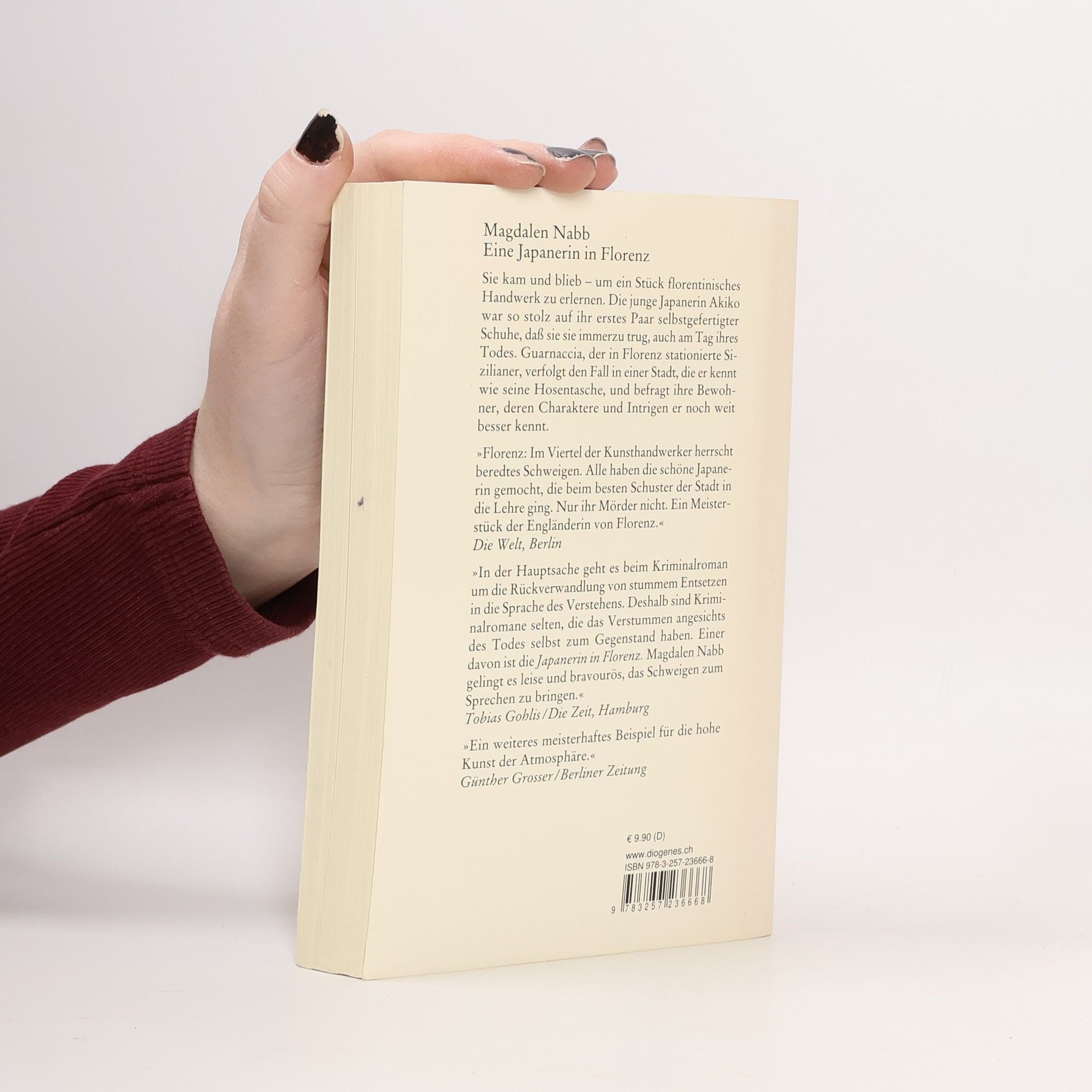 Sie kam und blieb um ein Stück florentinisches Handwerk zu erlernen. Die junge Japanerin Akiko war so stolz auf ihr erstes Paar selbstgefertigter Schuhe, daß sie es immerzu trug, auch am Tag ihres Todes. Guarnaccia, der in Florenz stationierte Sizilianer, verfolgt den Fall in einer Stadt, die er kennt wie seine Hosentasche, und befragt ihre Bewohner, deren Charaktere und Intrigen er noch weit besser kennt.