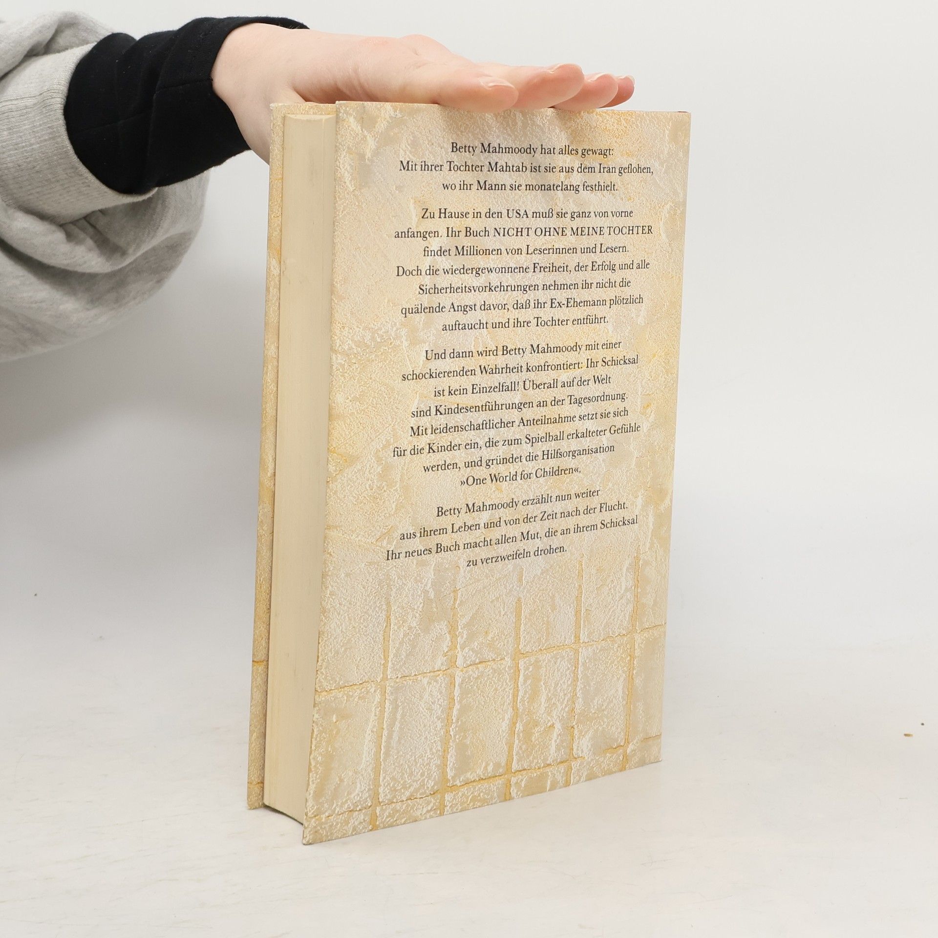 Millionen von Lesern aus der ganzen Welt haben Betty Mahmoodys authentischen Bericht über ihre dramatische Flucht aus dem Iran gelesen. Durch den großen Erfolg von Nicht ohne meine Tochter erfuhr Betty von vielen Frauen und auch Männern, die ein ähnliches Schicksal haben und verzweifelt um ihre Kinder kämpfen. Mit leidenschaflticher Anteilnahme begann sie, sich für diese Eltern und Kinder einzusetzen, und gründete aus eigenen Mitteln die Hilfsorganisation „One World for Children“.
