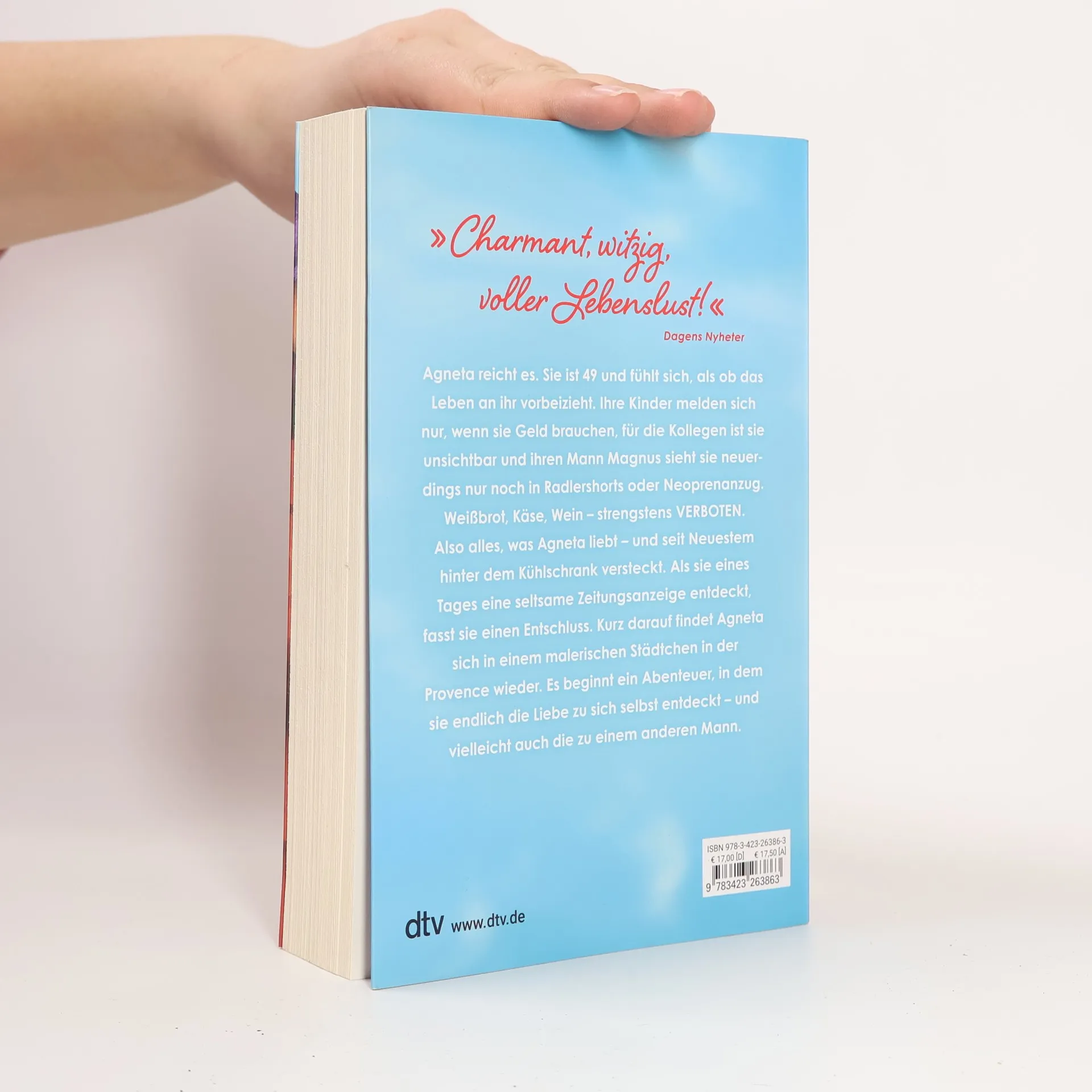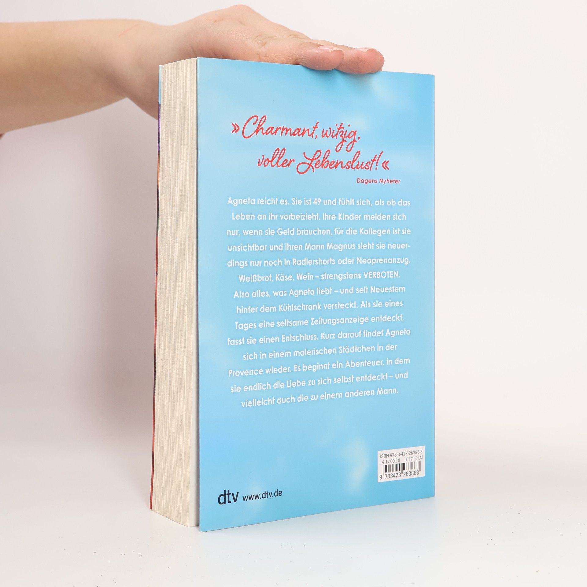 Agneta entdeckt die bunten Farben des Lebens Agneta reicht es. Sie ist 49 und fühlt sich, als ob das Leben an ihr vorbeizieht. Ihre Kinder melden sich nur, wenn sie Geld brauchen, für die Kollegen ist sie unsichtbar und ihren Mann Magnus sieht sie neuerdings nur noch in Radlershorts oder Neoprenanzug. Weißbrot, Käse, Wein – strengstens VERBOTEN. Also alles, was Agneta liebt – und seit Neuestem hinter dem Kühlschrank versteckt. Wenn man sich einfach ins Leben fallen lässt: Emma Hamberg gelingt ein leichtes Buch über eine Heldin, die sich neu erfindet. Als sie eines Tages eine seltsame Zeitungsanzeige entdeckt, fasst sie einen Entschluss. Kurz darauf findet Agneta sich in einem malerischen Städtchen in der Provence wieder. Es beginnt ein Abenteuer, in dem sie endlich die Liebe zu sich selbst entdeckt – und vielleicht auch die zu einem anderen Mann. »Bissig, witzig, voller Lebenslust: Agneta muss man einfach lieben!« Femina