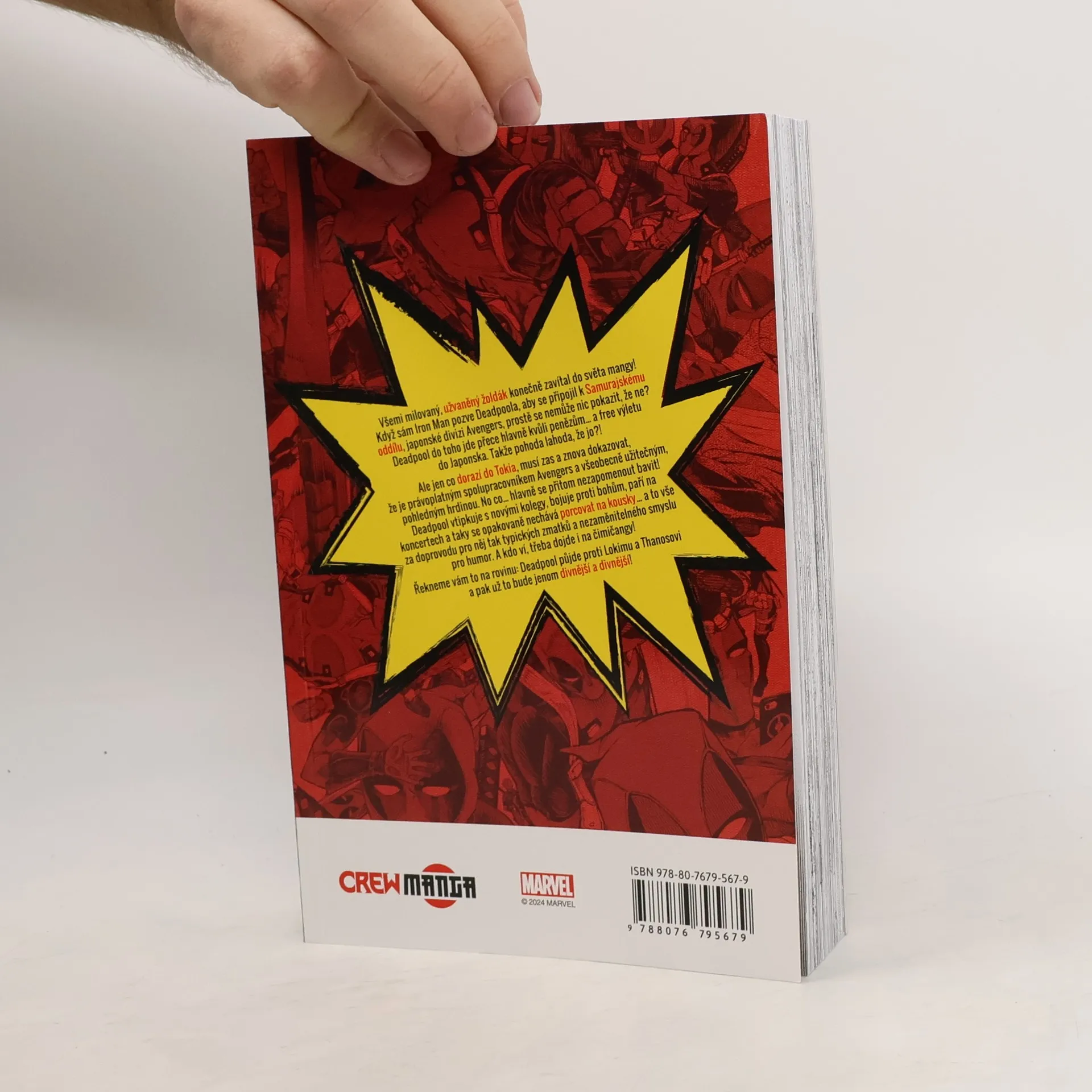 Všemi milovaný, užvaněný žoldák konečně zavítal do mangy! Když sám Iron Man pozve Deadpoola, aby se připojil k Samurajskému oddílu, japonské divizi Avengers, prostě se nemůže nic pokazit. Deadpool do toho jde přece hlavně kvůli penězům... a výletu do Japonska. Bude to v pohodě, že jo? Jen co dorazí do Tokia, hrnou se na něj příležitosti dokázat, že je právoplatný spolupracovník Avengers a všeobecně užitečný a pohledný hrdina. Ale hlavně se nezapomíná bavit! Vtipkuje s novými kolegy, bojuje proti bohům, paří na koncertech a taky se opakovaně nechává porcovat na kousky... to vše v doprovodu nezaměnitelných zmatků a jemu vlastnímu smyslu pro humor. A kdoví, třeba taky zkusí uvařit čimičangy! Řekneme vám to prostě na rovinu: Deadpool půjde proti Lokimu a Thanosovi a pak už to bude jenom divnější a divnější!