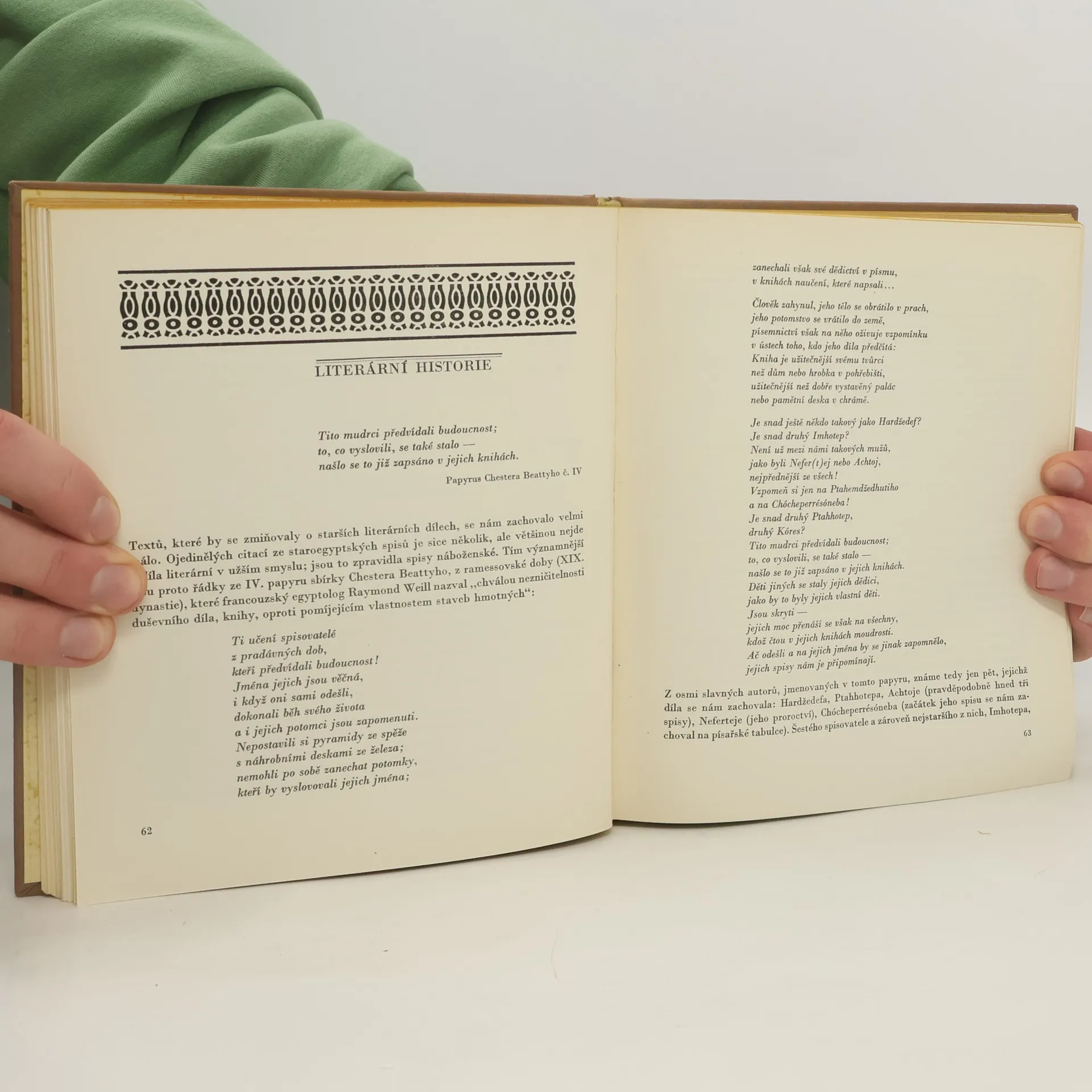Známý egyptolog provází čtenáře literaturou starého Egypta. Jsou zde obsaženy i morální črty, životopisy, cestopisy, pohádky, poezie i náboženská literatura. 25-055-68