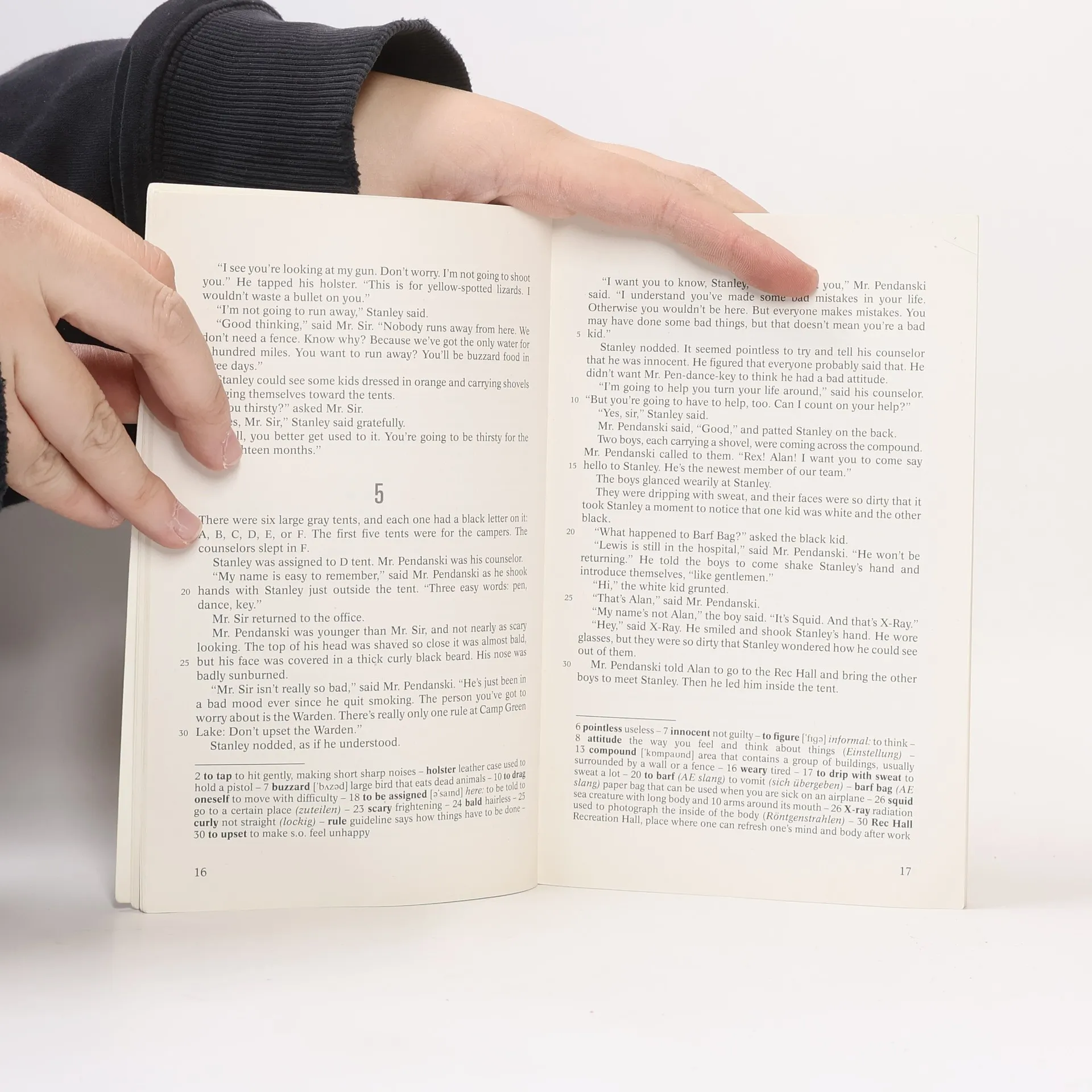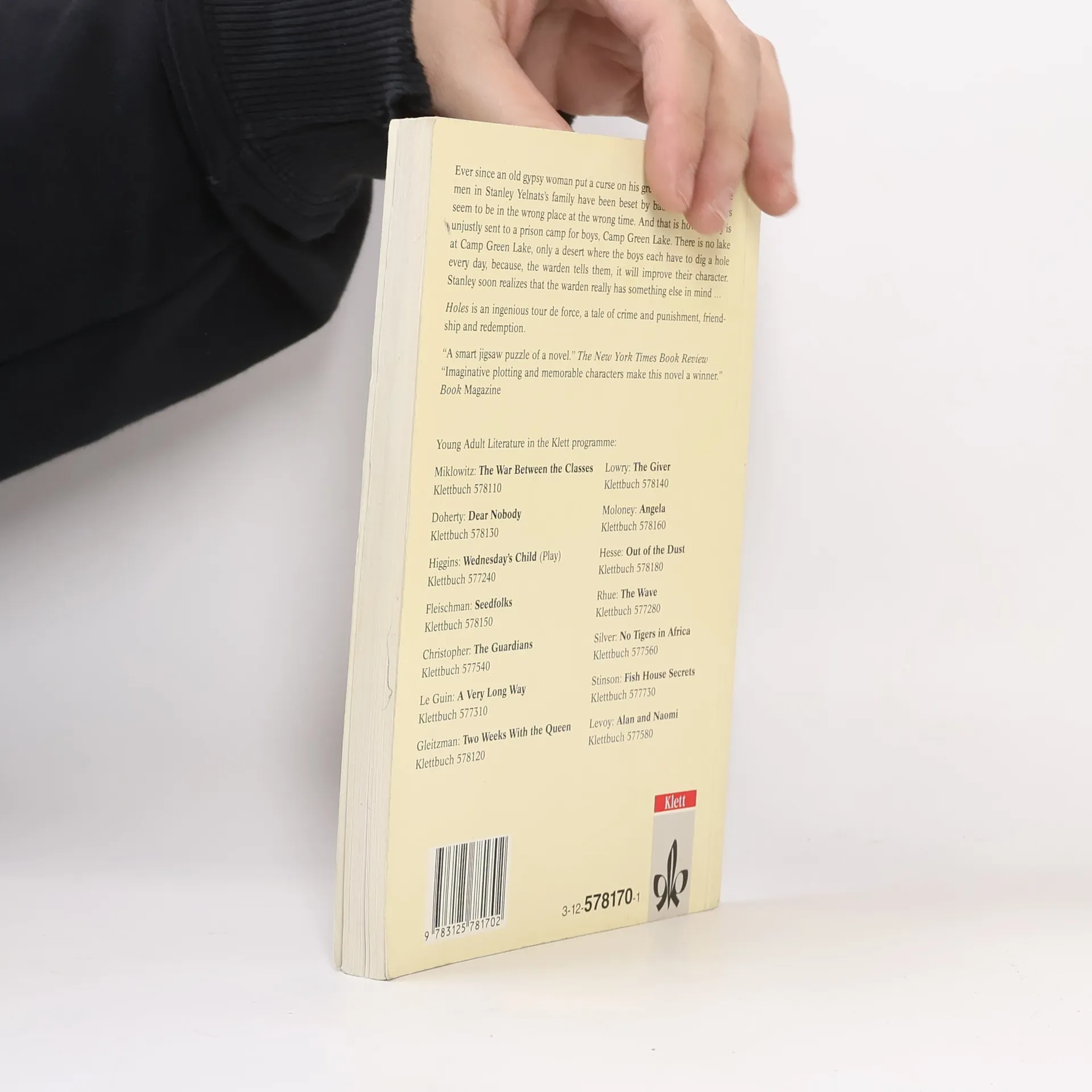 Stanley Yelnats lebt unter einem Fluch, der seit seinem Urgroßvater auf der Familie lastet: er ist zur falschen Zeit am falschen Ort. So ist es auch nicht verwunderlich, dass er in ein Lager für jugendliche Straftäter geschickt wird, obwohl er unschuldig ist. Camp Green Lake heißt das Lager, doch einen See hat es dort seit über 100 Jahren nicht mehr gegeben. Jeden Tag müssen die Jungen ein Loch von 1,50 m Tiefe in den Boden des ehemaligen Sees graben - das soll angeblich Charaktertraining sein. Schon bald merkt Stanley, dass es der Lagerverwalterin nicht um Charaktertraining geht. Eine surrealistische Märchenwelt und harten Realismus vereint der Autor in diesem faszinierenden Werk, in dem auch Freundschaft und menschliche Solidarität ihren Platz haben. Abiturempfehlung zu den Themenbereichen Crime und Growing up
