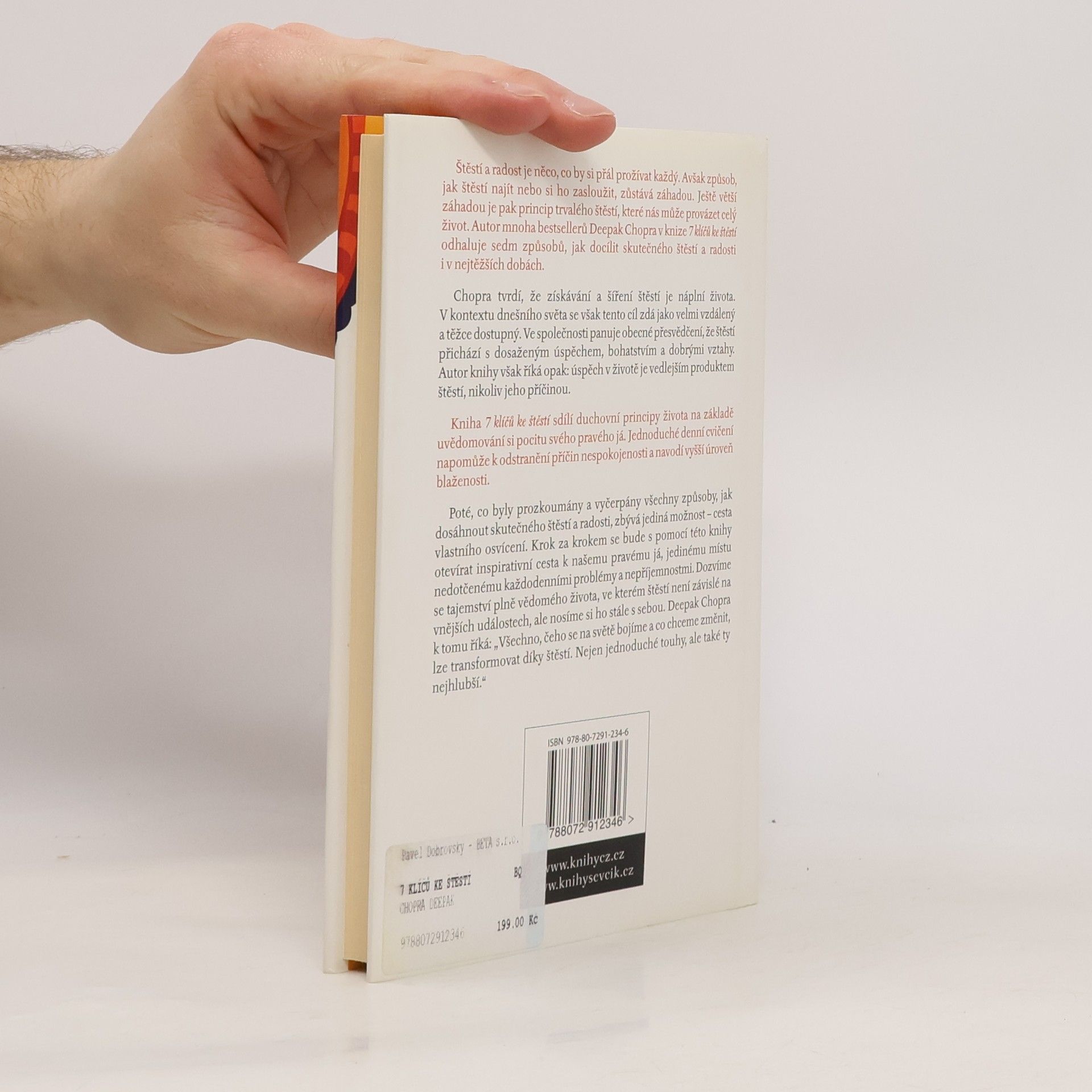 Každý člověk chce být šťastný, a přesto je cesta ke štěstí velkou záhadou, kterou se lidstvo snaží vyřešit od počátku své existence. A tím největším tajemstvím je klíč k dokonalému a trvalému štěstí, které nám nikdy nikdo nevezme. Deepak Chopra, jenž je autorem mnoha bestsellerů, nabízí takových klíčů hned sedm, protože říká, že v dnešní náročné době je třeba změnit mnoho přístupů k životu ve společnosti, jež klade velký důraz na úspěch, bohatství, slávu a soutěživost. Chopra tvrdí, že opak je pravdou, protože všechny životní úspěchy jsou pouhé důsledky, nikoli příčiny dokonalého štěstí. Postupně předkládá jednotlivé klíče: vztah k vlastnímu tělu, sebeúcta, pročištění života, skromnost, zaměření na přítomnost, vnímání vnitřního světa a žití v osvícení. Chopra vystudoval medicínu a jako správný lékař sestavil recept, který člověka postupně a velmi snadno vede z jedné úrovně na druhou a pomocí dobrých rad a mnoha praktických cvičení dospěje až na tu nejvyšší, k osvícení. Je to recept, který od základů změní váš život a odhalí vám tajemství dokonalého a trvalého štěstí.