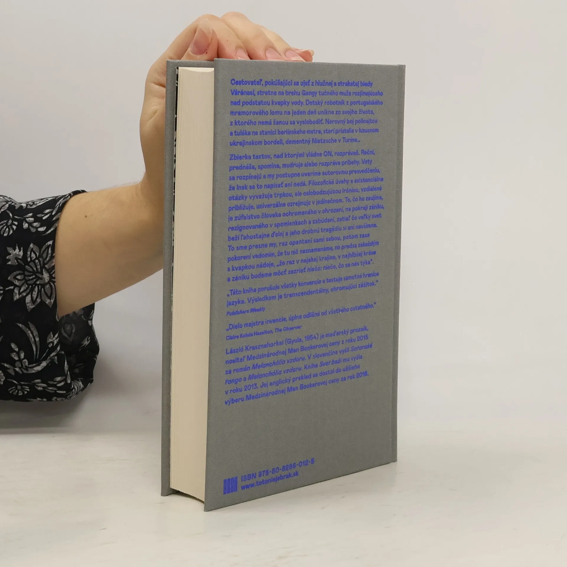 Cestovateľ, pokúšajúci sa ujsť z hlučnej a strakatej biedy Váránasí, stretne na brehu Gangy tučného muža rozjímajúceho nad podstatou kvapky vody. Detský robotník z portugalského mramorového lomu na jeden deň unikne zo svojho života, z ktorého nemá šancu sa vyslobodiť. Opitý tlmočník v útrobách šanghajskej obrej križovatky pochopí vlastnú túžbu aspoň raz uvidieť vodopád. Psychiatrický pacient snuje konšpiračnú teóriu o Gagarinovi, ktorý uvidel, že raj je na zemi. Maliar verí, že v ženskom dekolte sa skrýva jeho milovaný rodný kraj. Nerovný boj policajtov a tuláka na stanici berlínskeho metra, starí priatelia v luxusnom ukrajinskom bordeli, dementný Nietzsche v Turíne... Zbierka textov, nad ktorými vládne ON, rozprávač. Reční, prednáša, spomína, mudruje alebo rozpráva príbehy, a kým nás napokon zanechá s krátkou poetickou rozlúčkou, venuje nám text, ktorý nevidíme. Vety sa rozpínajú a my postupne uveríme autorovmu presvedčeniu, že inak sa to napísať ani nedá. Filozofické úvahy a existenciálne otázky vyvažuje trpkou, ale oslobodzujúcou iróniou, vzdialené približuje, univerzálne ozrejmuje v jedinečnom. To, čo ho zaujíma, je zúfalstvo človeka ochromeného v ohrození, na pokraji zániku, rezignovaného v spomienkach a zabúdaní, zatiaľ čo veľký svet beží ľahostajne ďalej a jeho drobnú tragédiu si ani nevšimne. To sme presne my, raz opantaní sami sebou, potom zasa pokorení vedomím, že tu nič neznamenáme, no predsa zakaždým s kvapkou nádeje, „že raz v nejakej krajine, v najhlbšej kráse a zániku budeme môcť zazrieť niečo: niečo, čo sa nás týka“. „Táto kniha porušuje všetky konvencie a testuje samotné hranice jazyka. Výsledkom je transcendentálny, ohromujúci zážitok.“ Publishers Weekly „Dielo majstra invencie, úplne odlišné od všetkého ostatného.“ Claire Kohda Hazelton, The Observer László Krasznahorkai (Gyula, 1954) je maďarský prozaik, nositeľ Medzinárodnej Man Bookerovej ceny z roku 2015 za román Melanchólia vzdoru a ocenenia National Book Award v kategórii prekladovej literatúry za román Barón Wenckheim sa vracia domov z roku 2019. V slovenčine vyšli Satanské tango a Melanchólia vzdoru. Kniha Svet beží mu vyšla v roku 2013. Jej anglický preklad sa dostal do užšieho výberu Medzinárodnej Man Bookerovej ceny za rok 2018.