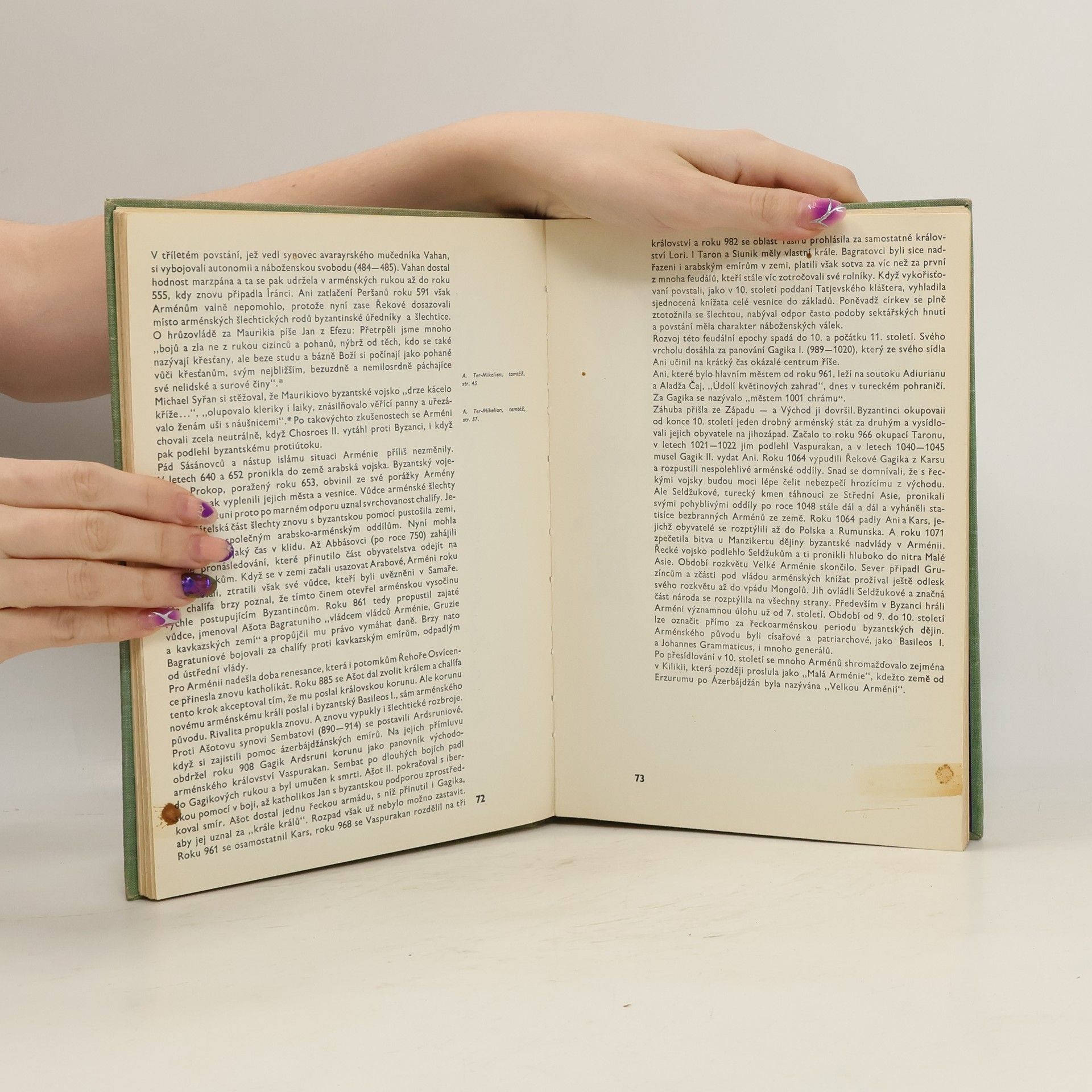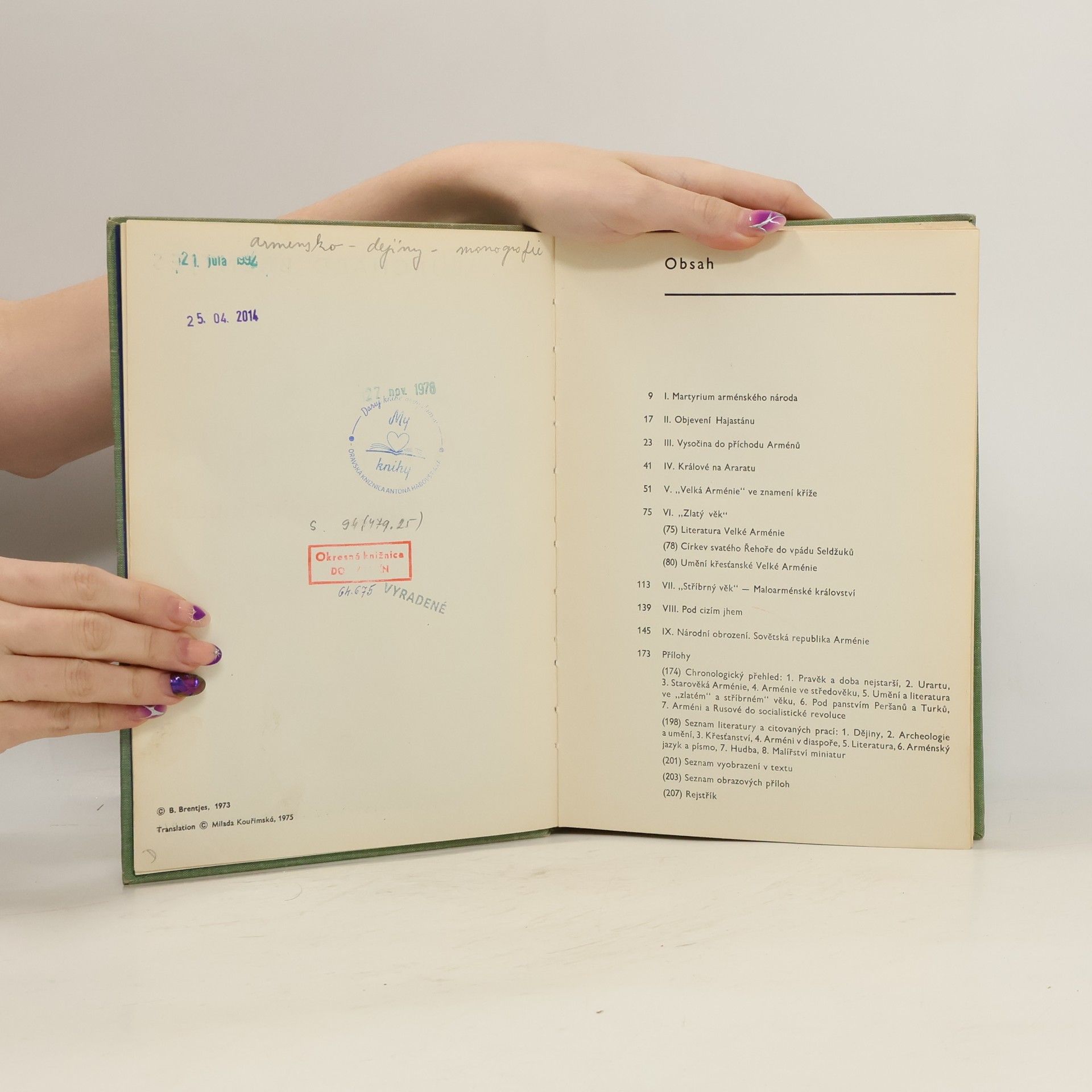 Četné obrazové přílohy, jež dokumentují vyspělou kulturu Arménie, doplňují výklad o minulosti těžce zkoušeného arménského lidu a jeho zápasu o zachování národní existence. Autor se zmiňuje o pravěkém osídlení země, oslavném urartském státu, zachycuje dějinný vývoj Arménie ve starověku a středověku, její bohatou literaturu a umění. Líčí pustošivé nájezdy cizích vojsk, vyvražďování Arménů v letech 1915-1916 a ukazuje, co pro Arménii znamenalo vítězství sovětské moci.