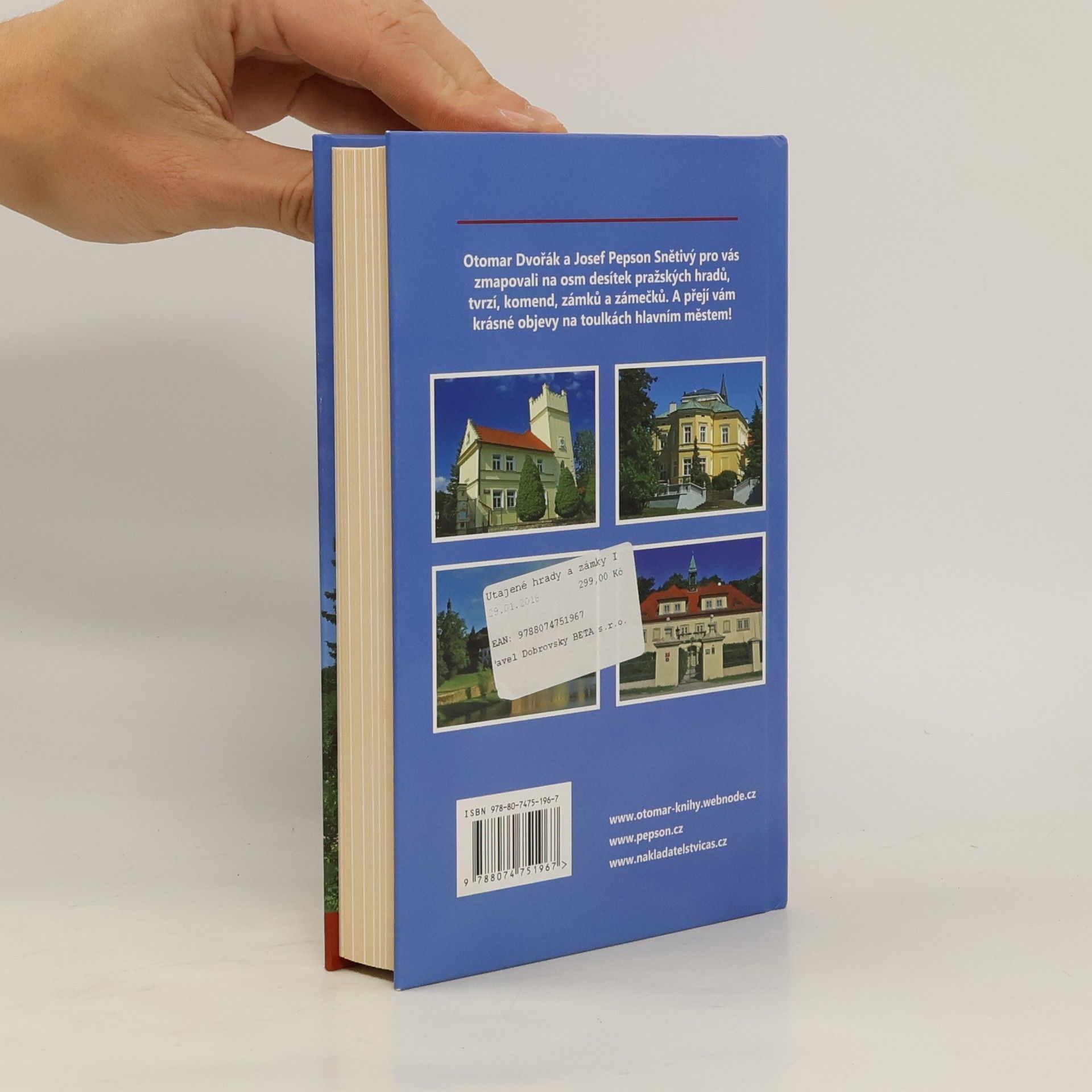 Zkušení spisovatelé a cestovatelé Otomar Dvořák a Josef Pepson Snětivý vás už podruhé společně zvou na cestu. Tentokrát (až na výjimky) „jen“ na území hlavního města Prahy, jež je zdánlivě dopodrobna prozkoumané a popsané. Oba Prahu milují, pobývají v ní a dlouhodobě se její historií a památkami zabývají – a přesto i je překvapilo, kolik toho v tomto ohledu ještě nabízí… a skrývá. Zmapovali pro vás téměř osm desítek tvrzí, hradů, komend, zámků a zámečků. Několik málo jich bohužel mohli pouze nastínit, a zbytek už je na vaší fantazii, neboť se jedná o sídla, po nichž nezůstal žádný hmatatelný pozůstatek. Většinu však (mnohdy opakovaně) navštívili, propátrali a vyfotografovali, hledali v literatuře i archivech, ptali se místních… a občas nalezli netušené souvislosti, odkryli nepatrné zbytky nebo zůstali v údivu stát před nenápadným půvabem místa, které – stejně jako většina lidí – léta míjeli bez povšimnutí… Autoři záměrně opominuli jen Pražský hrad a Vyšehrad coby místa dostatečně popsaná v jiných publikacích. A budou velmi rádi, pokud s touto knihou (či jen s informacemi z ní vyčtenými ve vaší paměti) vyrazíte do ulic naší metropole. Odměnou vám budou nečekané nálezy a nezapomenutelné momenty. Kniha Utajené hrady a zámky I. je druhým svazkem nové Edice Skrytá krása naší země.