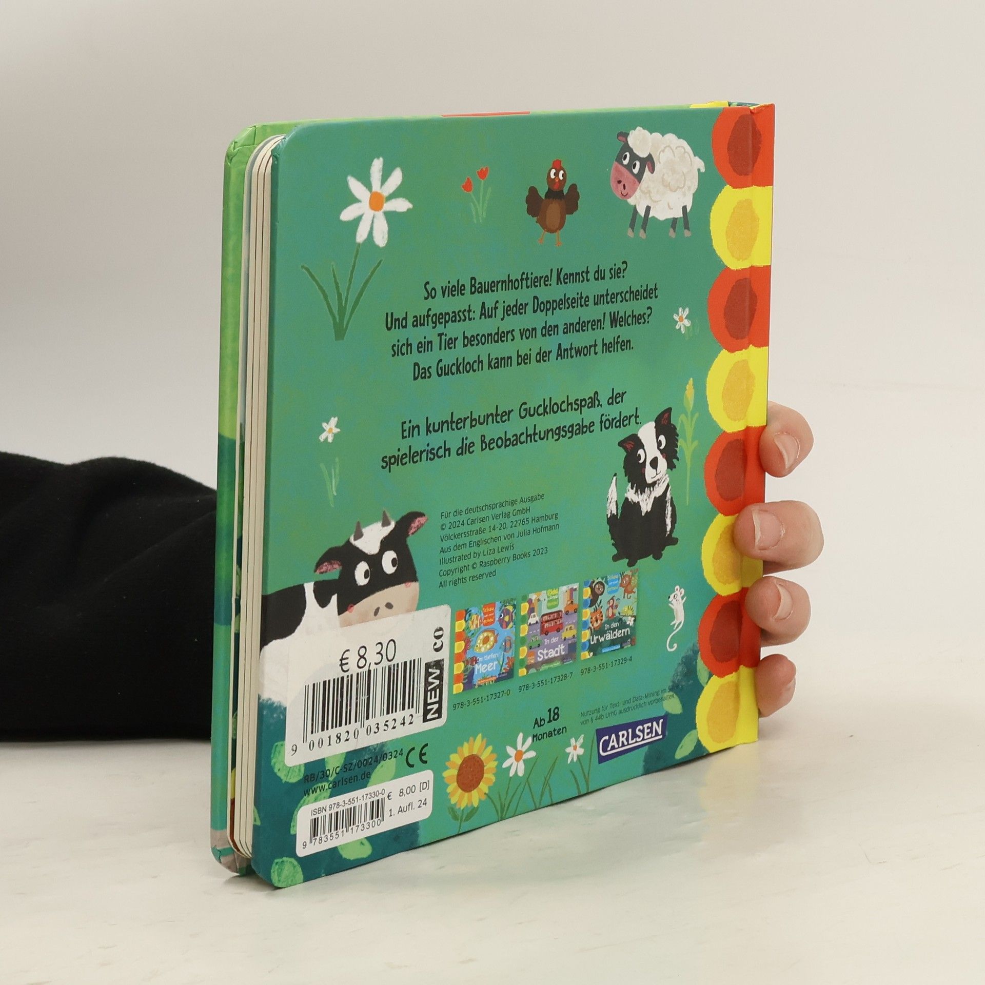 Gucklochspaß zu Top-Thema Bauernhof für Kinder ab 18 Monaten Fördert spielerisch die Beobachtungsgabe Kurze Vorlesetexte animieren zum Suchen und Entdecken So viele Bauernhoftiere! Ob Schafe, Kühe oder Schweine, ob Hund, Katze oder Pfede – hier können Kinder einiges entdecken. Und aufgepasst: Auf jeder Doppelseite unterscheidet sich ein Tier besonders von den anderen! Da heißt es für die Kleinen: Schau, was passt genau? Das Guckloch kann bei der Antwort helfen.