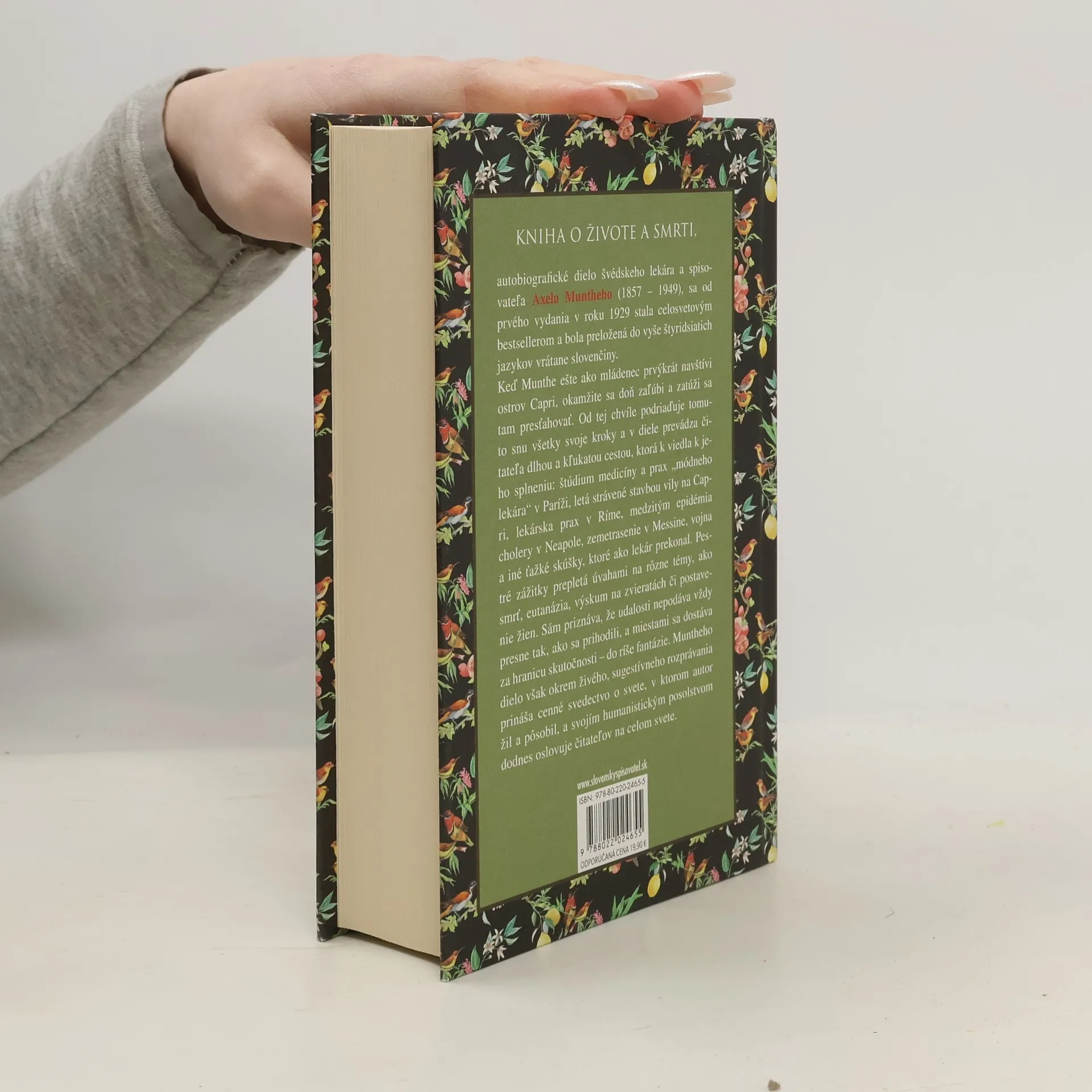 Kniha o živote a smrti je zbierkou autobiografických príbehov švédskeho lekára a spisovateľa Axela Muntheho (1857 – 1949), ktorá sa od prvého vydania v roku 1929 stala celosvetovým bestsellerom. Obsahuje rôzne, nie vždy chronologicky usporiadané epizódy z autorovho dobrodružného života. Po prvej návšteve ostrova Capri sa doň zamiluje a túži sa tam presťahovať. Pri kaplnke San Michele uzavrie faustovskú dohodu s tajomným mužom, ktorá má zaručiť splnenie jeho sna. Od tej chvíle podriadi všetky svoje kroky tomuto cieľu, pričom čitateľa prevedie svojou cestou: štúdiom medicíny v Paríži, stavbou vily na Capri, lekárskou praxou v Ríme, a prekonávaním ťažkých skúšok ako epidémia cholery či vojna. Pestré zážitky sú prepletené úvahami o smrti, eutanázii, výskume na zvieratách a postavení žien. Približuje rušné roky vo veľkomeste, kde liečil šľachticov aj bedárov, a pokojný život na milovanom ostrove, ktorého jasné svetlo sa mu napokon stalo osudným. Munthe priznáva, že nie vždy podáva udalosti presne, aby vyzneli pôsobivejšie, a niektoré časti vynecháva, pričom sa občas dostáva do ríše fantázie. Dielo ponúka svedectvo o jeho zaujímavých životných peripetiách a o aspektoch vtedajšej spoločnosti. Prekladateľka: Lenka Cinková.