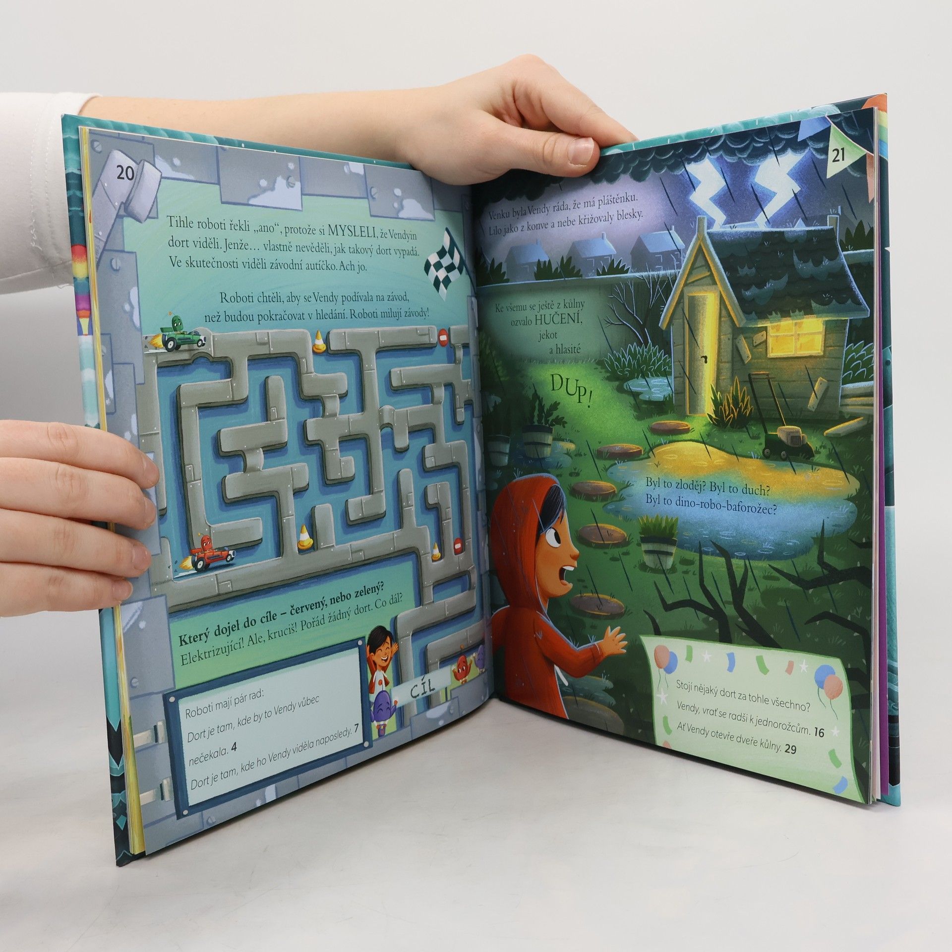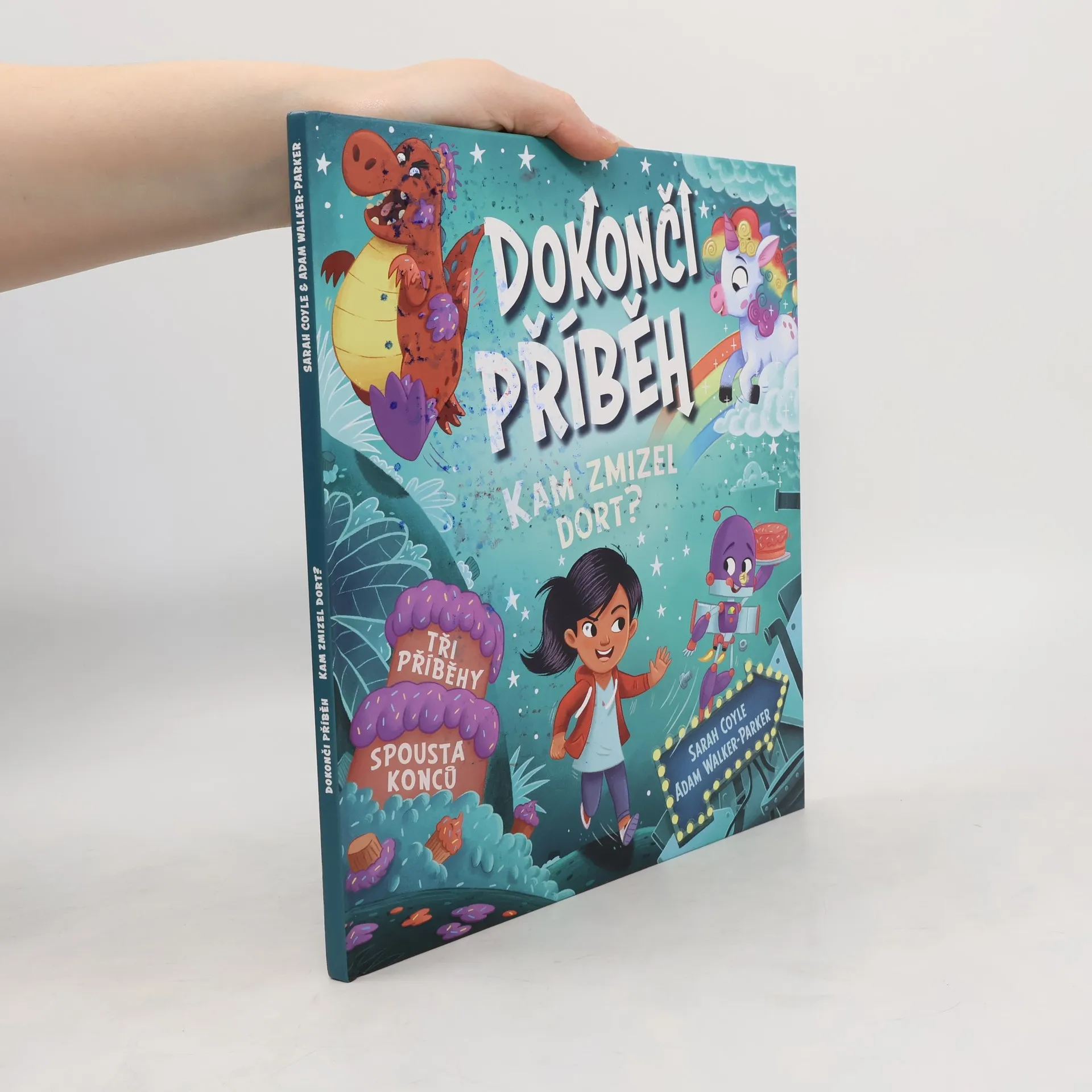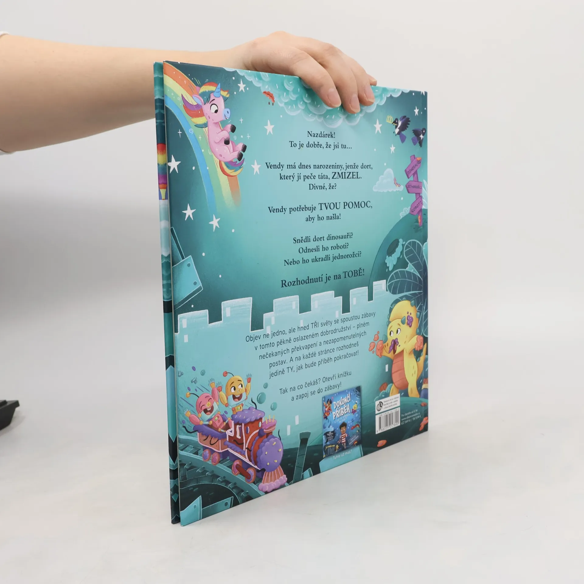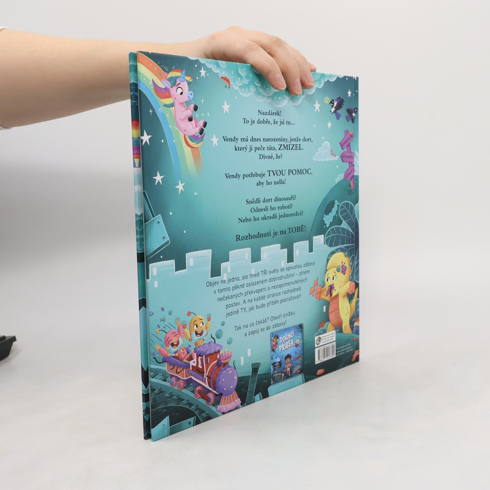 Vendy má dnes narozeniny, jenže dort, který jí peče táta, ZMIZEL. Divné, že? Vendy potřebuje TVOU POMOC, aby ho našla! Snědli dort dinosauři? Odnesli ho roboti? Nebo ho ukradli jednorožci? Objev ne jedno, ale hned TŘI světy se spoustou zábavy v tomto pěkně oslazeném dobrodružství – plném nečekaných překvapení a nezapomenutelných postav. A na každé stránce rozhodneš jedině TY, jak bude příběh pokračovat!