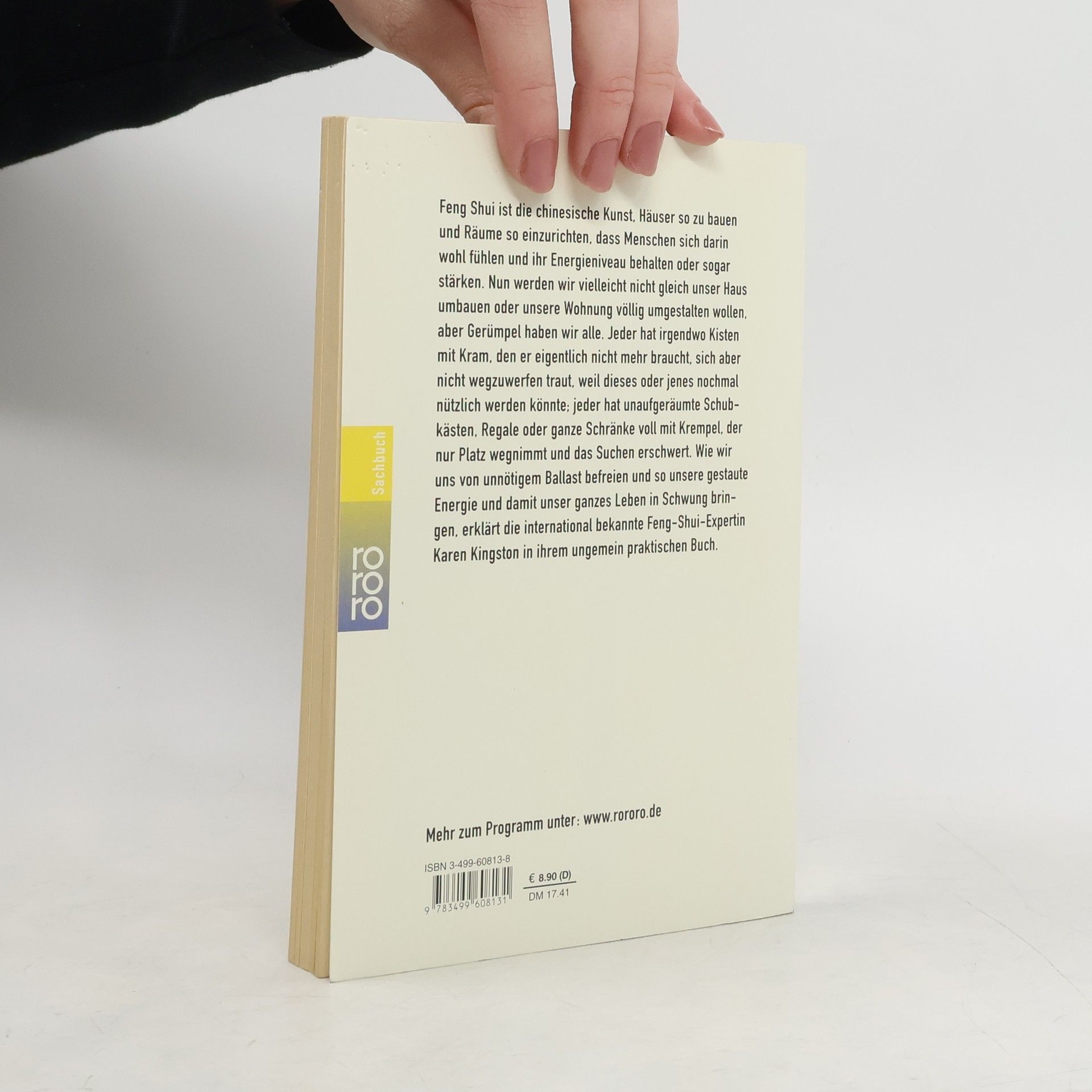 Feng Shui ist die chinesische Kunst, Häuser so zu bauen und Räume so einzurichten, dass Menchen sich darin wohl fühlen und ihr Energieniveau behalten oder sogar stärken. Nun werden wir vielleicht nicht gleich unser Haus umbauen oder unsere Wohnung völlig umgestalten wollen, aber Gerümpel haben wir alle. Jeder hat irgendwo Kisten mit Kram, den er eigentlich nicht mehr braucht, sich aber nicht wegzuwerfen traut, weil dieses oder jenes nochmal nützlich werden könnte; jeder hat unaufgeräumte Schubkästen, Regale oder ganze Schränke voll mit Krempel, der nur Platz wegnimmt und das Suchen erschwert. Wie wir uns von unnötigem Ballast befreien und so unsere gestaute Energie und damit unser ganzes Leben in Schwung bringen, erklärt die international bekannte Feng-Shui-Expertin Karen Kingston in ihrem ungemein praktischen Buch.