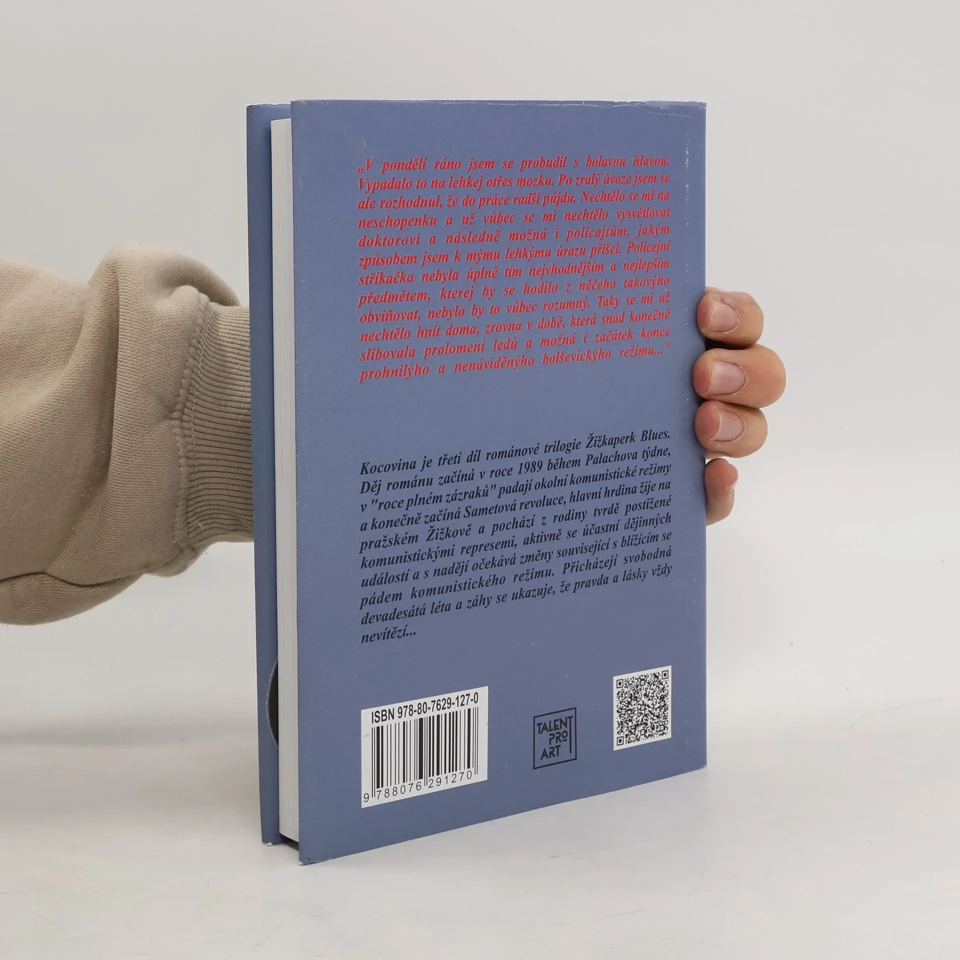Kocovina je třetí díl románové trilogie Žižkaperk Blues. Děj románu začíná v roce 1989 během Palachova týdne, v roce plném zázraků padají okolní komunistické režimy a konečně začíná Sametová revoluce, hlavní hrdina žije na pražském Žižkově a pochází z rodiny tvrdě postižené komunistickými represemi, aktivně se účastní dějinných událostí a s nadějí očekává změny související s blížícím se pádem komunistického režimu. Přicházejí svobodná devadesátá léta a záhy se ukazuje, že pravda a lásky vždy nevítězí... V pondělí ráno jsem se probudil s bolavou hlavou. Vypadalo to na lehkej otřes mozku. Po zralý úvaze jsem se ale rozhodnul, že do práce radši půjdu. Nechtělo se mi na neschopenku a už vůbec se mi nechtělo vysvětlovat doktorovi a následně možná i policajtům, jakým způsobem jsem k mýmu lehkýmu úrazu přišel. Policejní stříkačka nebyla úplně tím nejvhodnějším a nejlepším předmětem, kterej by se hodilo z něčeho takovýho obviňovat, nebylo by to vůbec rozumný. Taky se mi už nechtělo hnít doma, zrovna v době, která snad konečně slibovala prolomení ledů a možná i začátek konce prohnilýho a nenáviděnýho bolševickýho režimu.