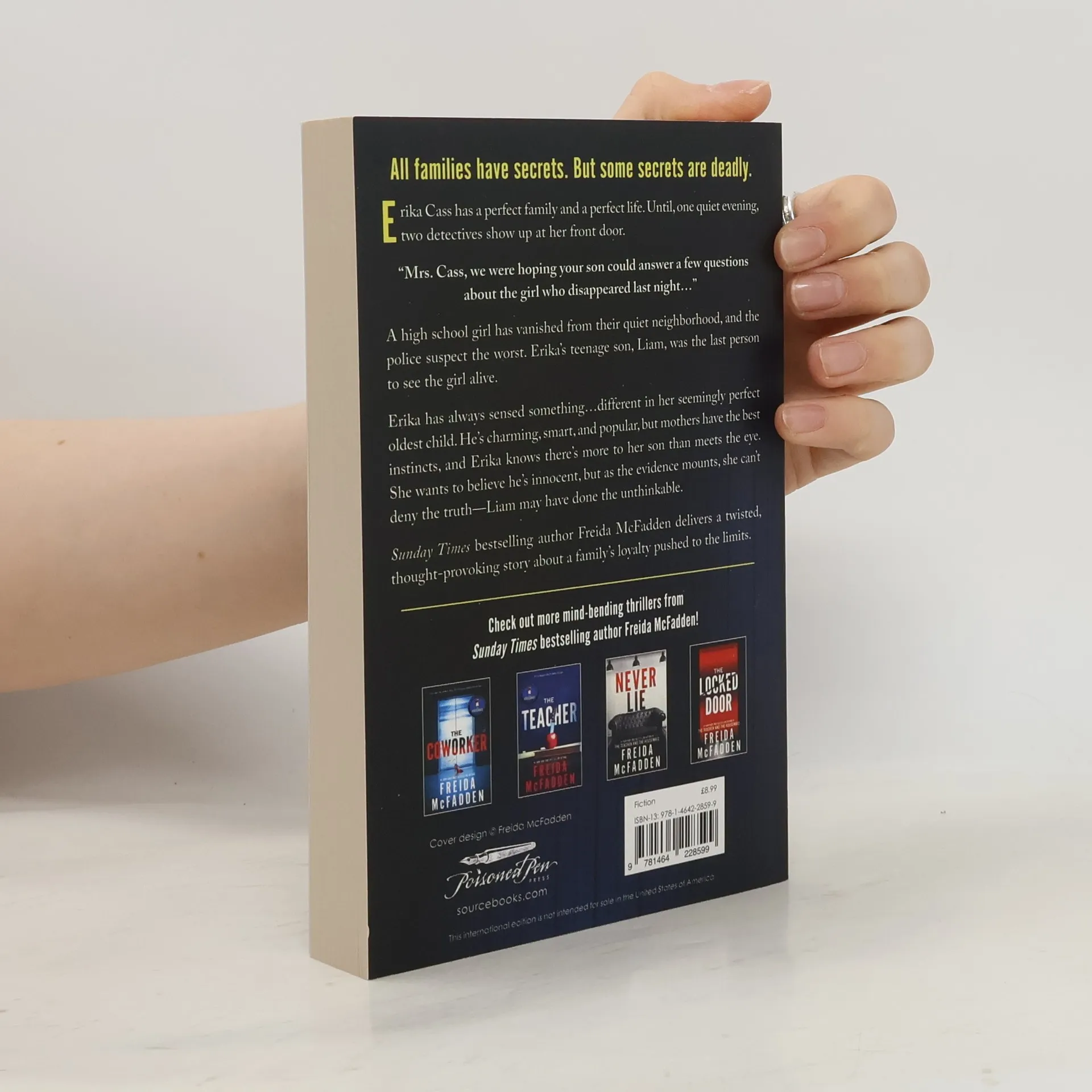 From Sunday Times bestselling author Freida McFadden comes a dark and twisting psychological thriller about a mother who suspects her son of committing a terrible crime... But how far will she go to protect her family? All families have secrets. But some secrets are deadly.Erika Cass has a perfect family and a perfect life. Until, one quiet evening, two detectives show up at her front door.Mrs. Cass, we were hoping your son could answer a few questions about the girl who disappeared last night...A high school girl has vanished from their quiet neighbourhood, and the police suspect the worst. Erika's teenage son, Liam, was the last person to see the girl alive.Erika has always sensed something... different in her seemingly perfect oldest child. He's charming, smart and popular, but mothers have the best instincts. Erika knows there's more to her son than meets the eye. She wants to believe he's innocent, but as the evidence mounts, she can't deny the truth?Liam may have done the unthinkable.With The Perfect Son, bestselling author Freida McFadden delivers a twisted, thought-provoking crime thriller about a family's loyalty pushed to the limits.