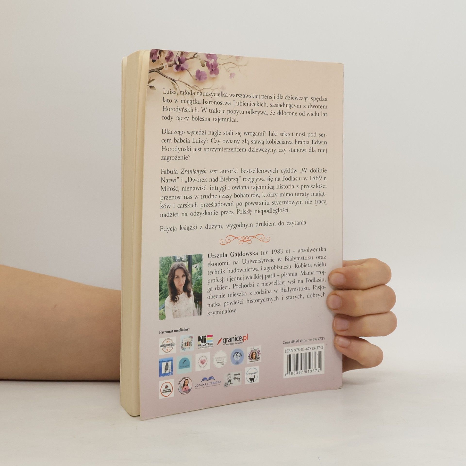 Luiza, młoda nauczycielka warszawskiej pensji dla dziewcząt, spędza lato w majątku baronostwa Lubienieckich, sąsiadującym z dworem Horodyńskich. W trakcie pobytu odkrywa, że skłócone od wielu lat rody łączy bolesna tajemnica. Dlaczego sąsiedzi nagle stali się wrogami? Jaki sekret nosi pod sercem babcia Luizy? Czy owiany złą sławą kobieciarza hrabia Edwin Horodyński jest sprzymierzeńcem dziewczyny, czy stanowi dla niej zagrożenie? Fabuła Zranionych serc autorki bestsellerowych cyklów „W dolinie Narwi” i „Dworek nad Biebrzą” rozgrywa się na Podlasiu w 1869 r. Miłość, nienawiść, intrygi i owiana tajemnicą historia z przeszłości przenosi nas w trudne czasy bohaterów, którzy mimo utraty majątków i carskich prześladowań po powstaniu styczniowym nie tracą nadziei na odzyskanie przez Polskę niepodległości. Edycja książki z dużym, wygodnym drukiem do czytania.