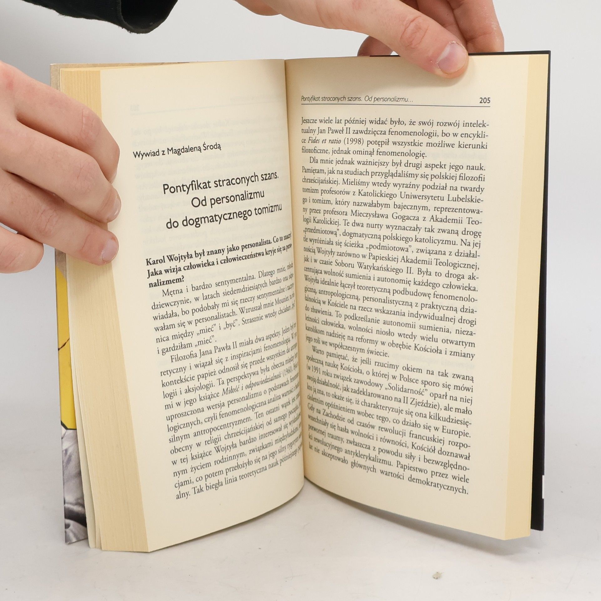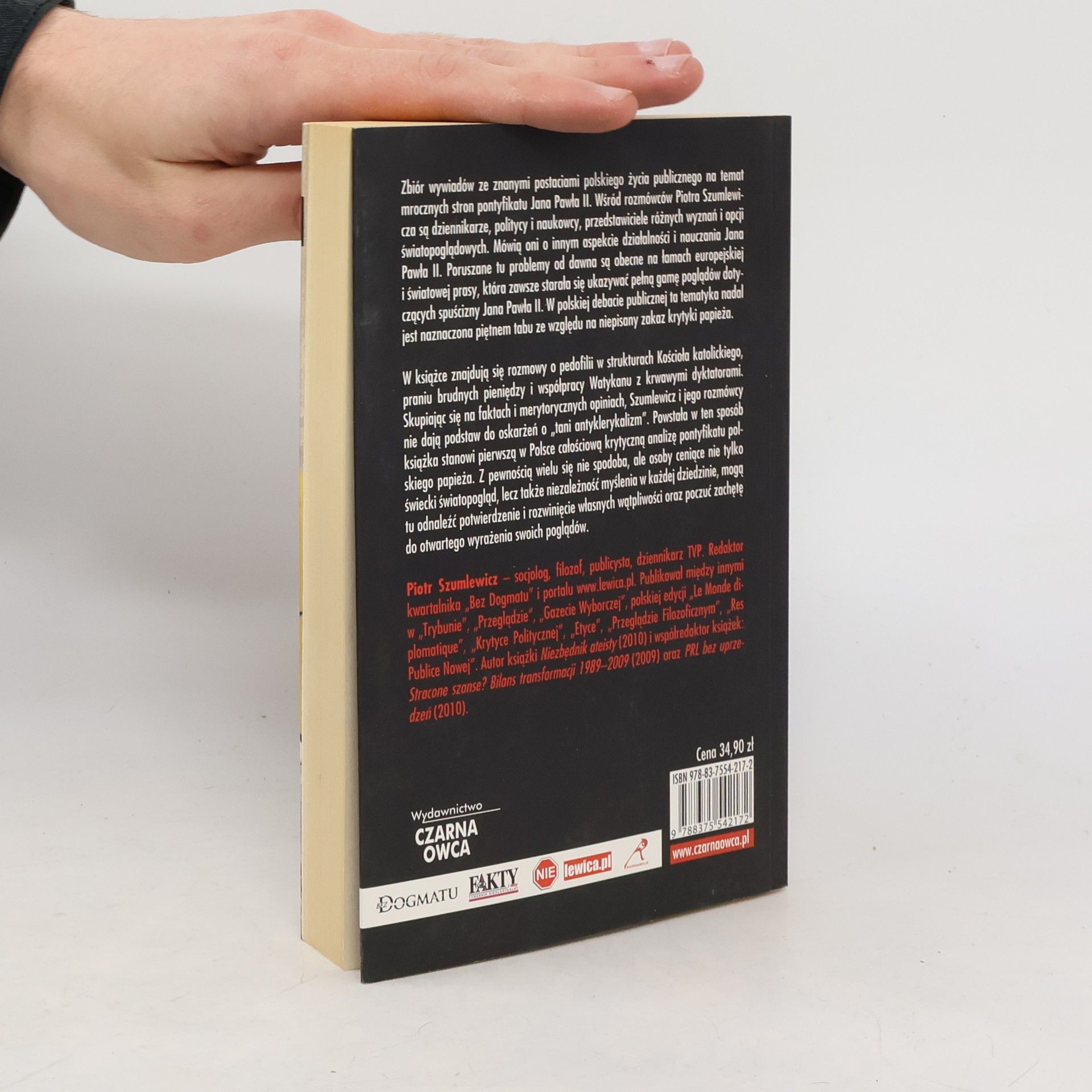 Zbiór wywiadów ze znanymi postaciami polskiego życia publicznego na temat mrocznych stron pontyfikatu Jana Pawła II. Wśród rozmówców Piotra Szumlewicza są dziennikarze, politycy i naukowcy, przedstawiciele różnych wyznań i opcji światopoglądowych. Mówią oni o innym aspekcie działalności i nauczania Jana Pawła II. Poruszane tu problemy od dawna są obecne na łamach europejskiej i światowej prasy, która zawsze starała się ukazywać pełną gamę poglądów dotyczących spuścizny Jana Pawła II. W polskiej debacie publicznej ta tematyka nadal jest naznaczona piętnem tabu ze względu na niepisany zakaz krytyki papieża. W książce znajdują się rozmowy o pedofilii w strukturach Kościoła katolickiego, praniu brudnych pieniędzy i współpracy Watykanu z krwawymi dyktatorami. Skupiając się na faktach i merytorycznych opiniach, Szumlewicz i jego rozmówcy nie dają podstaw do oskarżeń o „tani antyklerykalizm”. Powstała w ten sposób książka stanowi pierwszą w Polsce całościową krytyczną analizę pontyfikatu polskiego papieża. Z pewnością wielu się nie spodoba, ale osoby ceniące nie tylko świecki światopogląd, lecz także niezależność myślenia w każdej dziedzinie, mogą tu odnaleźć potwierdzenie i rozwinięcie własnych wątpliwości oraz poczuć zachętę do otwartego wyrażenia swoich poglądów.