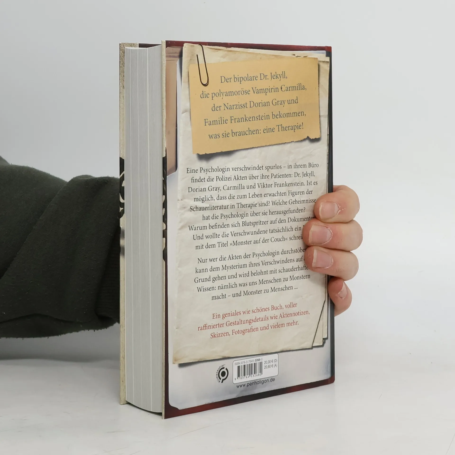 Der bipolare Doktor Jekyll, die polyamoröse Vampirin Carmilla, der Narzisst Dorian Gray und Familie Frankenstein bekommen, was sie brauchen: eine Therapie! Eine Psychologin verschwindet spurlos – in ihrem verlassenen Büro findet die Polizei Akten über ihre Patienten: Dr. Jekyll, Dorian Gray, Carmilla und Viktor Frankenstein. Ist es möglich, dass die zum Leben erwachten Figuren der Schauerliteratur tatsächlich in Therapie sind? Welche Geheimnisse hat die Psychologin über sie herausgefunden? Warum befinden sich Blutspritzer auf den Dokumenten? Und wollte die Verschwundene tatsächlich ein Buch mit dem Titel »Monster auf der Couch« schreiben? Nur wer die Akten der Psychologin durchstöbert, kann dem Mysterium ihres Verschwindens auf den Grund gehen und wird belohnt mit schauderhaftem Wissen: nämlich was uns Menschen zu Monstern macht – und Monster zu Menschen ... Ein geniales wie schönes Buch, voller raffinierter Gestaltungsdetails wie Aktennotizen, Skizzen, Fotografien und vielem mehr. Ausstattung: zahlreiche s/w-Abbildungen