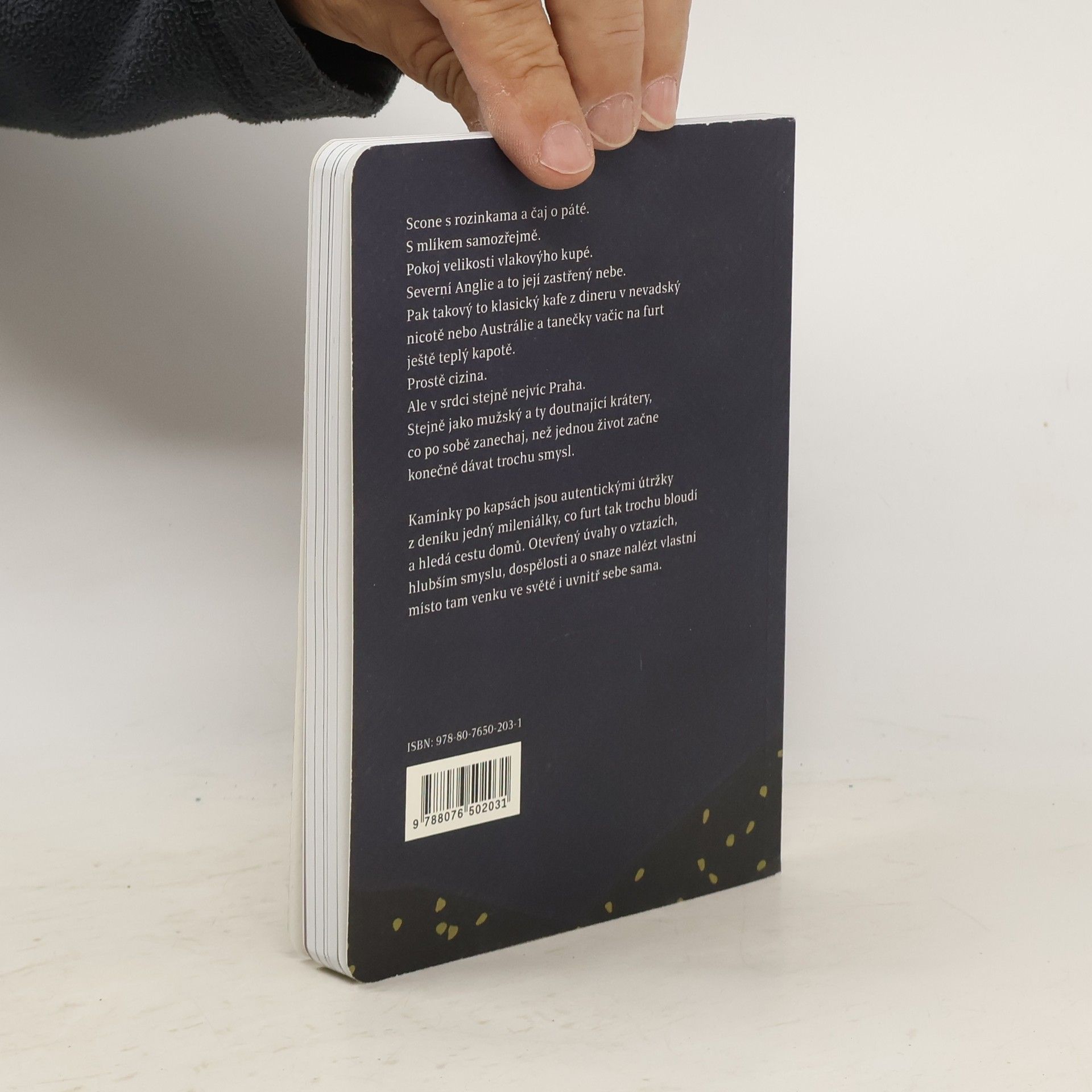 "Scone s rozinkama a čaj o páté. S mlíkem samozřejmě. Pokoj velikosti vlakovýho kupé. Severní Anglie a to její zastřený nebe. Pak takový to klasický kafe z dineru v nevadský nicotě nebo Austrálie a tanečky vačic na furt ještě teplý kapotě. Prostě cizina. Ale v srdci stejně nejvíc Praha. Stejně jako mužský a ty doutnající krátery, co po sobě zanechaj, než jednou život začne konečně dávat trochu smysl. Kamínky po kapsách jsou autentickými útržky z deníku jedný mileniálky, co furt tak trochu bloudí a hledá cestu domů. Otevřený úvahy o vztazích, hlubším smyslu, dospělosti a o snaze nalézt vlastní místo tam venku ve světě i uvnitř sebe sama."