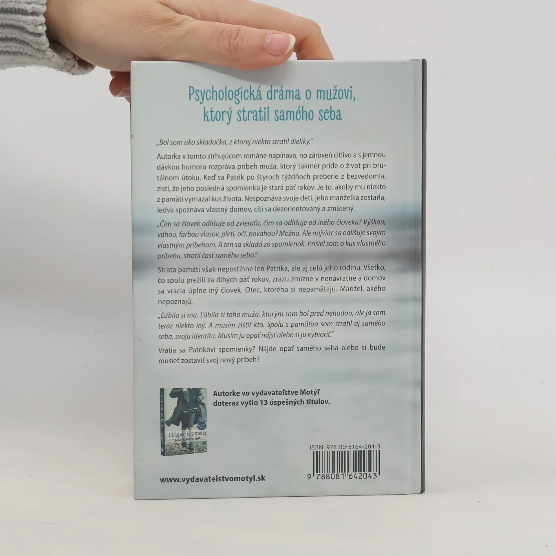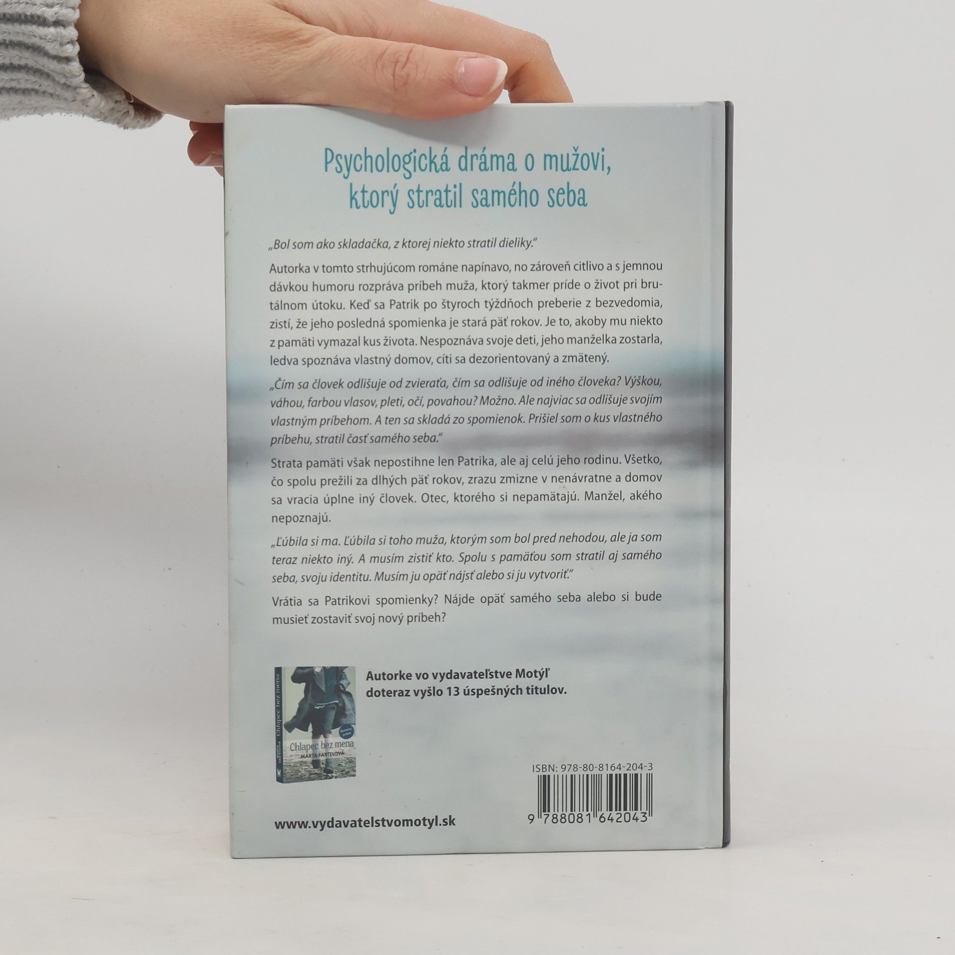Psychologická dráma o mužovi, ktorý stratil samého seba "Bol som ako skladačka,z ktorej niekto stratil dieliky." Autorka v tomto strhujúcom románe napínavo,no zároveň citlivo a s jemnou dávkou humoru rozpráva príbeh muža, ktorý takmer príde o život pri brutálnom útoku. Keď sa Patrik po štyroch týždňoch preberie z bezvedomia, zistí, že jeho posledná spomienka je stará päť rokov. Je to,ako by mu niekto z pamäti vymazal kus života. Nespoznáva svoje deti, jeho manželka zostarla,ledva spoznáva vlastný domov, cíti sa dezorientovaný a zmätený. "Čím sa človek odlišuje od zvieraťa, čím sa odlišuje od iného človeka? Výškou, váhou,farbou vlasov, pleti, očí, povahou? Možno. Ale najviac sa odlišuje svojím vlastným príbehom. A ten sa skladá zo spomienok. Prišiel som o kus vlastného príbehu, stratil časť samého seba." Strata pamäti však nepostihne len Patrika, ale aj celú jeho rodinu. Všetko, čo spolu prežili za dlhých päť rokov, zrazu zmizne v nenávratne a domov sa vracia úplne iný človek. Otec, ktorého si nepamätajú. Manžel, akého nepoznajú. "Ľúbila si ma. Ľúbila si toho muža, ktorým som bol pred nehodou, ale ja som teraz niekto iný. A musím zistiť kto. Spolu s pamäťou som stratil aj samého seba, svoju identitu. Musím ju opäť nájsť, alebo si ju vytvoriť." Vrátia sa Patrikovi spomienky? Nájde opäť samého seba alebo si bude musieť zostaviť svoj nový príbeh?