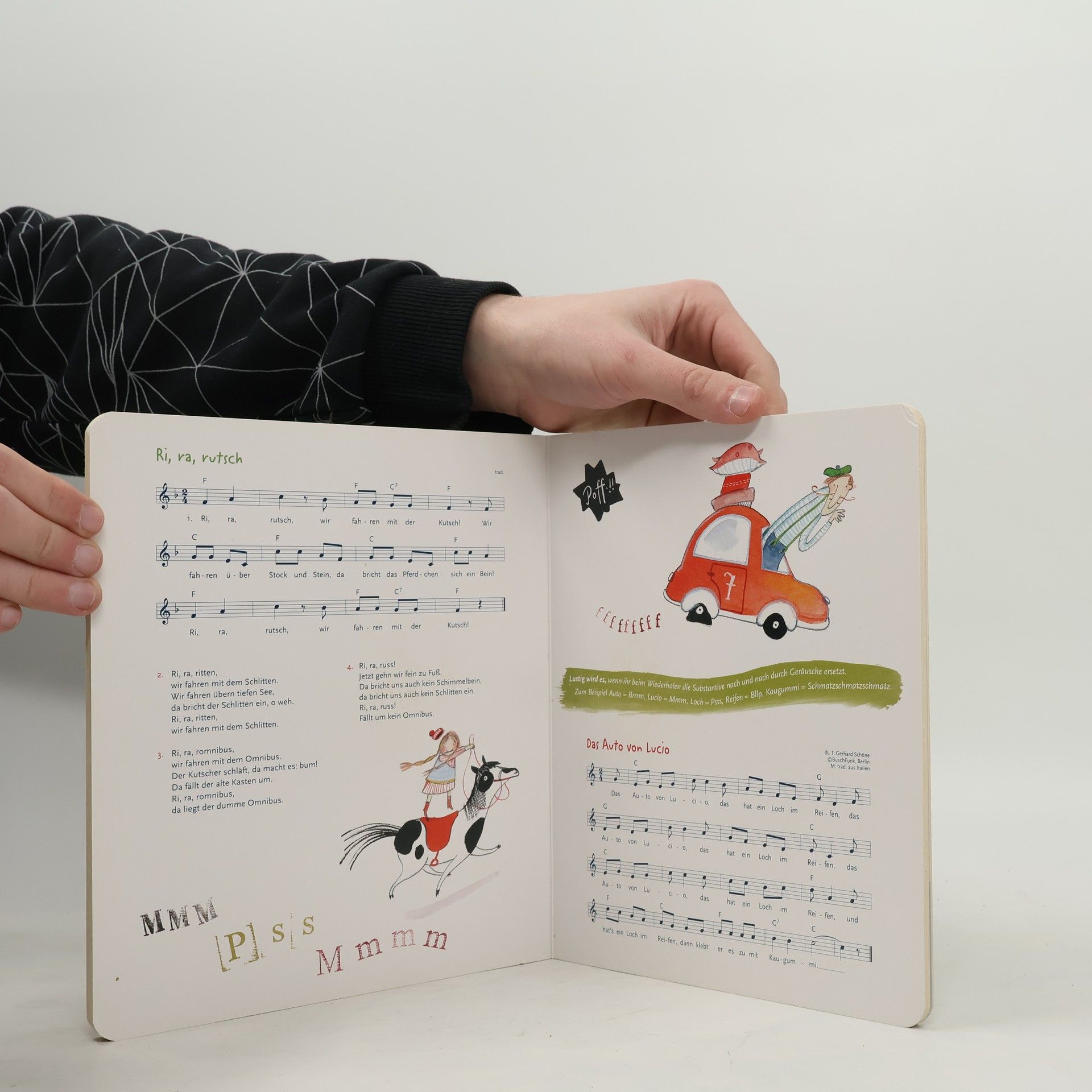20 Lieblingslieder in der stabilen Pappe: Bekannte Kita-Evergreens und manch musikalischen Knallfrosch hat Sybille Hein mit ihren quirligen Bildern versehen. Notensätze, Gitarrengriffe sowie kreative Spiel- und Bewegungsideen sind natürlich auch mit dabei. Das Allerbeste aber: Der Musiker Falk Effenberger hat alle Lieder vertont und überrascht mit seinen vergnüglichen, kreativen Arrangements.