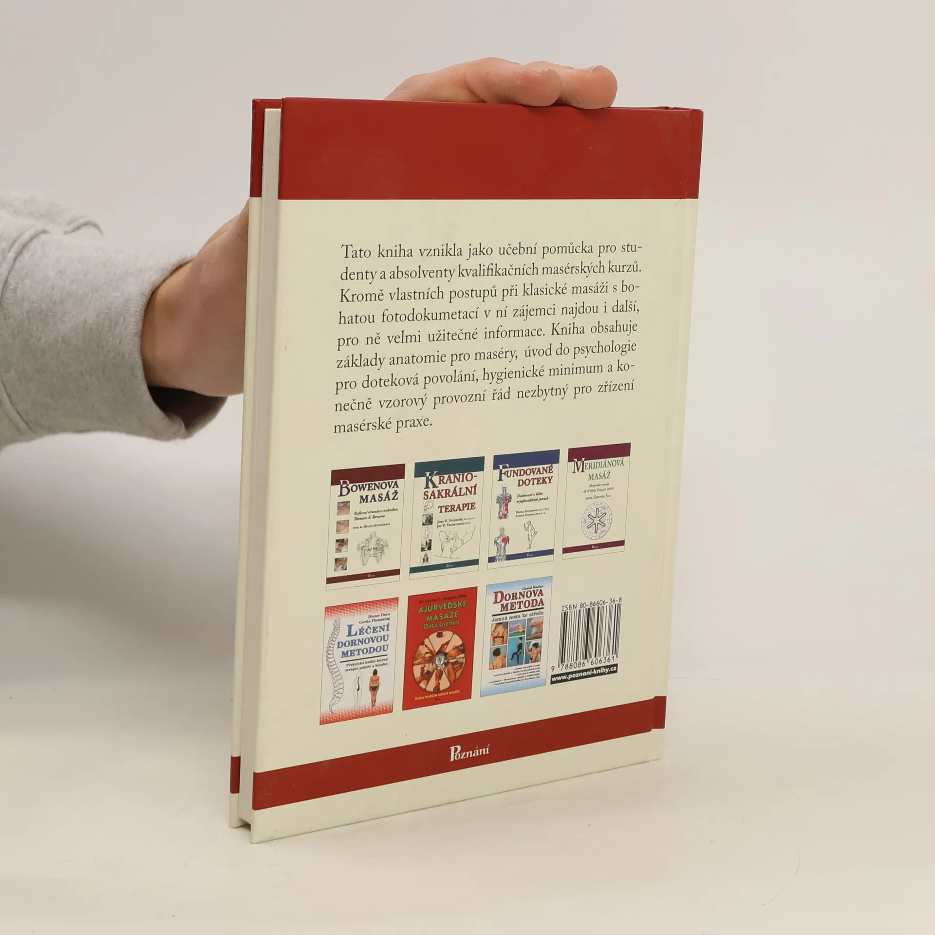 Tato kniha vznikla jako učební pomůcka pro studenty a absolventy kvalifikačních masérských kurzů. Kromě vlastních postupů při klasické masáži s bohatou fotodokumentací v ní zájemci najdou i další, pro ně velmi užitečné informace. Kniha obsahuje základy anatomie pro maséry, úvod do psychologie pro doteková povolání, hygienické minimum a konečně vzorový provozní řád nezbytný pro zřízení masérské praxe.