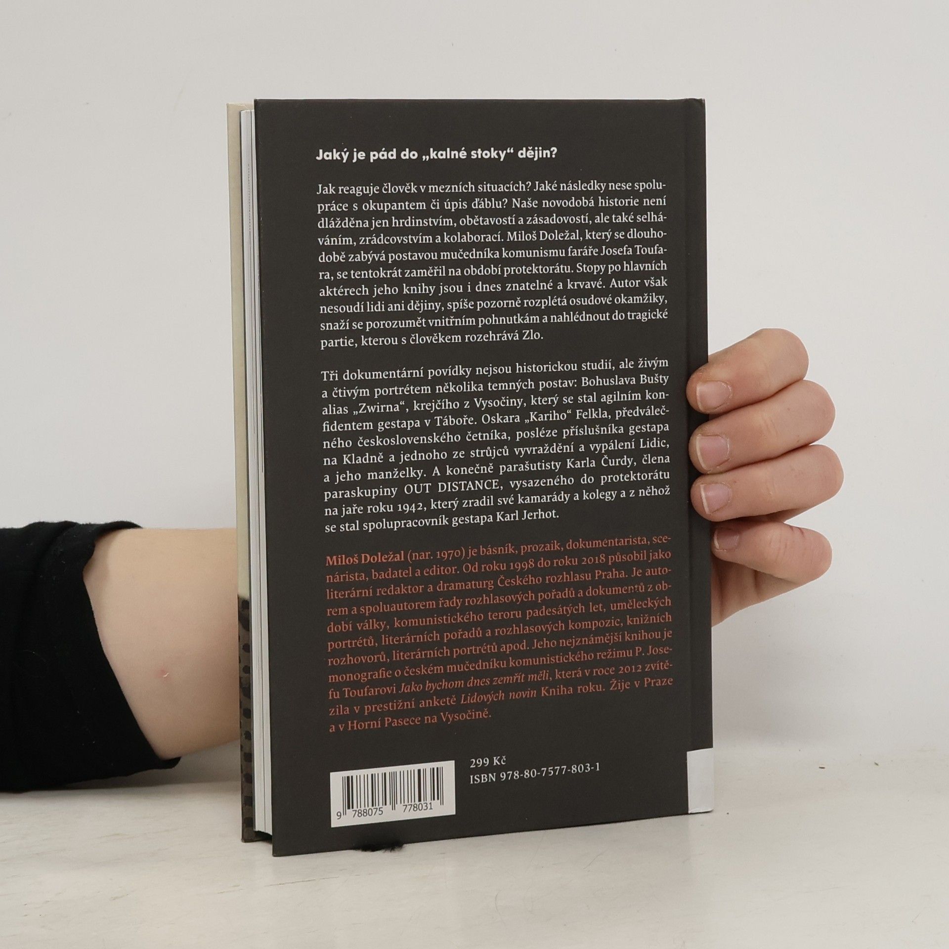 Jaký je pád do „kalné stoky“ dějin? Jak reaguje člověk v mezních situacích? Jaké následky nese spolupráce s okupantem či úpis ďáblu? Naše novodobá historie není dlážděna jen hrdinstvím, obětavostí a zásadovostí, ale také selháváním, zrádcovstvím a kolaborací. Miloš Doležal, který se dlouhodobě zabývá postavou mučedníka komunismu faráře Josefa Toufara, se tentokrát zaměřil na období protektorátu. Stopy po hlavních aktérech jeho knihy jsou i dnes znatelné a krvavé. Autor však nesoudí lidi ani dějiny, spíše pozorně rozplétá osudové okamžiky, snaží se porozumět vnitřním pohnutkám a nahlédnout do tragické partie, kterou s člověkem rozehrává Zlo. Tři dokupovídky nejsou historickou studií, ale živým a čtivým portrétem několika temných postav: Bohuslava Bušty alias „Zwirna“, krejčího z Vysočiny, který se stal agilním konfidentem gestapa v Táboře. Oskara „Kariho“ Felkla, předválečného československého četníka, posléze příslušníka gestapa na Kladně a jednoho ze strůjců vyvraždění a vypálení Lidic, a jeho manželky. A konečně parašutisty Karla Čurdy, člena paraskupiny OUT DISTANCE, vysazeného do protektorátu na jaře 1942, který zradil své kamarády a spolupracovníky a z kterého se stal spolupracovník gestapa Karl Jerhot.