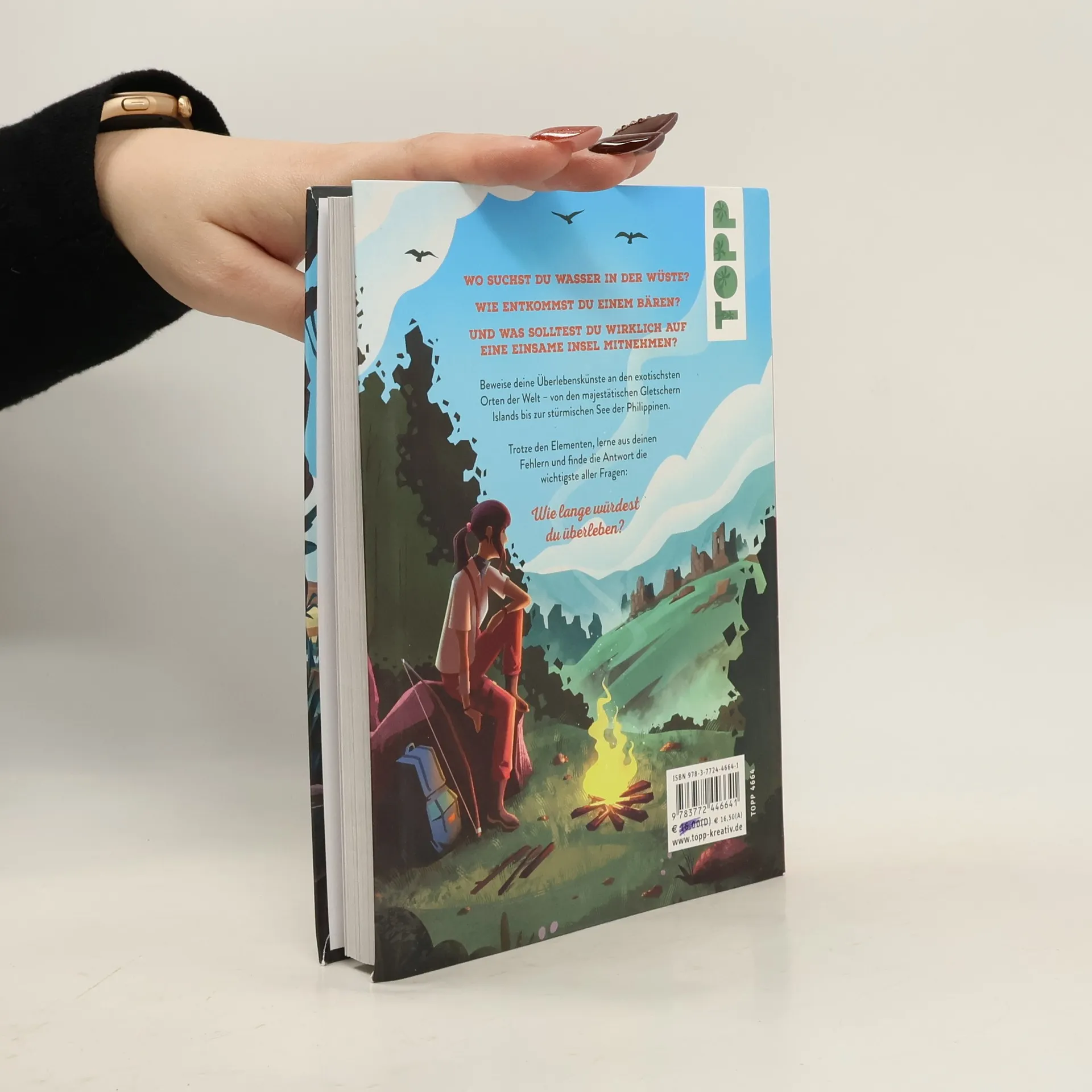 "Wo suchst du Wasser in der Wüste? Wie entkommst du einem Bären? Und was solltest du wirklich auf eine einsame Insel mitnehmen? Dieses Outdoor-Spielbuch wirft dich mitten hinein in gefährliche Situationen an den exotischsten Orten der Welt. Über 100 Multiple-Choice-Fragen stellen dich vor Entscheidungen, von denen dein Leben abhängen könnte. In diesem Quiz sammelst du nicht nur Punkte, sondern Erfahrungen! Die Antworten in diesem Buch verraten dir die Tipps und Tricks der Survival-Profis und machen dich fit für jedes Abenteuer. Von den majestätischen Gletschern Islands bis zur stürmischen See der Philippinen - trotze den Elementen, lerne aus deinen Fehlern und finde die Antwort die wichtigste aller Fragen: Wie lange würdest du überleben?" (www.buchhandel.de)