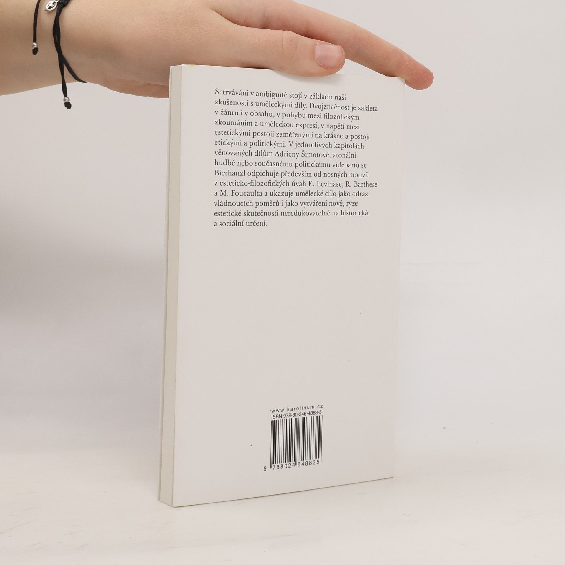 Setrvávání v ambiguitě stojí v základu naší zkušenosti s uměleckými díly. Dvojznačnost je zakleta v žánru i v obsahu, v pohybu mezi filozofickým zkoumáním a uměleckou expresí, v napětí mezi estetickými postoji zaměřenými na krásno a postoji etickými a politickými. V jednotlivých kapitolách věnovaných dílům Adrieny Šimotové, atonální hudbě nebo současnému politickému videoartu se Bierhanzl odpichuje především od nosných motivů z esteticko-filozofických úvah E. Levinase, R. Barthese a M. Foucaulta a ukazuje umělecké dílo jako odraz vládnoucích poměrů i jako vytváření nové, ryze estetické skutečnosti neredukovatelné na historická a sociální určení.