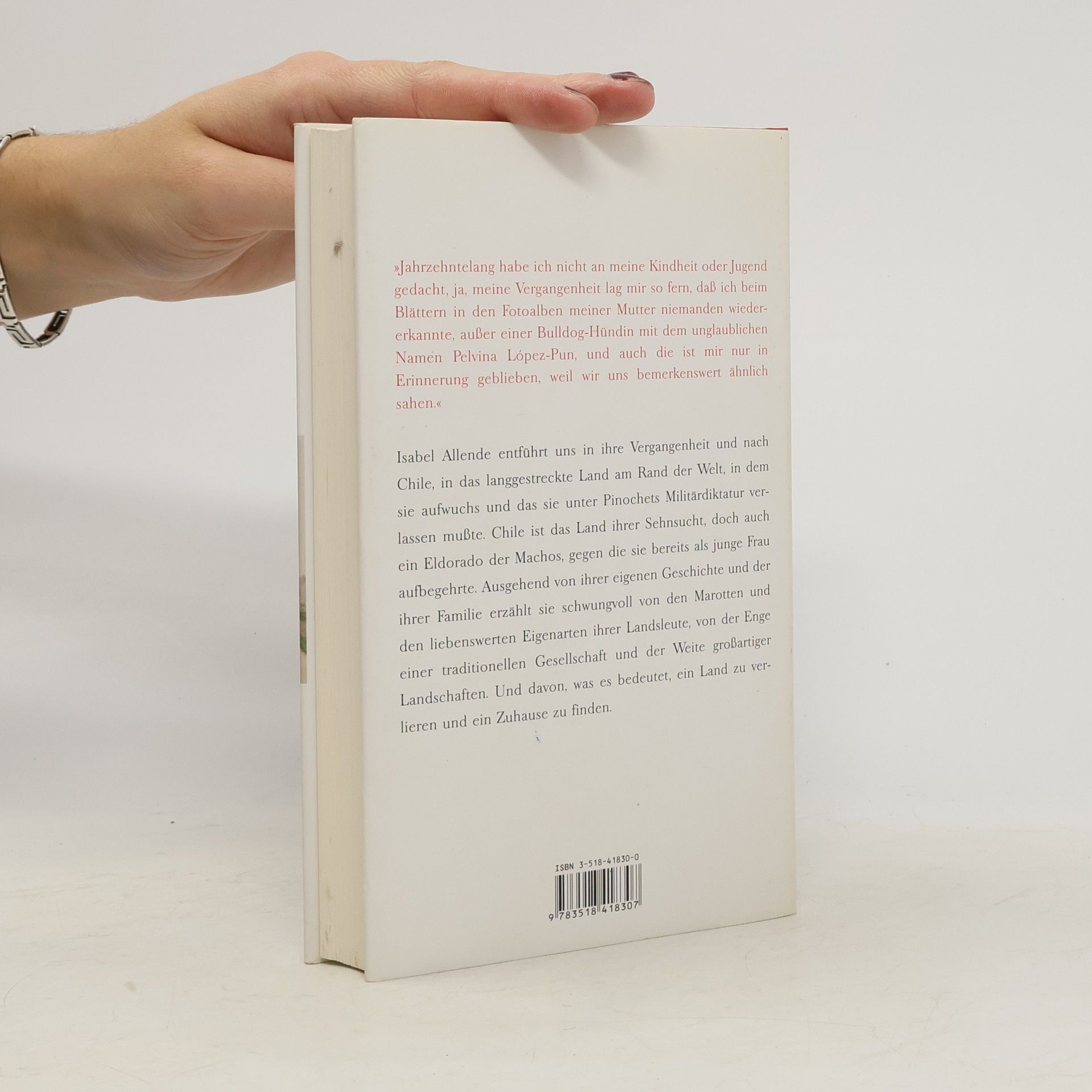 Ihre früheste Erinnerung an Chile ist die an ein nie gesehenes Haus: das »große Eckhaus«, in dem ihre Mutter geboren wurde. Es spielt eine zentrale Rolle in ihrem Roman und begegnet uns zu Beginn dieses Erinnerungsbuches, das uns in die Welt der großen Geschichtenerzählerin führt. Die unvergesslichen Figuren aus ihrem ersten Roman kehren ins Leben zurück. Die fiktive Sippe der Truebas ähnelt alarmierend ihrer eigenen Familie: „Solche Figuren hätte ich nicht erfinden können.“ Ein Schicksal wie ihres bringt Heimweh mit sich, und sie erzählt von ihrem geliebten, aber fremden Land, das sie vor dem Militärputsch von 1973 verließ. Vor der Kulisse grandioser Landschaften beschreibt sie den Stolz, die Großzügigkeit und Borniertheit ihrer Landsleute, die Machos und unermüdlichen Frauen – all das, was ihr Heimatland liebenswert und unerträglich macht. Sie reflektiert über die gewaltsame Geschichte Chiles und darüber, was es bedeutet, als Hispanic in den USA ein neues Zuhause zu finden. Dieses Zuhause ist nicht auf Karten verzeichnet: „Ich kann fast überall leben und schreiben. Jedes Buch trägt zu diesem ›Ort in meinem Kopf‹ bei.“ Im langsamen Prozess des Schreibens hat sie mit ihren Dämonen gerungen, Erinnerungen erforscht und aus diesen Rohstoffen einen Ort geschaffen, den sie Heimat nennt. Dort kommt sie her.