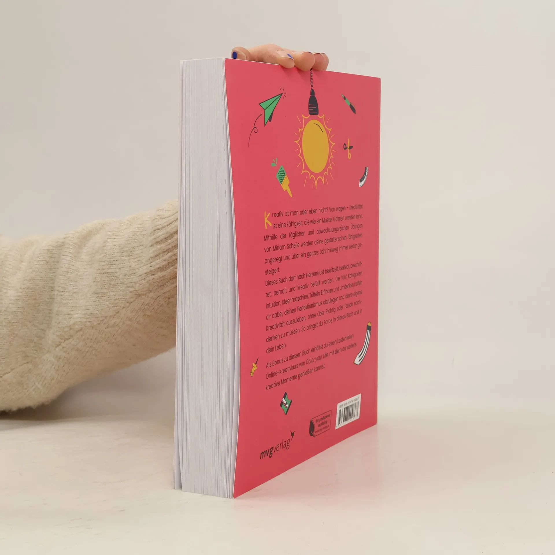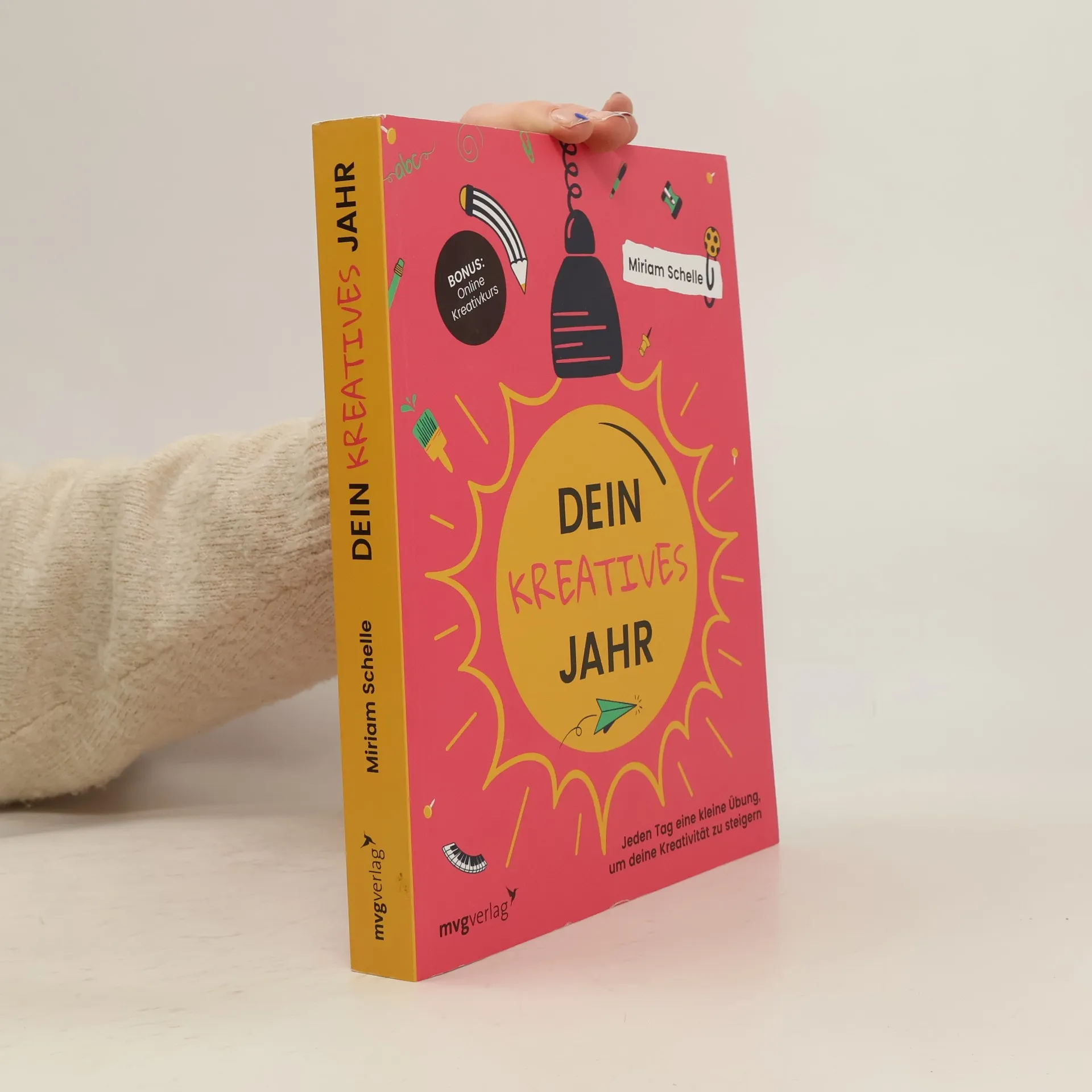 Kreativität hat man oder eben nicht? Von wegen – Kreativität ist eine Fähigkeit, die wie ein Muskel trainiert werden kann. Mithilfe der täglichen, abwechslungsreichen Übungen von Miriam Schelle werden unsere kreativen Fähigkeiten entdeckt und über ein ganzes Jahr hinweg immer weiter gesteigert. Dieses Buch darf nach Herzenslust bekritzelt, beklebt, beschriftet, beschmiert und bemalt werden. Die fünf Kategorien Intuition, Ideenmaschine, Tüfteln, Erfinden und Umdenken helfen dabei, den Perfektionismus abzulegen und die eigene Kreativität auszuleben, ohne über Richtig oder Falsch nachdenken zu müssen. So bringen wir Farbe in dieses Buch und unser Leben.