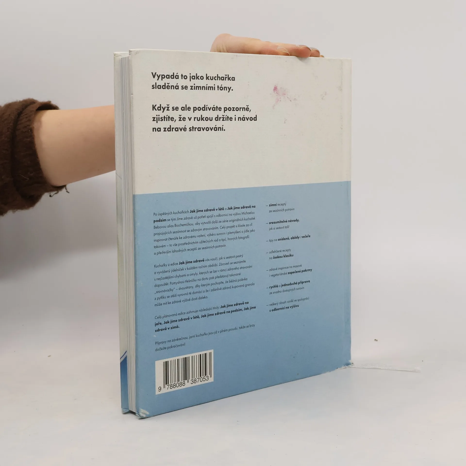 Po úspěšných kuchařkách Jak jíme zdravě v létě a Jak jíme zdravě na podzim se tým Jíme zdravě opět spojil s odbornicí na výživu Michaelou Bebovou, aby vytvořili další originální kuchařku propojující sezónnost se zdravým stravováním. Kniha vám pomůže sestavit jídelníček pro celou rodinu, zajišťující pestrou a vyváženou stravu. Obsahuje také nejčastější chyby, kterých se dopouštíme při vaření. Zajímavé „srovnávačky“ ukazují rozdíly mezi běžnými polévkami z pytlíku a domácími variantami, stejně jako to, jak mohou být některé zakoupené granoly daleko od zdravé výživy. Kniha nabízí více než 90 sezónních receptů a je rozdělena do tří kapitol: „Snídaně“, „Hlavní jídla“ a „Kvašení a fermentace“. Autoři se zaměřili na křupavé granoly, zapečené ovesné kaše, obložené chleby a krémové polévky, které můžete jíst od rána do večera. Velká pozornost je věnována zapečeným receptům z jednoho hrnce a klasické české kuchyni v odlehčené podobě. Během mrazivých večerů můžete objevovat tajemství výroby domácího zelí, kimči, vodního kefíru či kváskového chleba. Názvy jako casserole, hash nebo suflé vás možná překvapí, ale nebojte se – jsou to jen variace na známá jídla, která obohatí vaše kulinářské zážitky.