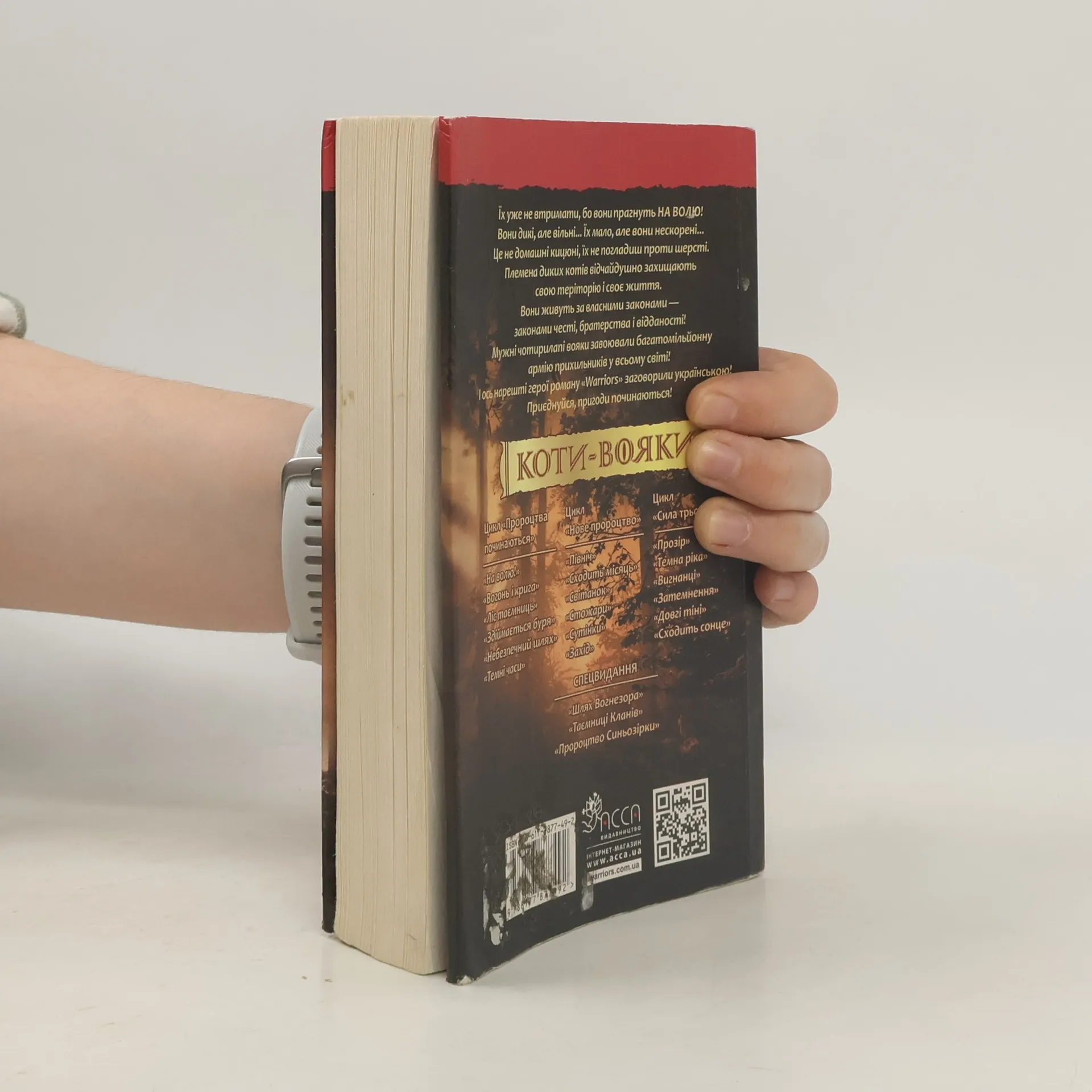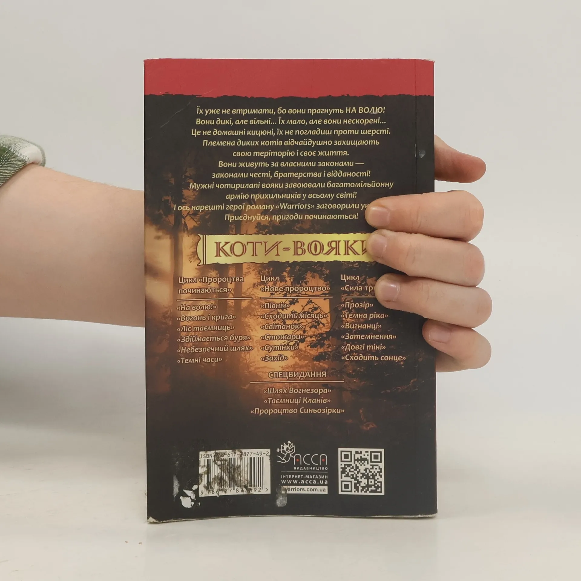 За пригодами диких та вільних котів стежить вже не одне покоління дітей та підлітків, адже серія почала видаватися з 2003 року. Світове визнання фентезі- книги отримали не тільки від дітей, а й від дорослих. Діючі фан-клуби в різних країнах світу активно обговорюють пригоди улюблених персонажів.Сюжет першої книги «Коти-вояки. На волю!» (англ. Warriors cats. Into the Wild!) розповідає про життя домашнього кошеняти, яке вирішило втікти від своїх господарів на волю. У хащах незайманого лісу дикі племена котів відчайдушно змагаються за свою територію і за право вижити. Що станеться з рудим хатнім котиком, який опинився в самісінькому центрі цих котячих війн? Тут його точно ніхто не погладить по загривку і не нагодує смачною їжею. У нього є вибір: або повернутися назад і бути живою іграшкою, або випустити на волю свої дикі інстинкти і стати справжнім вояком Клану…Чотири Клани котів. Чотири потужні стихії. Чотири армії вояків, що живуть за законами честі та братерства. Приєднуйся до них, пригоди починаються!Переклад з англійської — Катерина Дудка, Остап Українець. Оформлення — Олег Панченко. При перекладі тексту українською для опису загального устрою котячих кланів та громадянства їхніх членів була використана термінологія Національної скаутської організації України «Пласт».