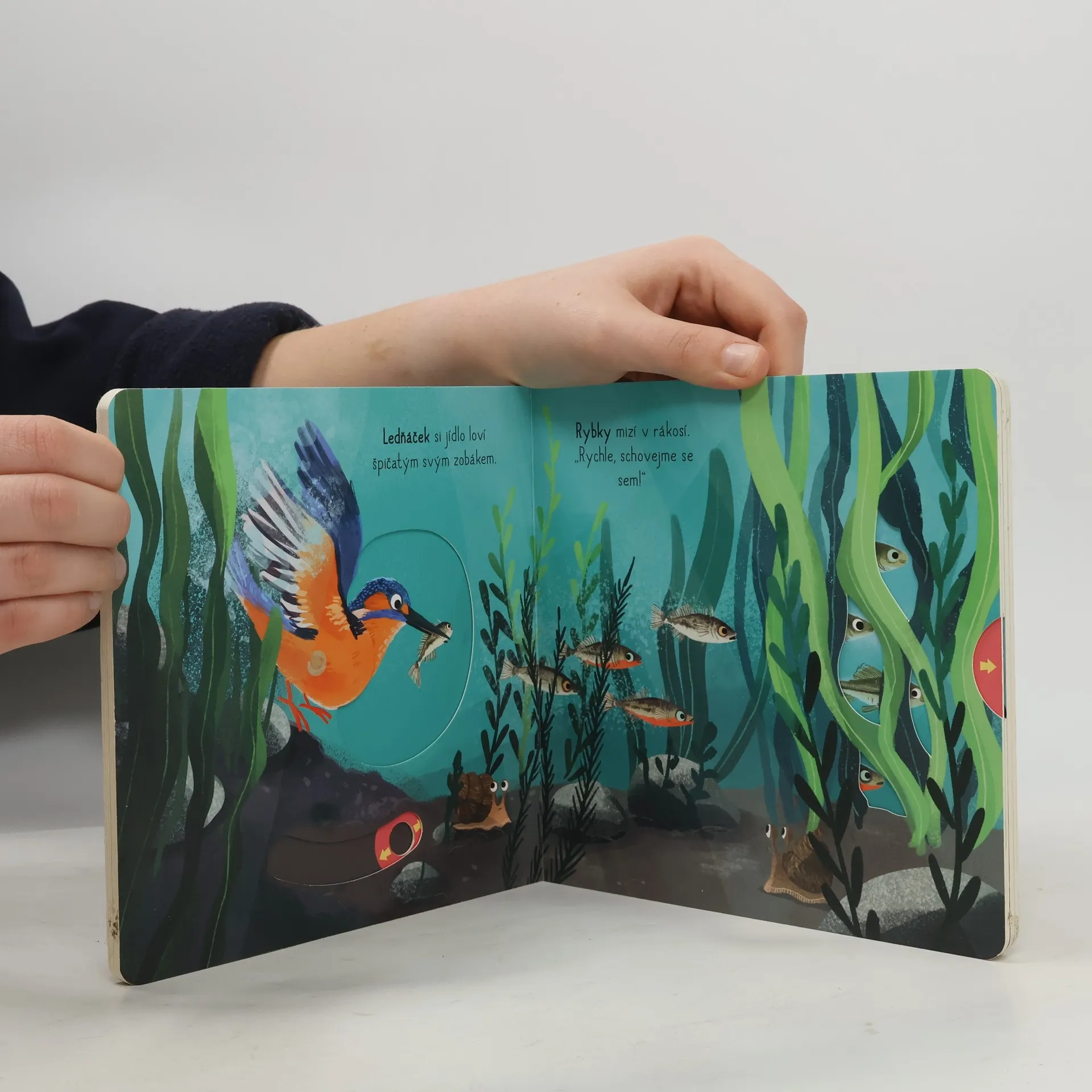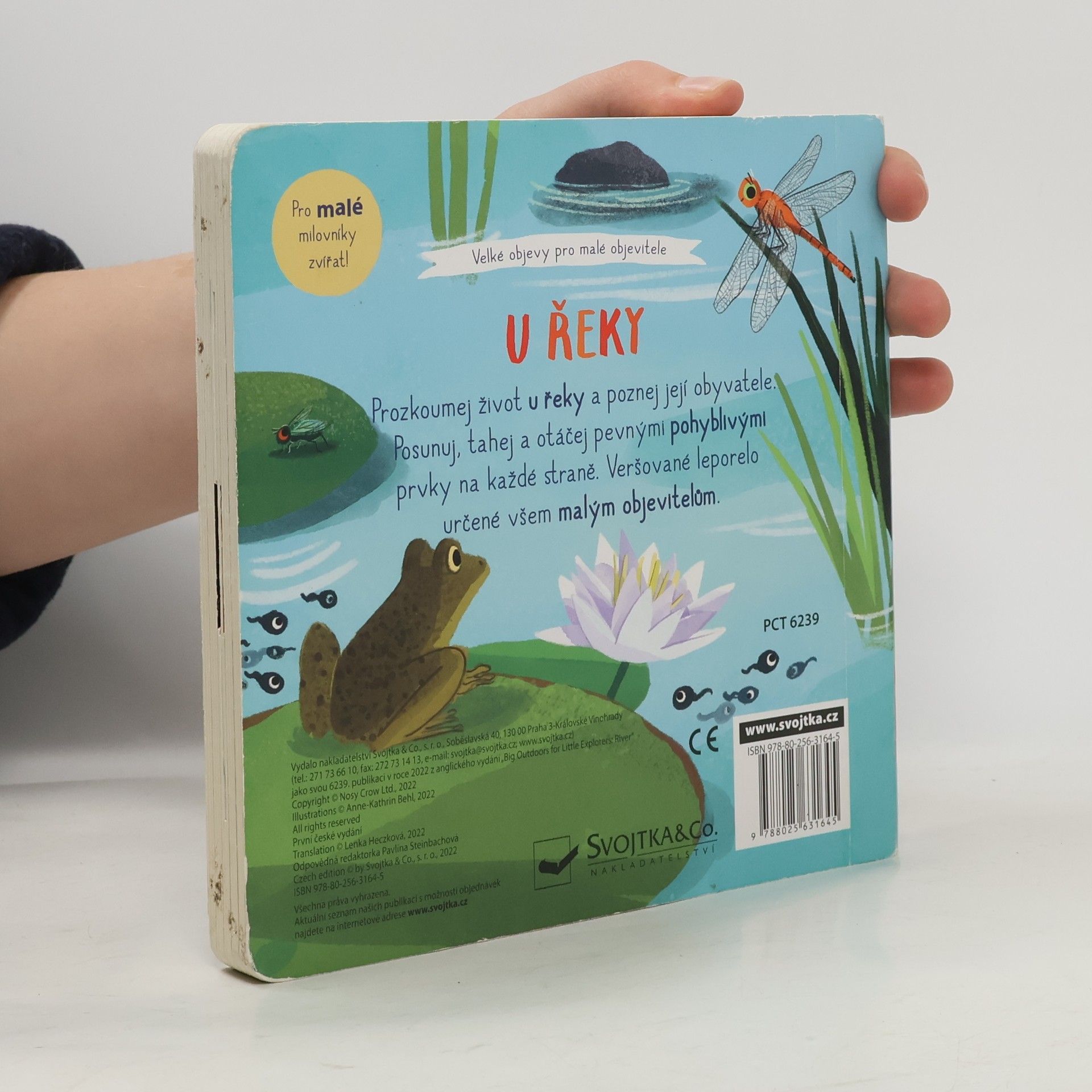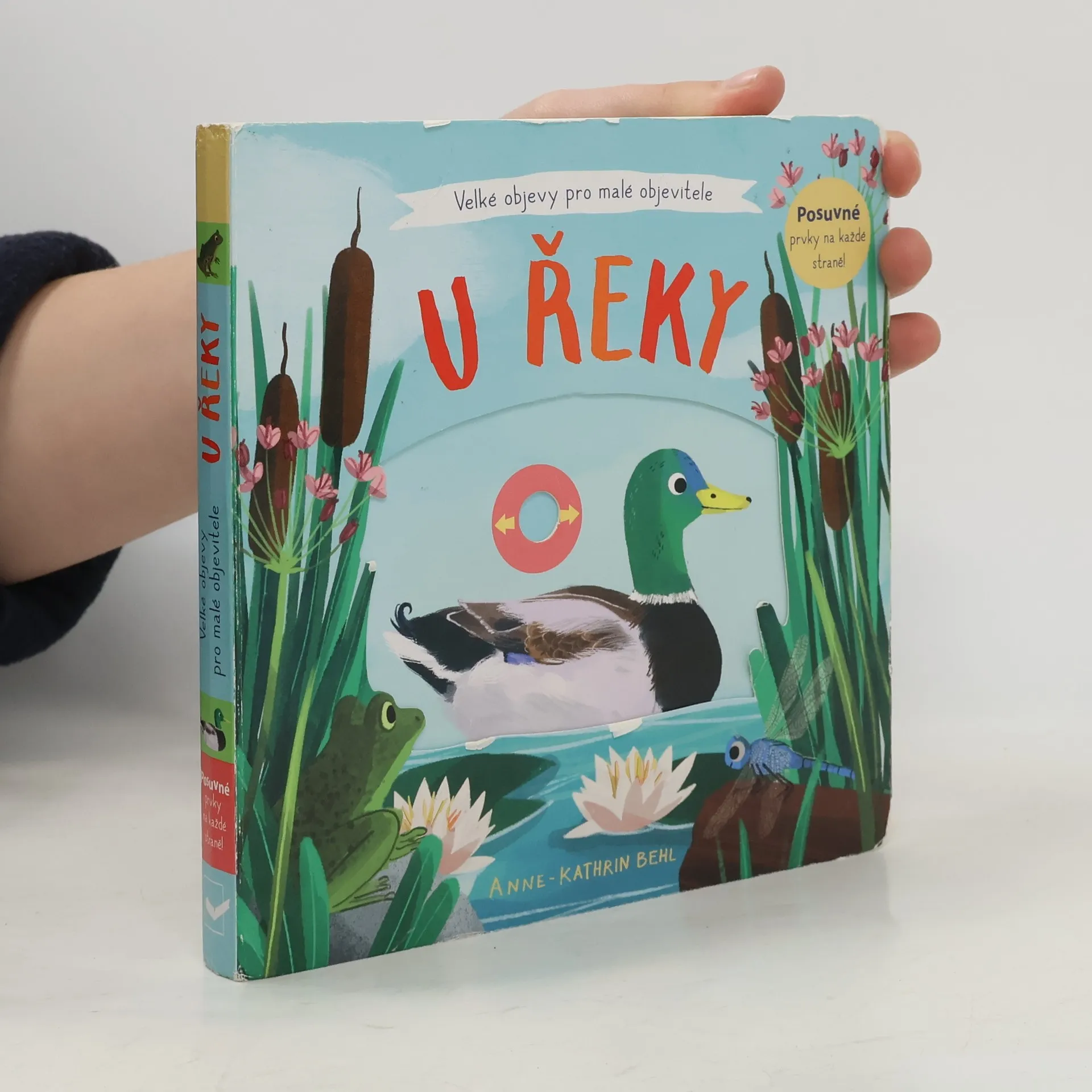 Pojďme prozkoumat život u řeky. Je pestrý, zajímavý a plný nejrůznějších zvířat. Prohlédni si obrázky a zjisti, co všechno u řeky můžeme objevit - ryby, kachny, žáby a vážky, ale i volavku, bobry nebo ledňáčka. Ti všichni čekají na malé objevitele a objevitelky v tomto veršovaném leporelu s pohyblivými prvky. Obrázky lze oživit na každé stránce. Stačí tady zatáhnout, tam posunout nebo pootočit. Knížka zároveň rozvíjí jemnou motoriku.