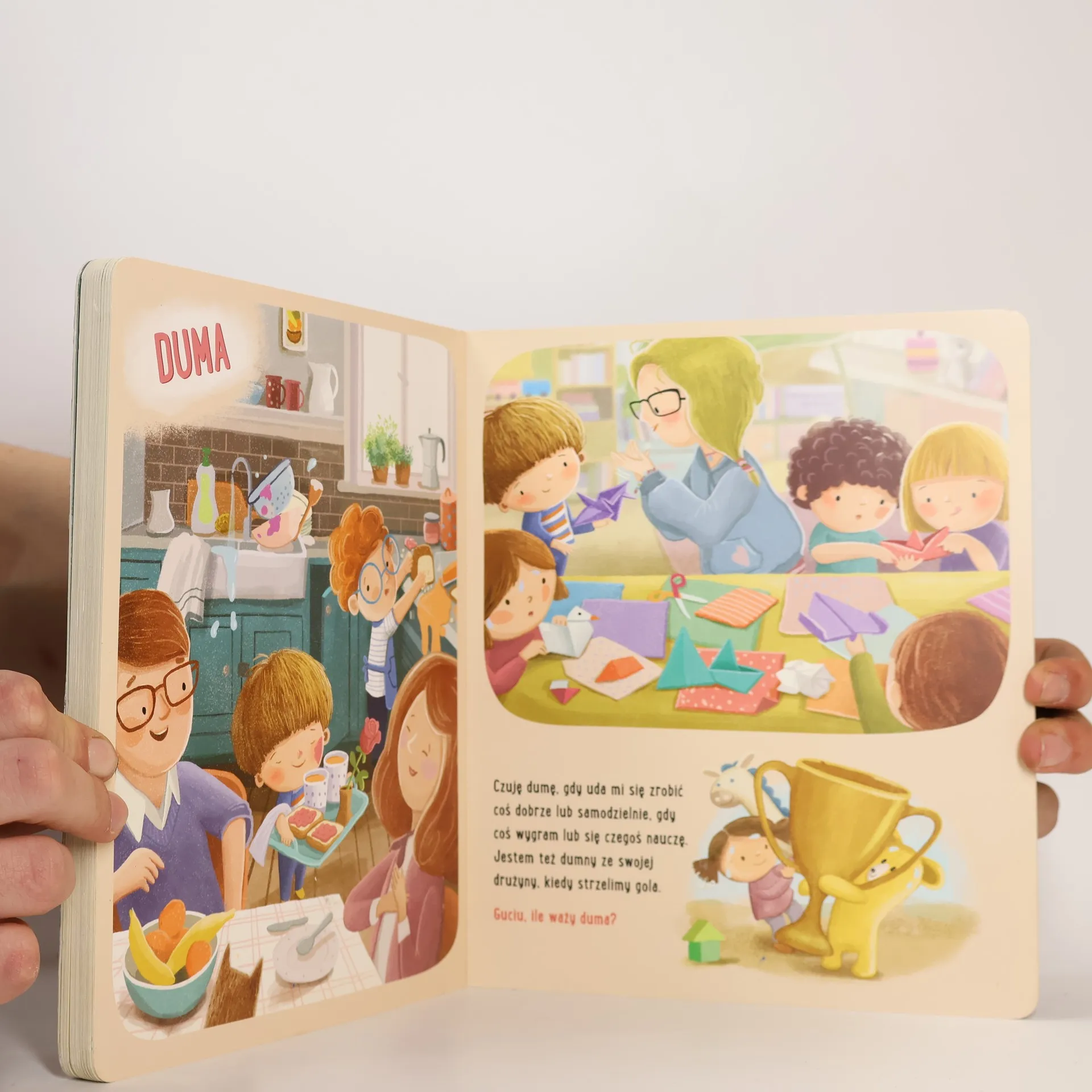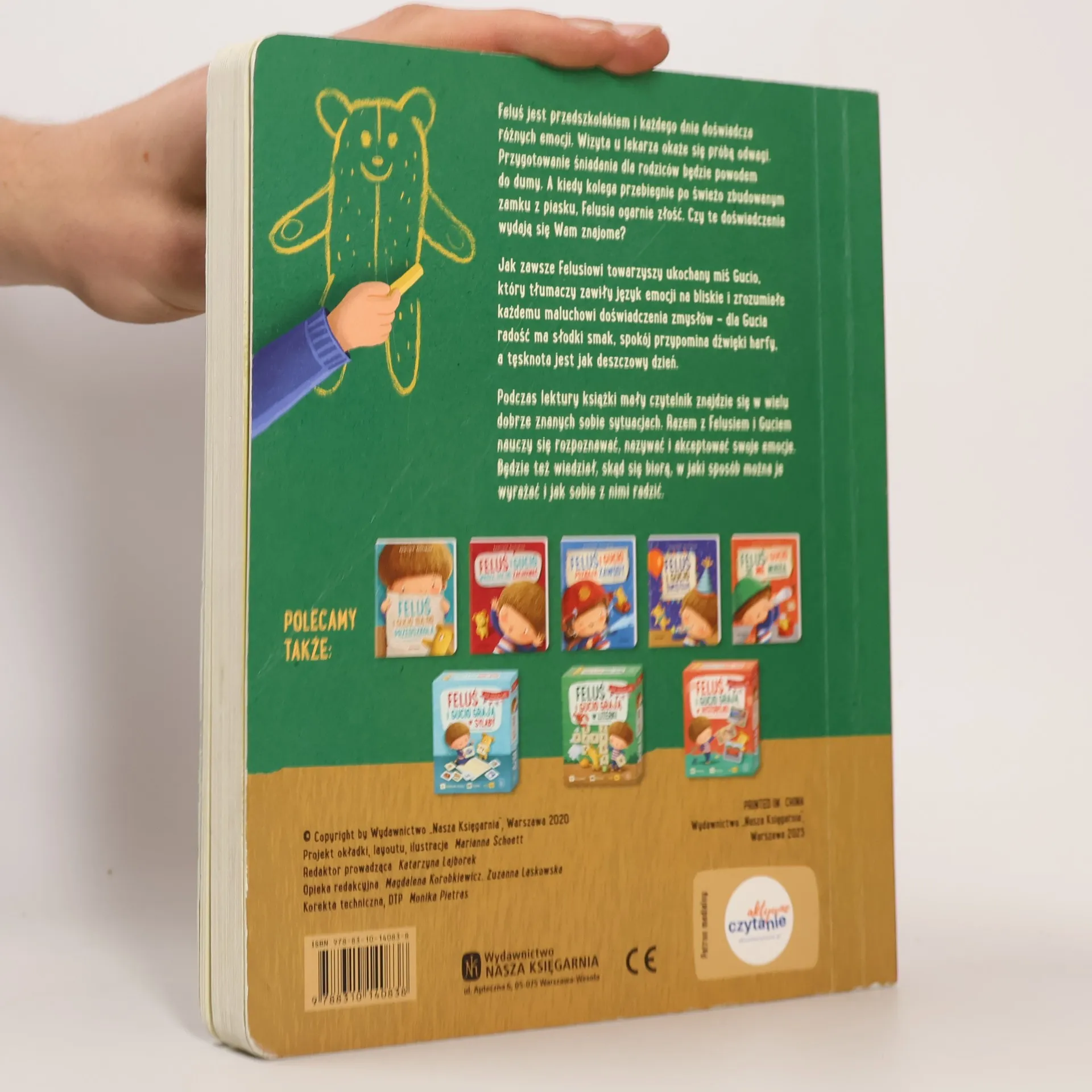 Feluś jest przedszkolakiem i każdego dnia doświadcza różnych emocji. Wizyta u lekarza okaże się próbą odwagi. Przygotowanie śniadania dla rodziców będzie powodem do dumy. A kiedy kolega przebiegnie po świeżo zbudowanym zamku z piasku, Felusia ogarnie złość. Czy te doświadczenia wydają się Wam znajome? Jak zawsze Felusiowi towarzyszy ukochany miś Gucio, który tłumaczy zawiły język emocji na bliskie i zrozumiałe każdemu maluchowi doświadczenia zmysłów - dla Gucia radość ma słodki smak, spokój przypomina dźwięki harfy, a tęsknota jest jak deszczowy dzień. Podczas lektury książki mały czytelnik znajdzie się w wielu dobrze znanych sobie sytuacjach. Razem z Felusiem i Guciem nauczy się rozpoznawać, nazywać i akceptować swoje emocje. Będzie też wiedział, skąd się biorą, w jaki sposób można je wyrażać i jak sobie z nimi radzić. Powyższy opis pochodzi od wydawcy.