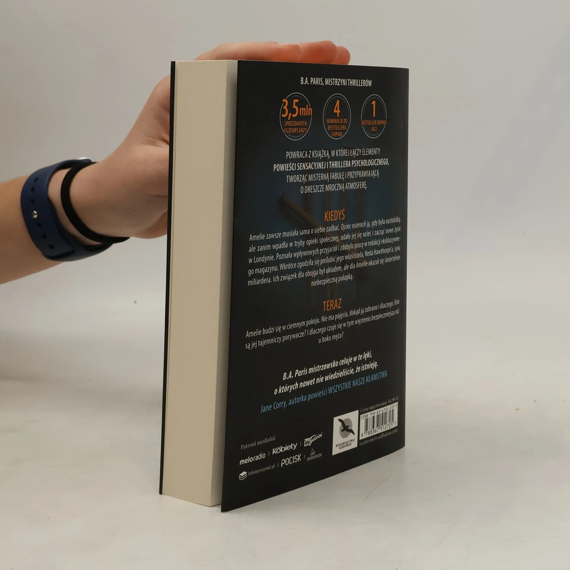 Przekłady na 40 języków. Ponad 3,5 miliona sprzedanych egzemplarzy Za zamkniętymi drzwiami w tym ponad 400 tysięcy w Polsce. 3 nominacje do tytułu Książki Roku Lubimy Czytać w kategorii kryminał, sensacja/thriller. 4 nominacje do Bestsellera Empiku. I tytuł Bestsellera Empiku dla Terapeutki w kategorii literatura popularna. Jest ciemno. Nie wiesz, gdzie jesteś. Słyszysz zbliżające się kroki. A potem krzyki swojego męża. Misterna, porywająca fabuła pełna zwrotów akcji! Autorka międzynarodowego fenomenu wydawniczego, Za zamkniętymi drzwiami, powraca z nowym mrocznym thrillerem, który nie pozwoli ci zasnąć. Kiedyś Amelie zawsze musiała sama o siebie zadbać. Ojciec osierocił ją, gdy była nastolatką, ale zanim wpadła w tryby opieki społecznej, udało jej się uciec i zacząć życie od nowa w Londynie. Poznała wpływowych przyjaciół i zdobyła pracę w redakcji luksusowego magazynu. Wkrótce zgodziła się poślubić jego właściciela, miliardera Neda Hawthorpea. Ich związek dla obojga był układem, ale dla Amelie okazał się śmiertelnie niebezpieczną pułapką. Teraz Amelie budzi się w ciemnym pokoju bez okien. Nie ma pojęcia, dokąd ją zabrano i dlaczego. Kim są jej tajemniczy porywacze? I dlaczego czuje się w tym więzieniu bezpieczniejsza niż u boku swojego męża Neda? Przed nową powieścią B.A. Paris nie ma ucieczki. - KATARZYNA PUZYŃSKA B.A. Paris mistrzowsko celuje w te lęki, o których nawet nie wiedzieliście, że istnieją. Jane Corry Mistrzyni zwrotów akcji i gry na emocjach. OK B.A. Paris jest prawdziwą królową wśród autorek thrillerów psychologicznych. My Weekly Porywająca akcja i misternie utkana fabuła B.A. Paris wspina się na wyżyny! Lucy Clarke Mroczny, śmiały, zniewalający. B.A. Paris zręcznie opowiada ponurą historię o przetrwaniu, ale wynosi ją na wyższy poziom, robiąc to w swoim niepowtarzalnym, doskonałym stylu tej książki po prostu nie da się odłożyć przed końcem. Chris Whitaker Wstrząsający thriller o Kopciuszku ze zdeterminowaną, zahartowaną życiem bohaterką, której przeciwnik najwyraźniej nie docenia. Jej żywiołowa, błyskotliwa narracja sprawia, że napięcie rośnie i stanowi przeciwwagę dla złowrogiego świata kreowanego przez Hawthorpea. Christine Tran, Booklist
