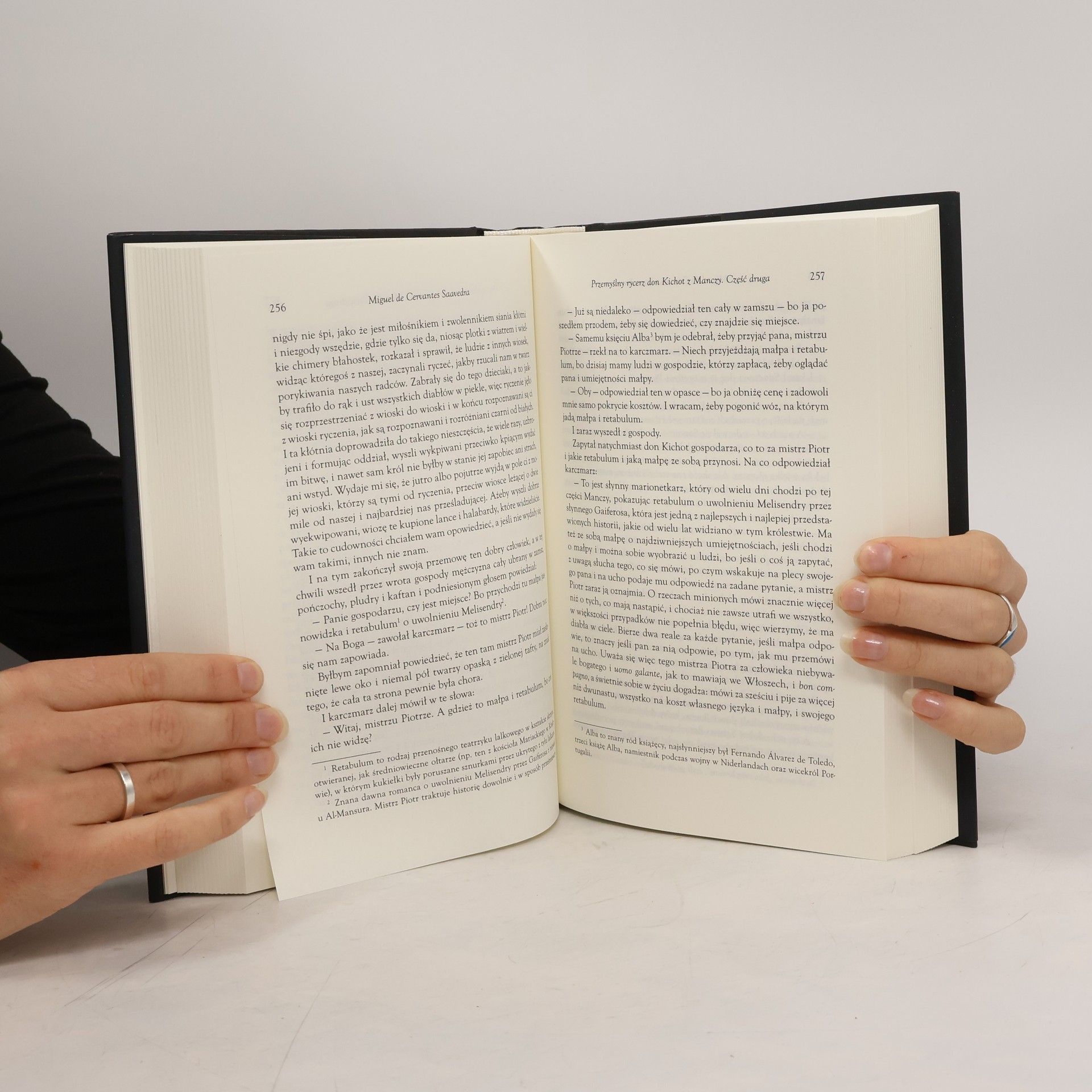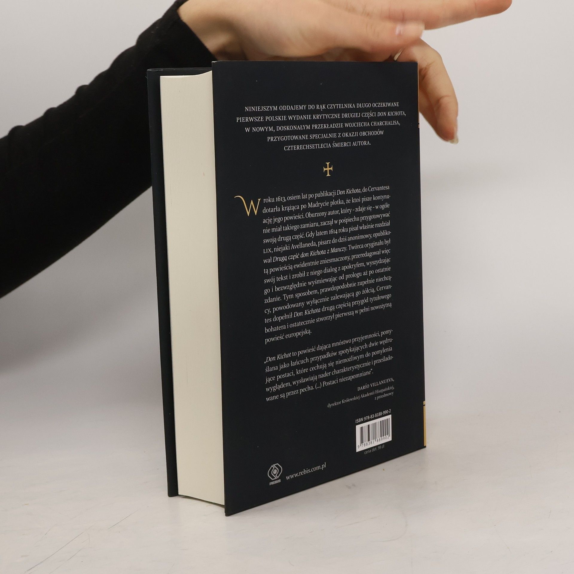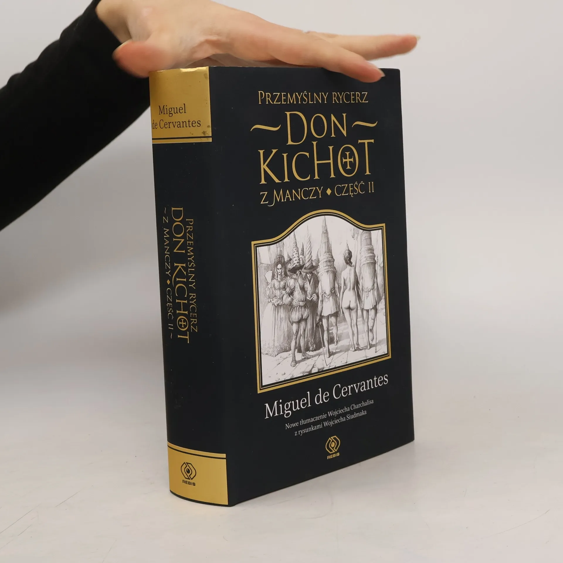 Niniejszym oddajemy do rąk czytelnika długo oczekiwane pierwsze polskie wydanie krytyczne drugiej części Don Kichota, w nowym, doskonałym przekładzie Wojciecha Charchalisa, przygotowane specjalnie z okazji obchodów czterechsetlecia śmierci autora. W roku 1613, osiem lat po publikacji Don Kichota, do Cervantesa dotarła krążąca po Madrycie plotka, że ktoś pisze kontynuację jego powieści. Oburzony autor, który, zdaje się, w ogóle nie miał takiego zamiaru, zaczął w pośpiechu przygotowywać swoją drugą część. Gdy latem 1614 pisał właśnie rozdział LIX, niejaki Avellaneda, pisarz do dziś pozostający anonimowy, opublikował Drugą część don Kichota z Manczy. Twórca oryginału był tą powieścią ewidentnie zniesmaczony, przeredagował więc swój tekst i zrobił z niego dialog z apokryfem, wyszydzając go i bezwzględnie wyśmiewając od prologu aż po ostatnie zdanie. Tym sposobem, prawdopodobnie zupełnie niechcący, powodowany wyłącznie zalewającą go żółcią, Cervantes dopełnił Don Kichota drugą częścią przygód tytułowego bohatera i ostatecznie stworzył pierwszą w pełni nowożytną powieść europejską. Choć wydaje się, że prawie każdy zna powieść Cervantesa i wielokrotnie widział don Kichota w dziełach wielkich artystów, jak Gustave Dor, Honor Daumier, Salvador Dali, Pablo Picasso i wielu innych, to z pewnością zaskoczą go rysunki i wizje Wojciecha Siudmaka. Jego dzieła nawiązują głębiej i śmielej do fantastycznych wizji Cervantesa i marzeń don Kichota. Tu, gdzie inni widzieli humorystyczne anegdoty, artysta odczytuje filozoficzne intencje autora. Don Kichot to powieść dająca mnóstwo przyjemności, pomyślana jako łańcuch przypadków spotykających dwie wędrujące postaci, które cechują się niemożliwym do pomylenia wyglądem, wysławiają nader charakterystycznie i prześladowane są przez pecha. (...) Postaci niezapomniane. - Daro Villanueva, dyrektor Królewskiej Akademii Hiszpańskiej, z przedmowy.
