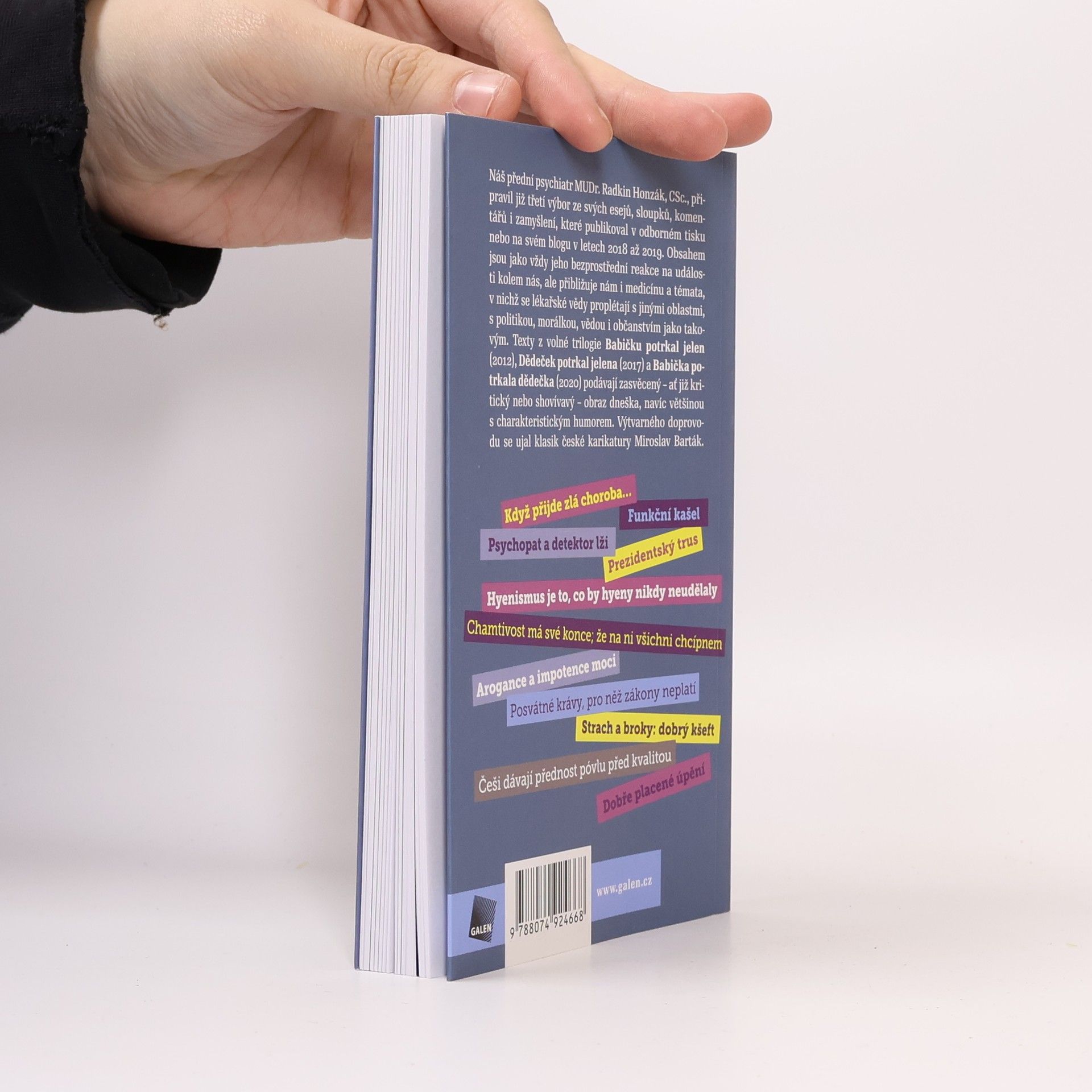 Náš přední psychiatr MUDr. Radkin Honzák, CSc. (* 1939), připravil již třetí výbor ze svých esejů, sloupků, komentářů i zamyšlení, které publikoval v odborných časopisech nebo na svém blogu v letech 2018 až 2019. Obsahem jsou jako vždy jeho bezprostřední reakce na události kolem nás, ale přibližuje nám i medicínu a témata, v nichž se lékařské vědy proplétají s jinými oblastmi, s politikou, morálkou, vědou i občanstvím jako takovým. Texty z volné trilogie Babičku potrkal jelen (2012), Dědeček potrkal jelena (2017) a Babička potrkala dědečka (2020) podávají zasvěcený – ať již kritický nebo shovívavý – obraz dnešní doby, navíc většinou s charakteristickým humorem. Výtvarného doprovodu se ujal klasik české karikatury Miroslav Barták.