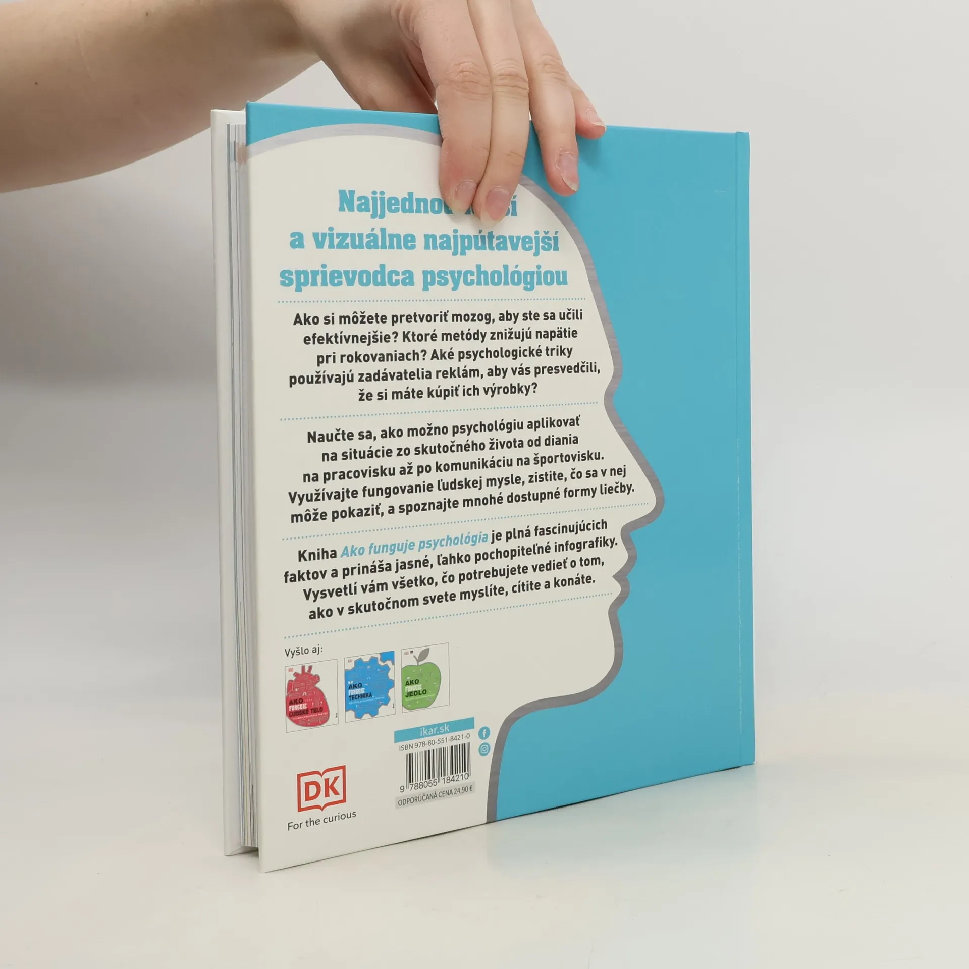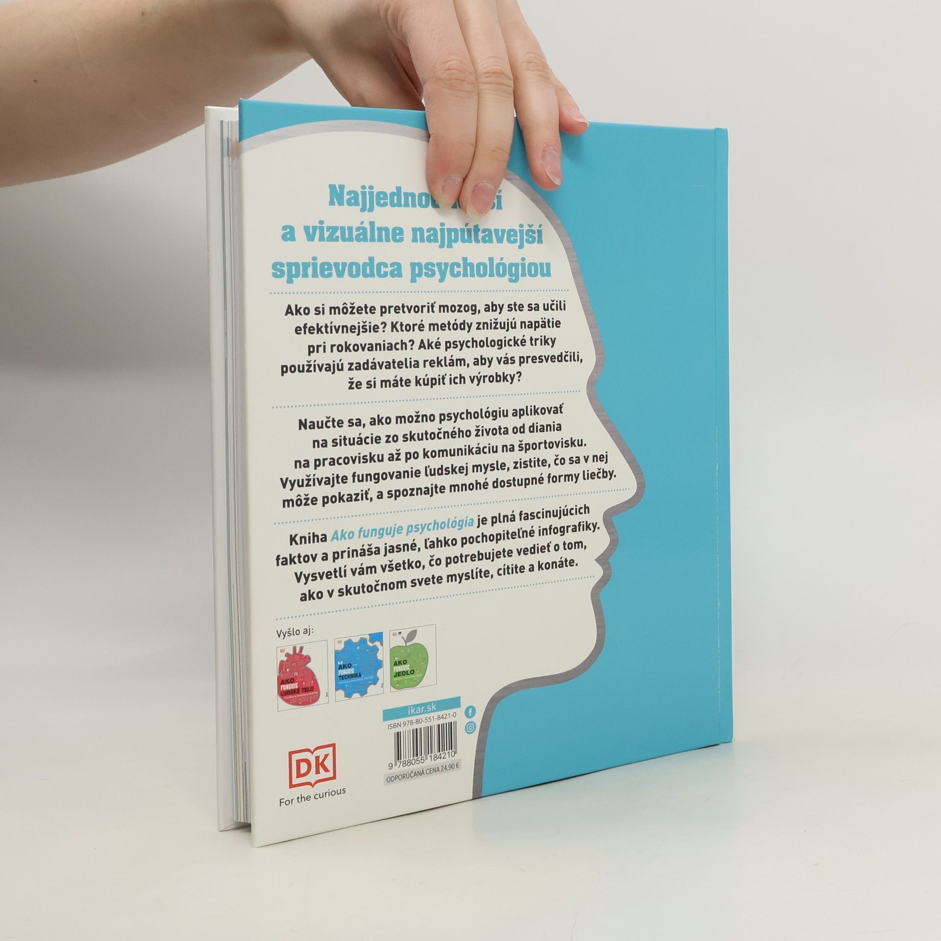 Najjednoduchší a vizuálne najpútavejší sprievodca psychológiou Ako si môžete pretvoriť mozog, aby ste sa učili efektívnejšie? Ktoré metódy znižujú napätie pri rokovaniach? Aké psychologické triky používajú zadávatelia reklám, aby vás presvedčili, že si máte kúpiť ich výrobky? Naučte sa, ako možno psychológiu aplikovať na situácie zo skutočného života od diania na pracovisku až po komunikáciu na športovisku. Využívajte fungovanie ľudskej mysle, zistite, čo sa v nej môže pokaziť, a spoznajte mnohé dostupné formy liečby. Kniha Ako funguje psychológia je plná fascinujúcich faktov a prináša jasné, ľahko pochopiteľné grafické údaje. Vysvetlí vám všetko, čo potrebujete vedieť o tom, ako v skutočnom svete myslíte, cítite a konáte. V publikácii sú vedecké poznatky doplnené užitočnými názornými ilustráciami a infografikami. Z anglického originálu preložil Róbert Hrebíček.