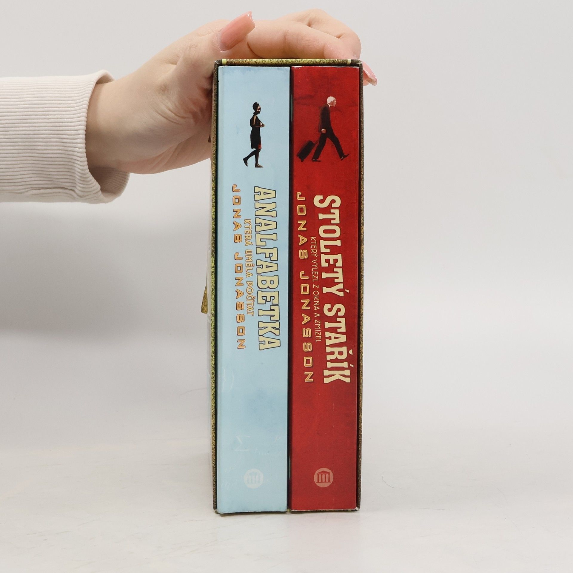 Dárkové balení kultovního knižního hitu posledních let a nejoblíbenějšího románu roku 2014 v České republice. Stoletý stařík, který vylezl z okna a zmizel Allan Karlsson má narozeniny. Je mu sto let. Vlastně důvod k oslavě. Starosta i místní tisk se připravují na velkolepou oslavu, stoletý stařík má však docela jiné plány; jednoduše zmizí - a brzy je celé Švédsko kvůli jeho útěku vzhůru nohama. Jenže s podobnými věcmi už má Allan své zkušenosti - v mládí koneckonců uvedl do zmatku celý svět. Jonas Jonasson ve svém románu vypráví o jednom veselém útěku a také o šíleném životním příběhu svéhlavého muže, který se sice nikdy nezajímal o politiku, ale přesto byl vždy nějak zapleten do velkých historických událostí 20. století. Analfabetka, která uměla počítat Nombeko začala pracovat v pěti letech jako vynašečka latrín na předměstí Johannesburgu, v deseti letech osiřela. Nic nenasvědčovalo tomu, že by neměla prožít svůj život v jedné z chatrčí největší chudinské čtvrti světa a pak tu předčasně umřít, nikým nepostrádaná. To by ale nebyla Nombeko - analfabetka, která uměla počítat. Osud i její talent ji zavedou až do mezinárodní politiky, na druhou stranu zeměkoule, ke dvěma identickým a zároveň velmi odlišným bratrům. Během jejího dobrodružného putování se jí podaří zamotat hlavu agentům nejobávanější tajné služby nebo být unesená ve špinavém náklaďáku na převoz brambor. A tím to zdaleka nekončí...