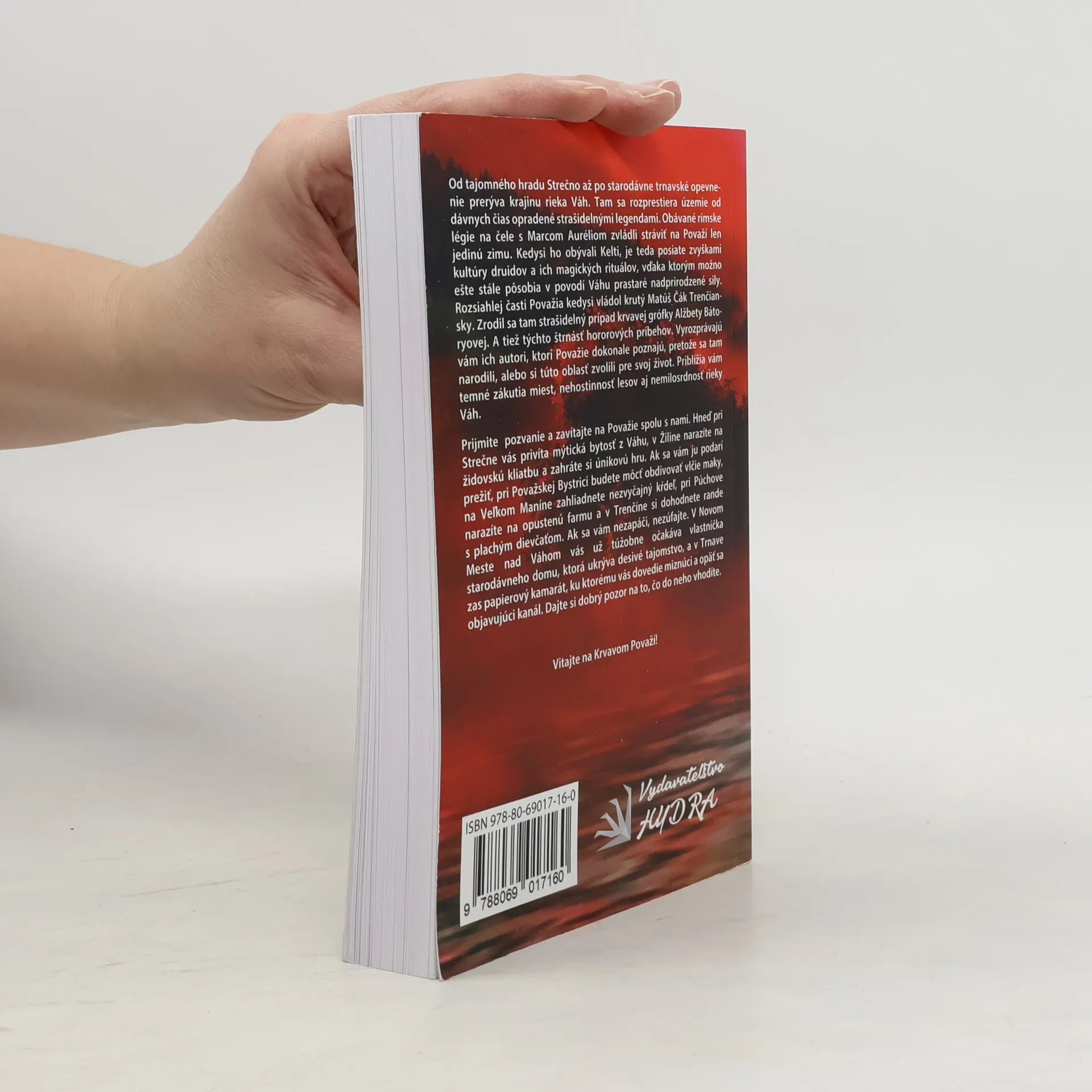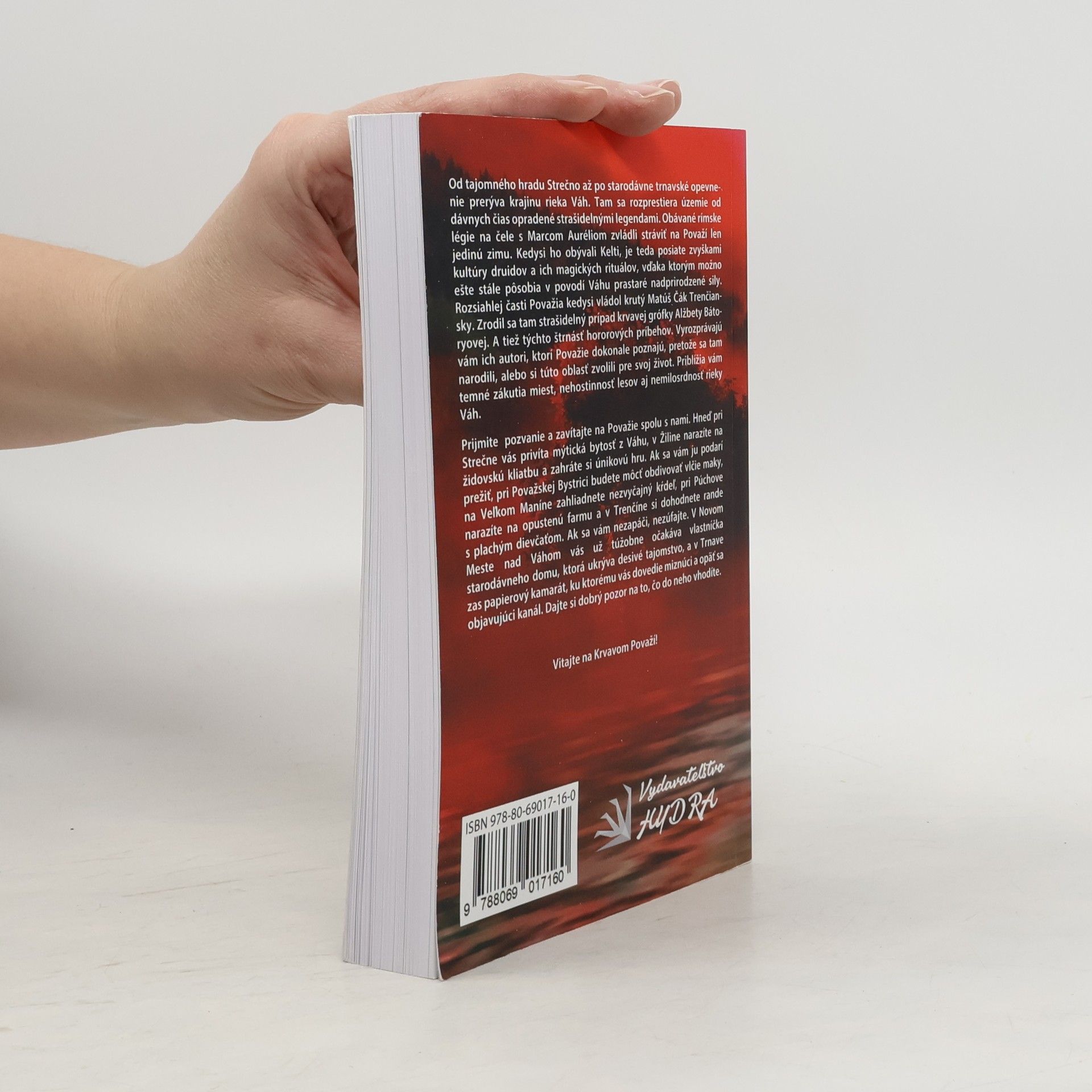 Od tajomného hradu Strečno až po starodávne trnavské opevnenie prerýva krajinu rieka Váh. Tam sa rozprestiera územie od dávnych čias opradené strašidelnými legendami. Obávané rímske légie na čele s Marcom Auréliom zvládli stráviť na Považí len jedinú zimu. Kedysi ho obývali Kelti, je teda posiate zvyškami kultúry druidov a ich magických rituálov, vďaka ktorým možno ešte stále pôsobia v povodí Váhu prastaré nadprirodzené sily. Rozsiahlej časti Považia kedysi vládol krutý Matúš Čák Trenčiansky. Zrodil sa tam strašidelný prípad krvavej grófky Alžbety Bátoryovej. A tiež týchto štrnásť hororových príbehov. Vyrozprávajú vám ich autori, ktorí Považie dokonale poznajú, pretože sa tam narodili, alebo si túto oblasť zvolili pre svoj život. Priblížia vám temné zákutia miest, nehostinnosť lesov aj nemilosrdnosť rieky Váh. Prijmite pozvanie a zavítajte na Považie spolu s nami. Hneď pri Strečne vás privíta mýtická bytosť z Váhu, v Žiline narazíte na židovskú kliatbu a zahráte si únikovú hru. Ak sa vám ju podarí prežiť, pri Považskej Bystrici budete môcť obdivovať vlčie maky, na Veľkom Maníne zahliadnete nezvyčajný kŕdeľ, pri Púchove narazíte na opustenú farmu a v Trenčíne si dohodnete rande s plachým dievčaťom. Ak sa vám nezapáči, nezúfajte. V Novom Meste nad Váhom vás už túžobne očakáva vlastníčka starodávneho domu, ktorá ukrýva desivé tajomstvo, a v Trnave zas papierový kamarát, ku ktorému vás dovedie miznúci a opäť sa objavujúci kanál. Dajte si dobrý pozor na to, čo do neho vhodíte. Vitajte na Krvavom Považí!