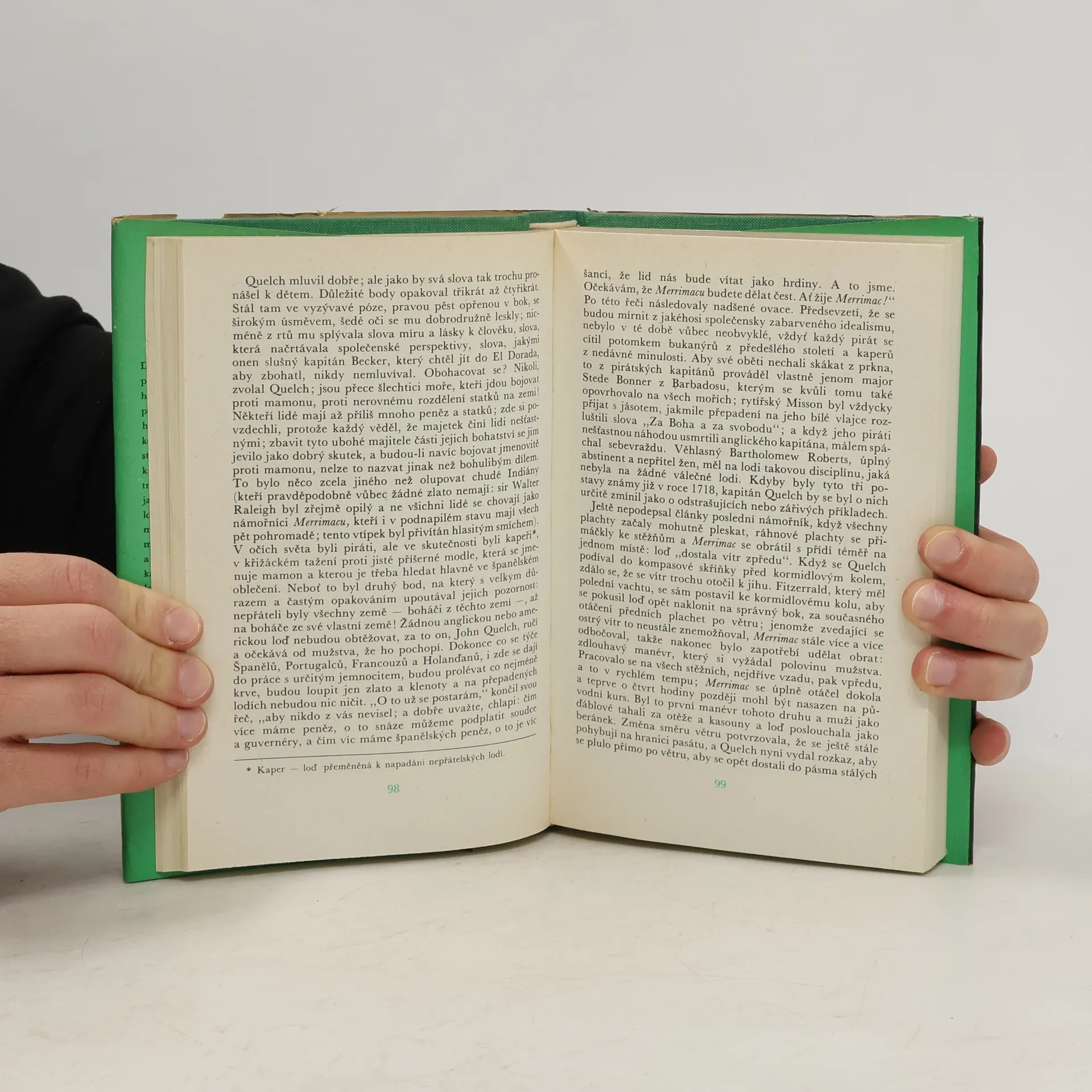Na historickém pozadí překotného rozvoje anglických kolonií v Novém světě v první polovině 18. století a zejména Bostonu rozvíjí autor příběh plachetnice Merrimac postavené jako dopravní loď trojicí puritánských obchodníků, určené ale od prvopočátku k poněkud méně bohulibým účelům, jako je přeprava zboží, nýbrž k provozování pirátské profese. Takže se nám začíná děj měnit na čistokrevnou pirátskou knihu se všemi atributy dobrodružného románu, sdílíme s posádkou strasti drsného života na moři, zmítáme se s Merrimac v bouřlivých vlnách, nechybí ani krásná intrikánka – herečka Arabella – v roli nečekaného pasažéra. Najednou si ale uvědomíme, že si z nás autor trochu střílí, že svého vynikajícího vypravěčského talentu užil nejen k tomu, aby nás seznámil s životem lidí na moři, ale aby vytvořil dokonalou satiru, ne-li přímo parodii na romány s pirátskou tématikou. Tou dobou vás už ale charakteristiky postav a děj knihy natolik zaujmou, že ji dočtete, aby jste věděli, jak to všechno vlastně dopadlo.