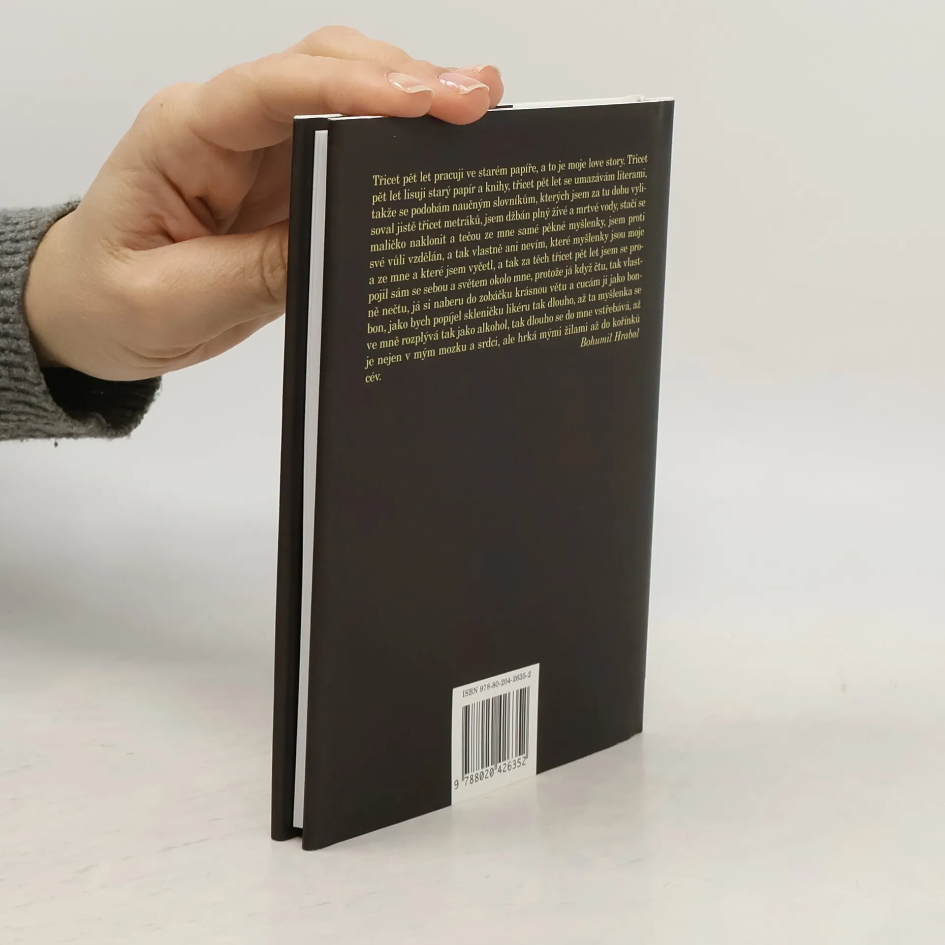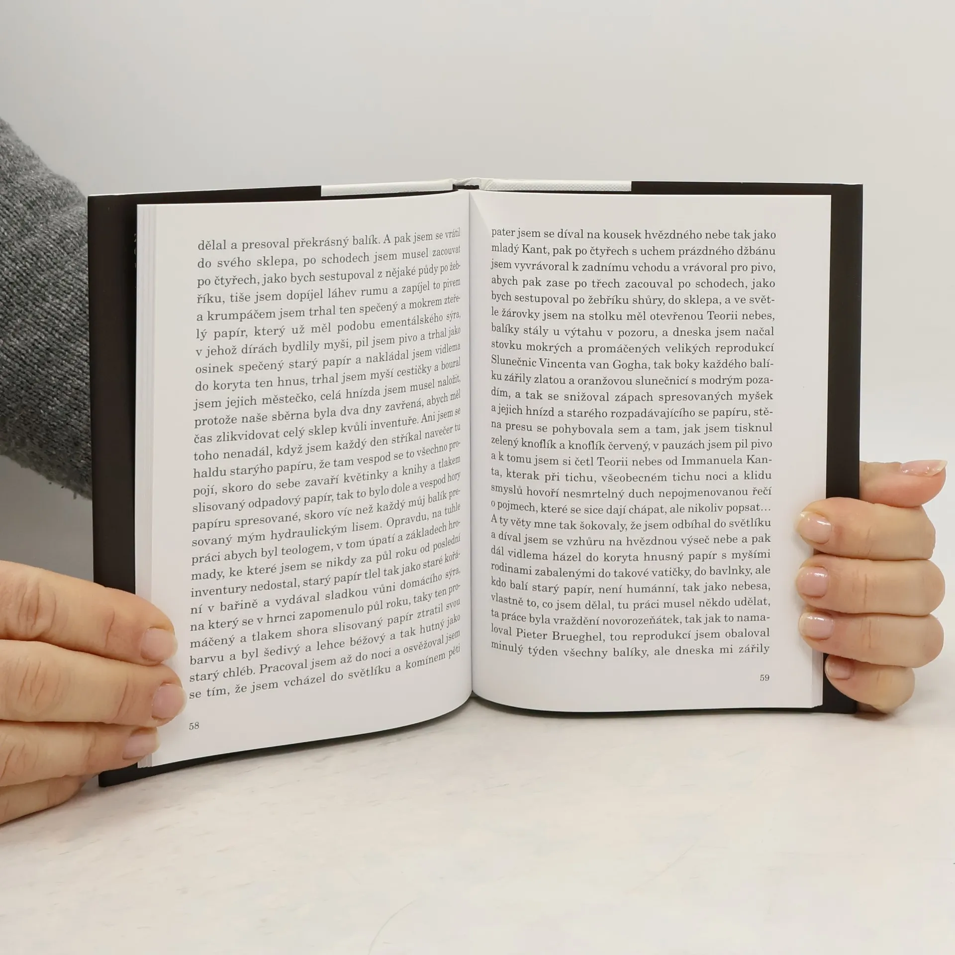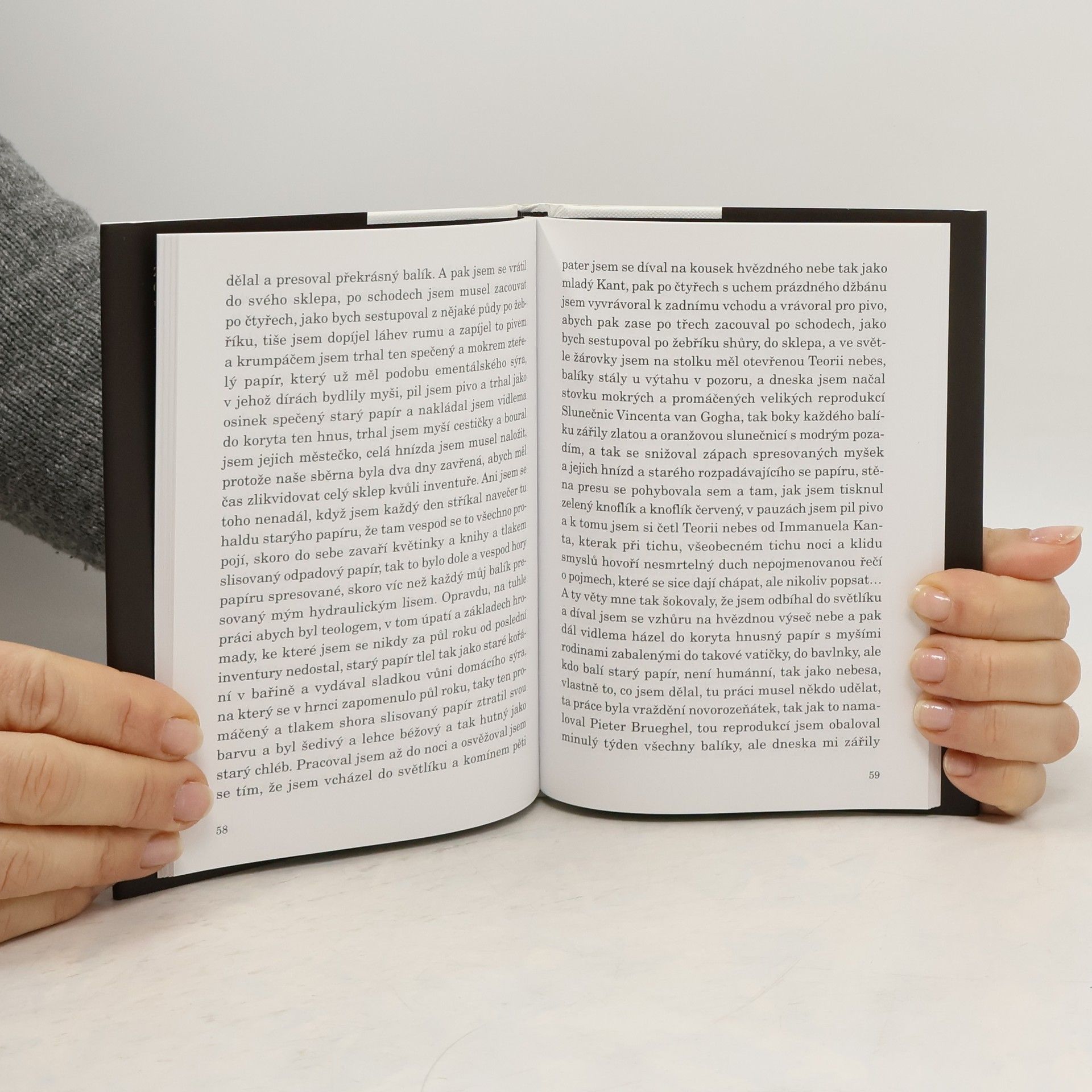 Dělník ve sběrně starého papíru Haňťa pracuje pětatřicet let ve sklepení sběrny u stařičkého lisu. Z hromad starého papíru zachraňuje vzácné knihy a shromažďuje je ve svém pokojíku, čte si v nich a tak je „proti své vůli vzdělán“. Celá novela je vlastně vnitřní Haňťův monolog, psaný sonátovou formou se spoustou stále se vracejících motivů. Čtenář se seznámí s Haňťovou první láskou Mančinkou i cikánkou Ilonkou, která zmizela v koncentračním táboře. Je svědkem každodenního zápasu s horami papíru i s nekonečnými džbány piva, vyslyší Haňťovy citace filozofů i jeho sny o důchodu, do kterého si odvede i vysloužilý mechanický lis.