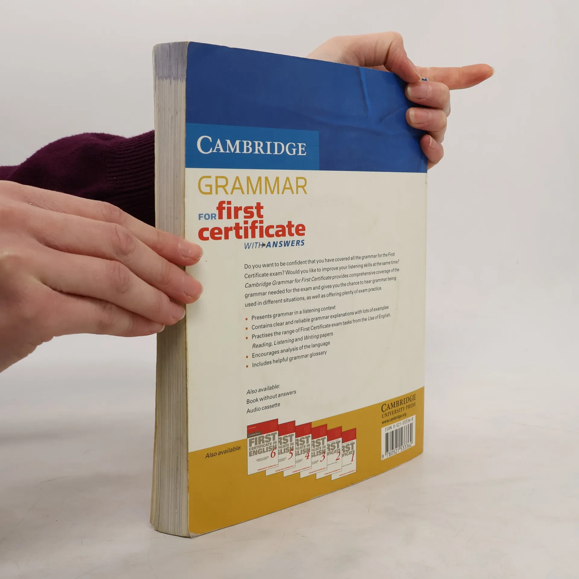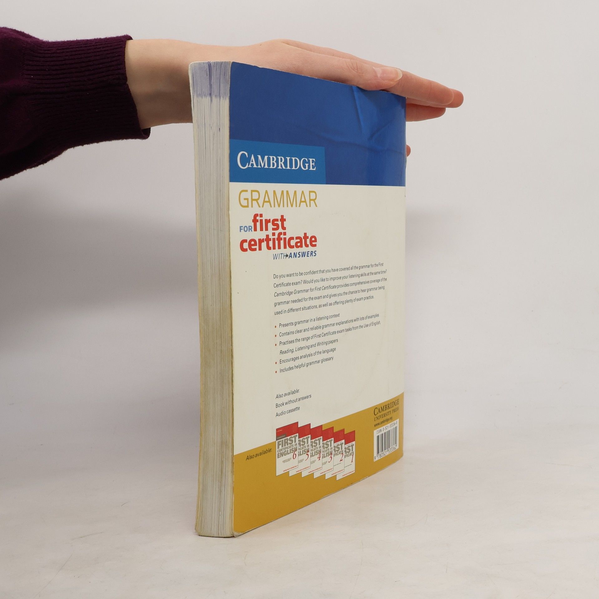 Cambridge Grammar for First Certificate provides complete coverage of the grammar needed for the Cambridge FCE exam, and develops listening skills at the same time. It includes the full range of FCE exam tasks from the Reading, Writing, Listening, and Use of English papers, and contains helpful grammar explanations and a grammar glossary. An edition 'without answers' is also available.