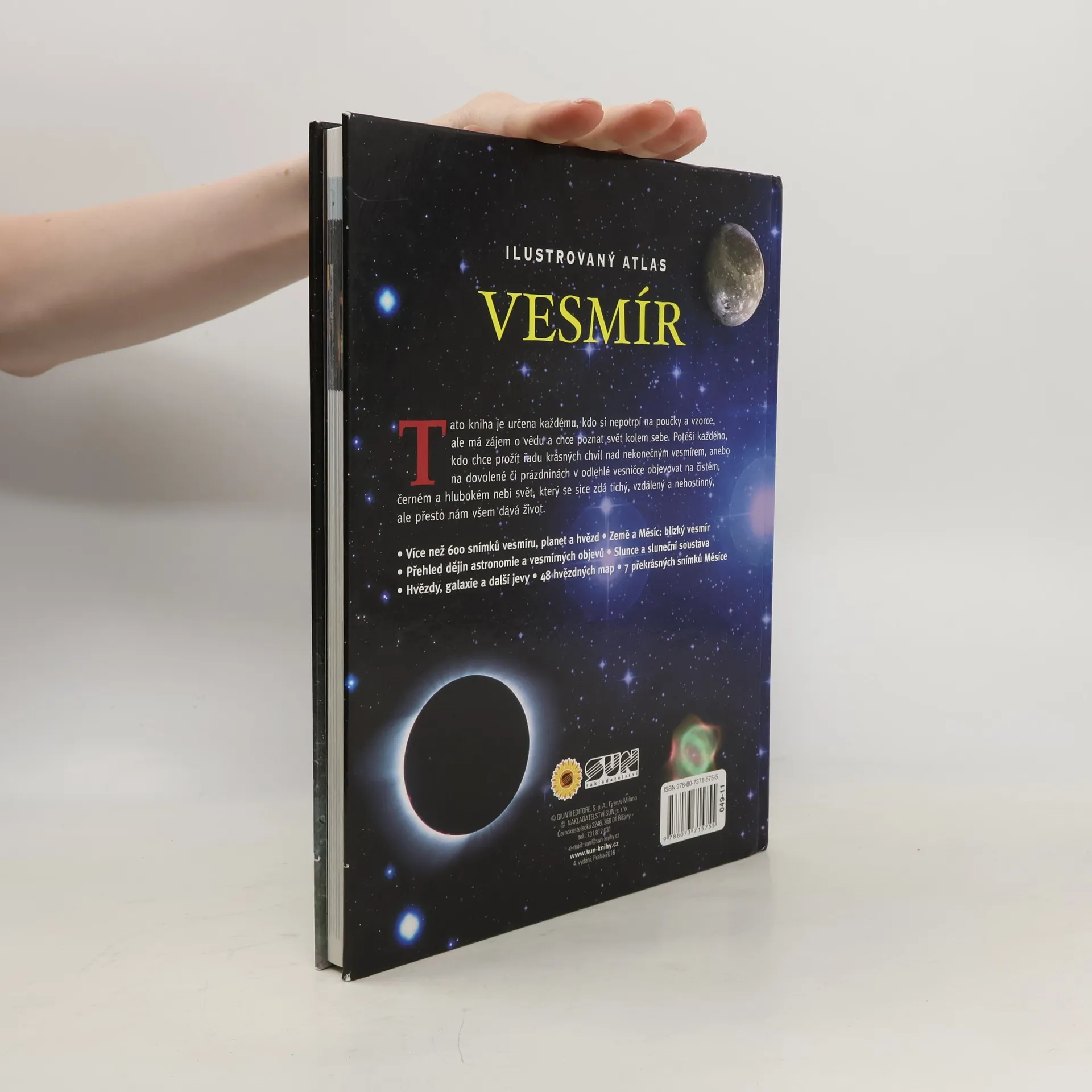 Tato kniha je určena každému, kdo si nepotrpí na poučky a vzorce, ale má zájem o vědu a chce poznat svět kolem sebe. Více než 600 snímků vesmíru, planet a hvězd Země a Měscíe - blízký vesmír. Přehled dějin astronomie a vesmírných objevů, Slunce a sluneční soustava, Hvězdy, galaxie a další jevy, 48 hvězdných map, 7 překrásných snímků Měsíce.