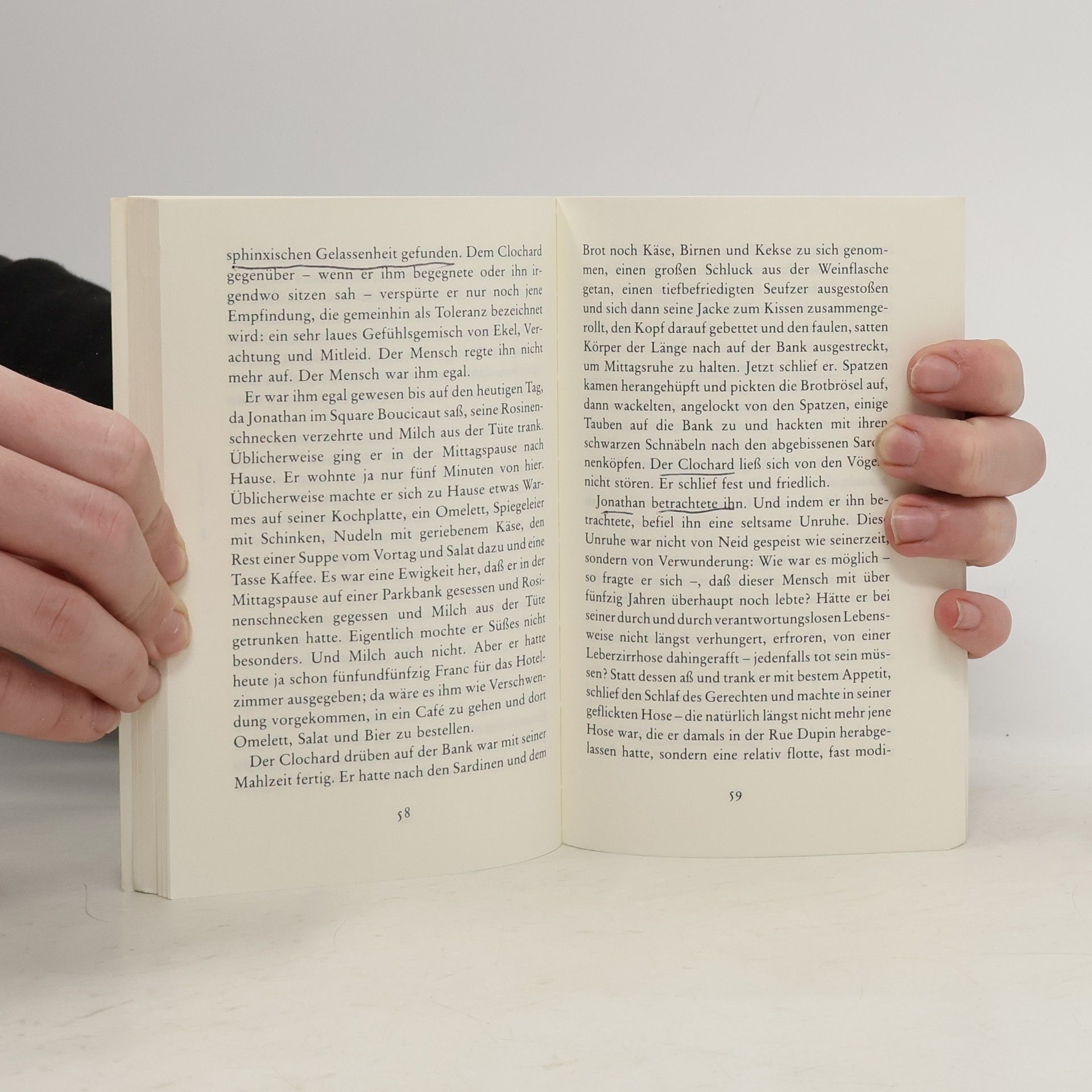 In fünf Monaten wird der Wachmann einer Pariser Bank, der als einzigen Nutzen seiner Tätigkeit das Öffnen des Tores vor dem Direktionswagen erkannt hat, das Eigentum an seiner kleinen Mansarde endgültig erworben haben, wird ein weiterer Markstein seines Lebensplanes gesetzt sein. Doch dieser fatalistische Ablauf wird an einem heißen Freitagmorgen im August 1984 jäh vom Erscheinen einer Taube in Frage gestellt."