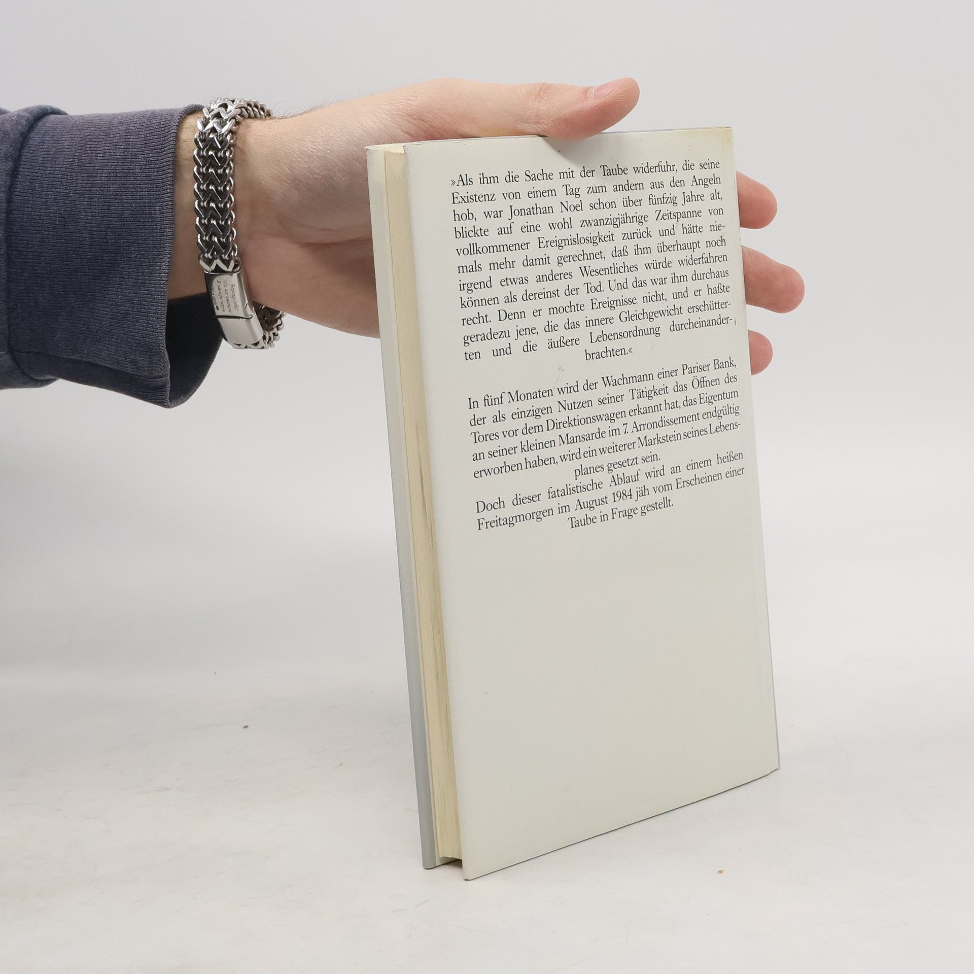 In fünf Monaten wird der Wachmann einer Pariser Bank, der als einzigen Nutzen seiner Tätigkeit das Öffnen des Tores vor dem Direktionswagen erkannt hat, das Eigentum an seiner kleinen Mansarde endgültig erworben haben, wird ein weiterer Markstein seines Lebensplanes gesetzt sein. Doch dieser fatalistische Ablauf wird an einem heißen Freitagmorgen im August 1984 jäh vom Erscheinen einer Taube in Frage gestellt.