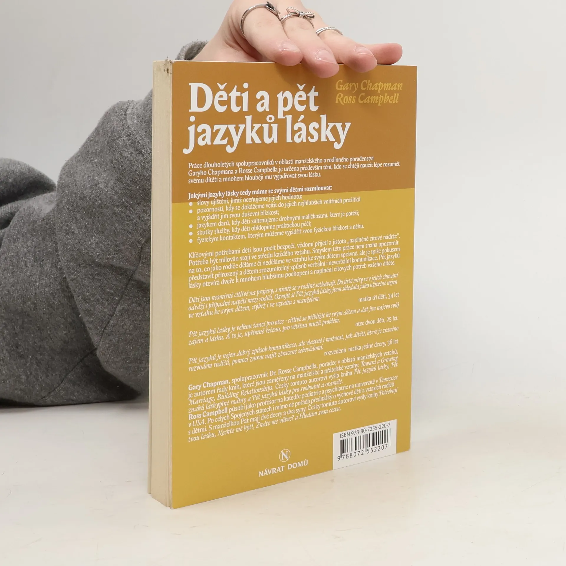 Naučte se hovořit jazykem lásky svých dětí / Práce dlouholetých spolupracovníků v oblasti manželského a rodinného poradenství G. Chapmana a R. Campbella je určena především těm, kdo se chtějí naučit lépe rozumět svému dítěti a mnohem hlouběji mu vyjadřovat svou lásku. Jakými jazyky tedy máme se svými dětmi rozmlouvat: * slovy ujištění, jimiž oceňujeme jejich hodnotu * pozorností, kdy se dokážeme vcítit do jejich nejhlubších vnitřních požitků a vyjádřit jim svou duševní blízkost * jazykem darů, kdy děti zahrnujeme drobnými maličkostmi, které je potěší * skutky služby, kdy děti obklopíme praktickou péčí * fyzickým kontaktem, kterým můžeme vyjádřit svou fyzikou blízkost a něhu