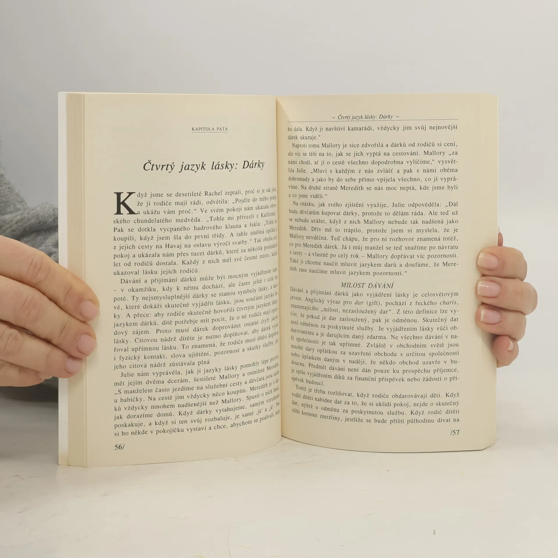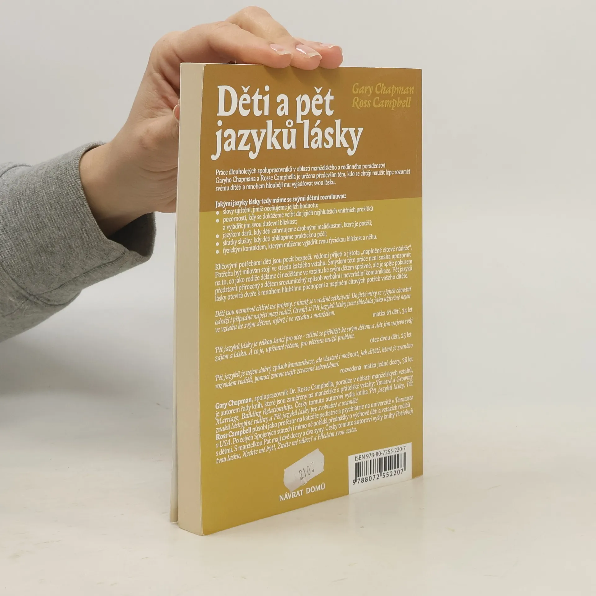 Naučte se hovořit jazykem lásky svých dětí / Práce dlouholetých spolupracovníků v oblasti manželského a rodinného poradenství G. Chapmana a R. Campbella je určena především těm, kdo se chtějí naučit lépe rozumět svému dítěti a mnohem hlouběji mu vyjadřovat svou lásku. Jakými jazyky tedy máme se svými dětmi rozmlouvat: * slovy ujištění, jimiž oceňujeme jejich hodnotu * pozorností, kdy se dokážeme vcítit do jejich nejhlubších vnitřních požitků a vyjádřit jim svou duševní blízkost * jazykem darů, kdy děti zahrnujeme drobnými maličkostmi, které je potěší * skutky služby, kdy děti obklopíme praktickou péčí * fyzickým kontaktem, kterým můžeme vyjádřit svou fyzikou blízkost a něhu
